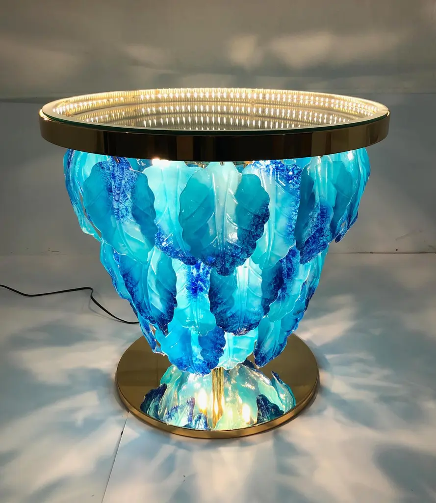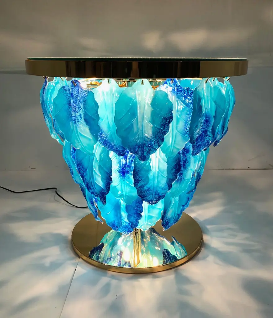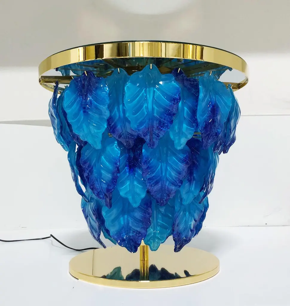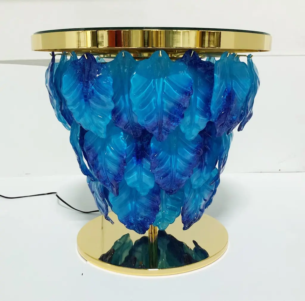 Modern Italian illuminated table with infinity lit mirror, dressed with blue and aquamarine Murano glass leaves mounted on 24K gold plated metal base / Designed by Fabio Bergomi for Fabio Ltd / Made in ItalyLED light strip plus 12 sockets G9 type max 40W eachDiameter: 27.5 inches / Height: 25.5 inchesOrder only / This item ships from ItalyOrder reference #: FABIOLTD L172 BLUE