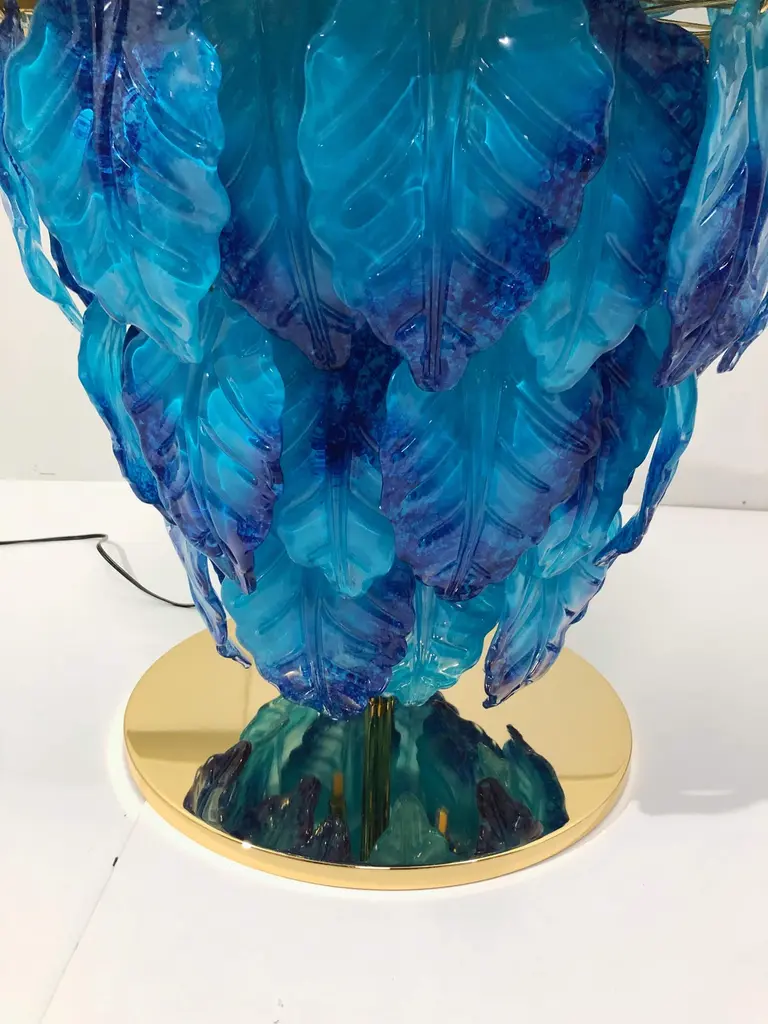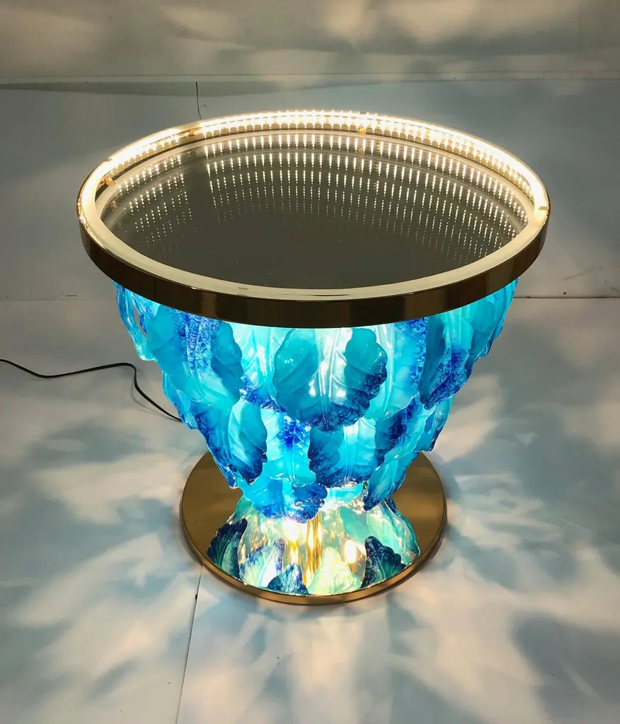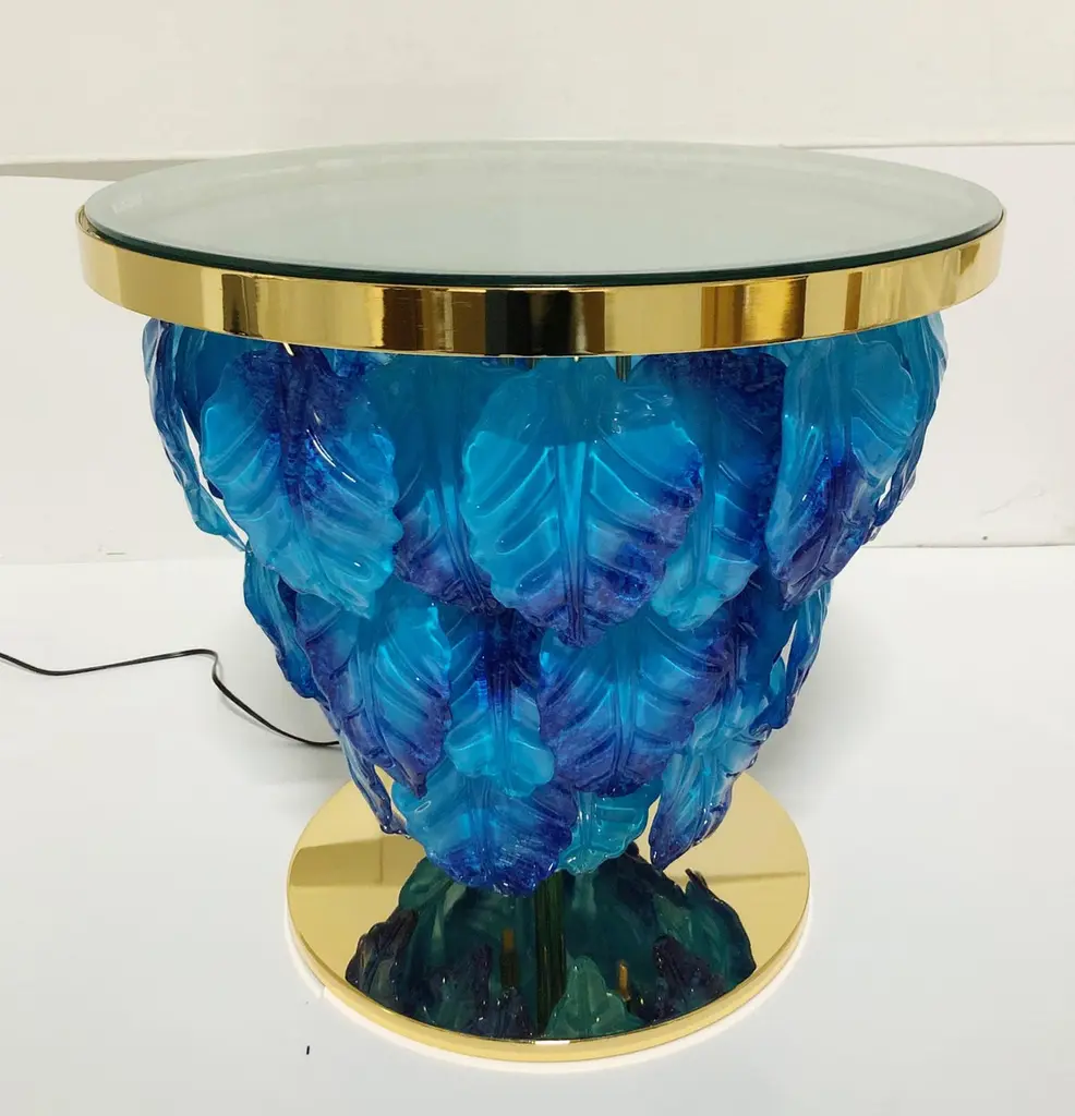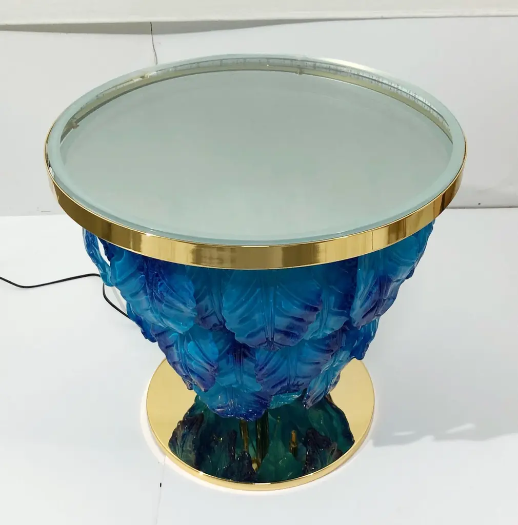 Modern Italian illuminated table with infinity lit mirror, dressed with blue and aquamarine Murano glass leaves mounted on 24K gold plated metal base / Designed by Fabio Bergomi for Fabio Ltd / Made in ItalyLED light strip plus 12 sockets G9 type max 40W eachDiameter: 27.5 inches / Height: 25.5 inchesOrder only / This item ships from ItalyOrder reference #: FABIOLTD L172 BLUE