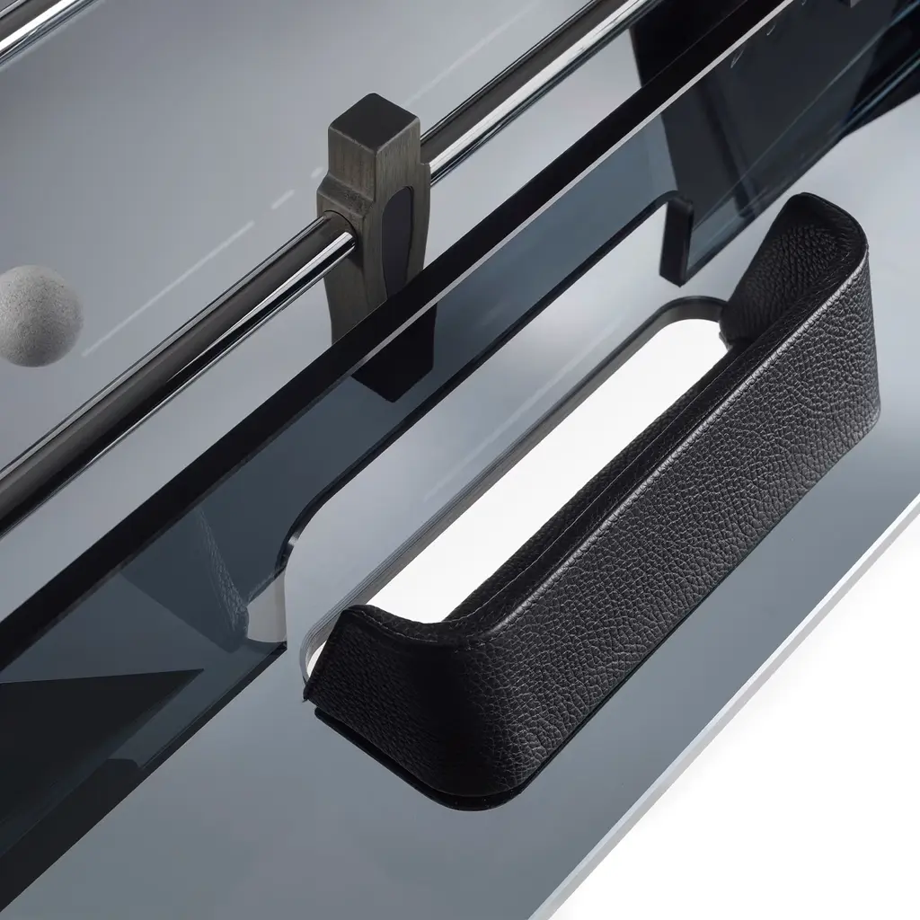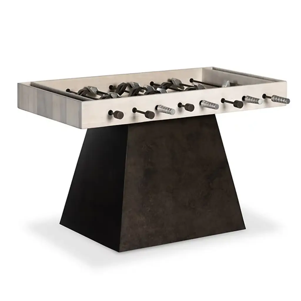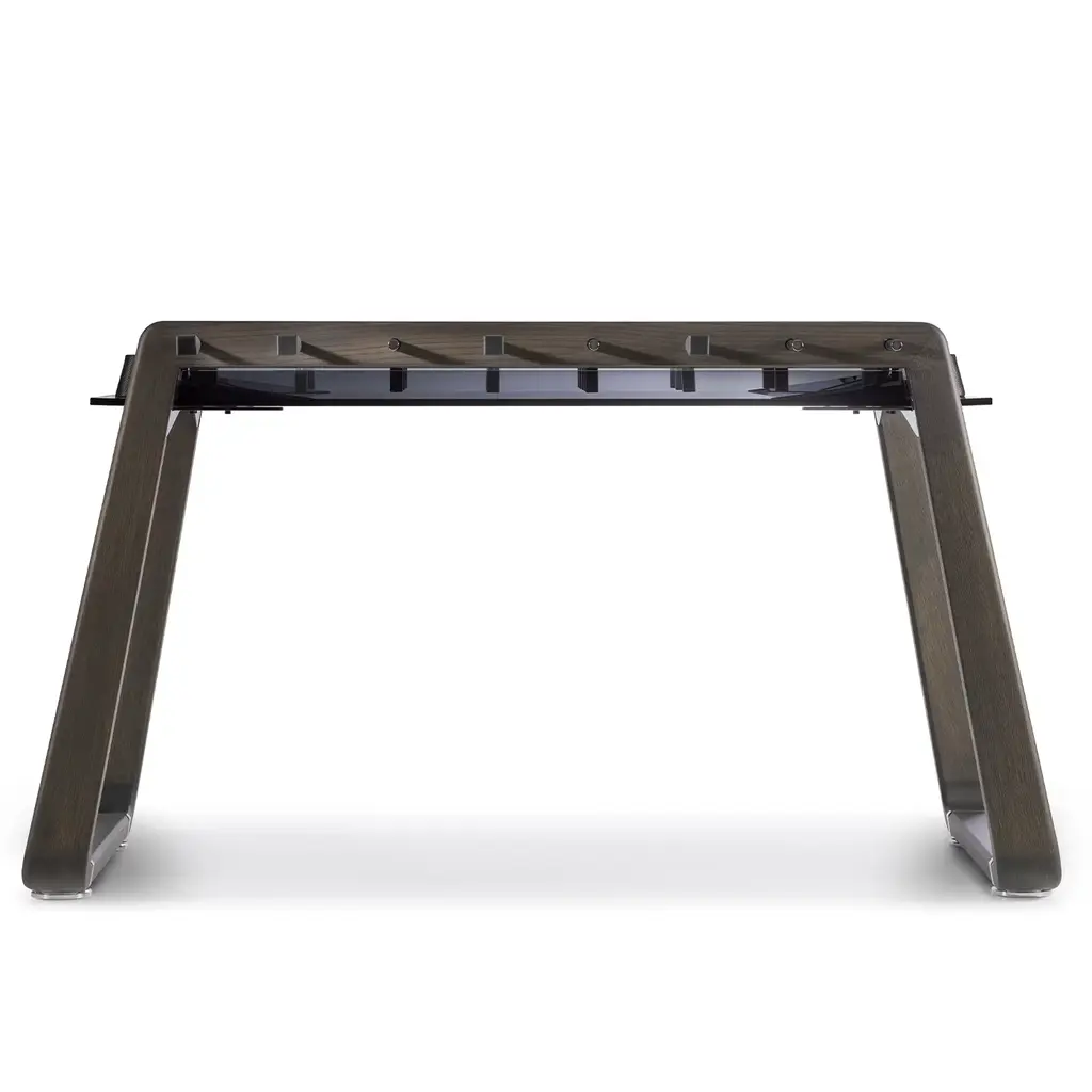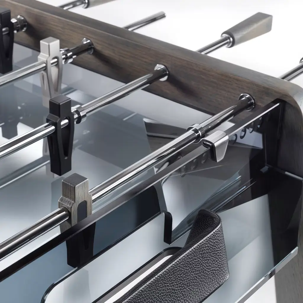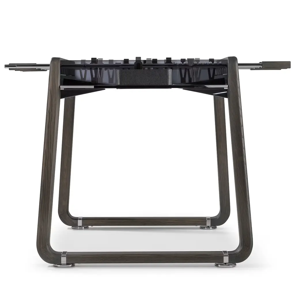The perfect blend between Italian traditional artisanship and contemporary innovation, this spectacular foosball table will add an accent of refinement to a minimalist interior. Mounted on a solid durmast wood structure lacquered in a dark shade and enhanced with metal details, its distinctive feature is the smokey glass surface elevating its refined aesthetic.
