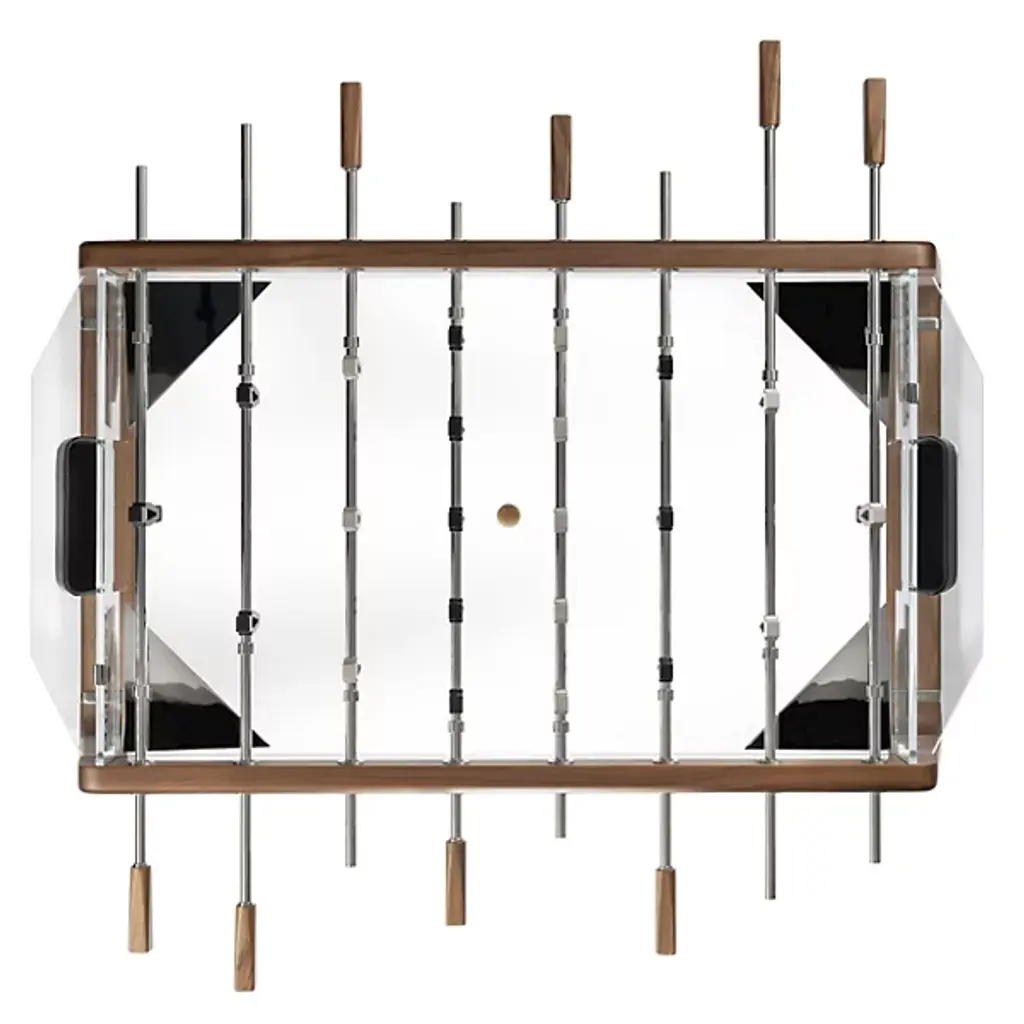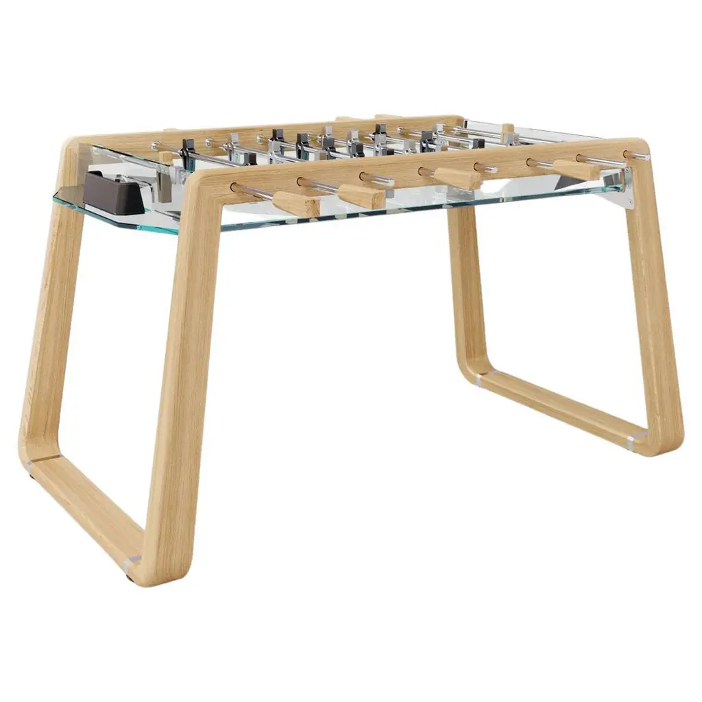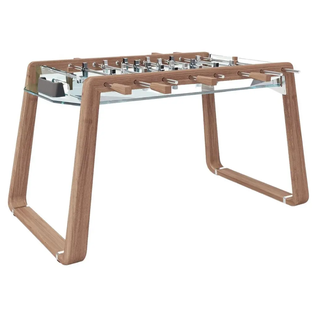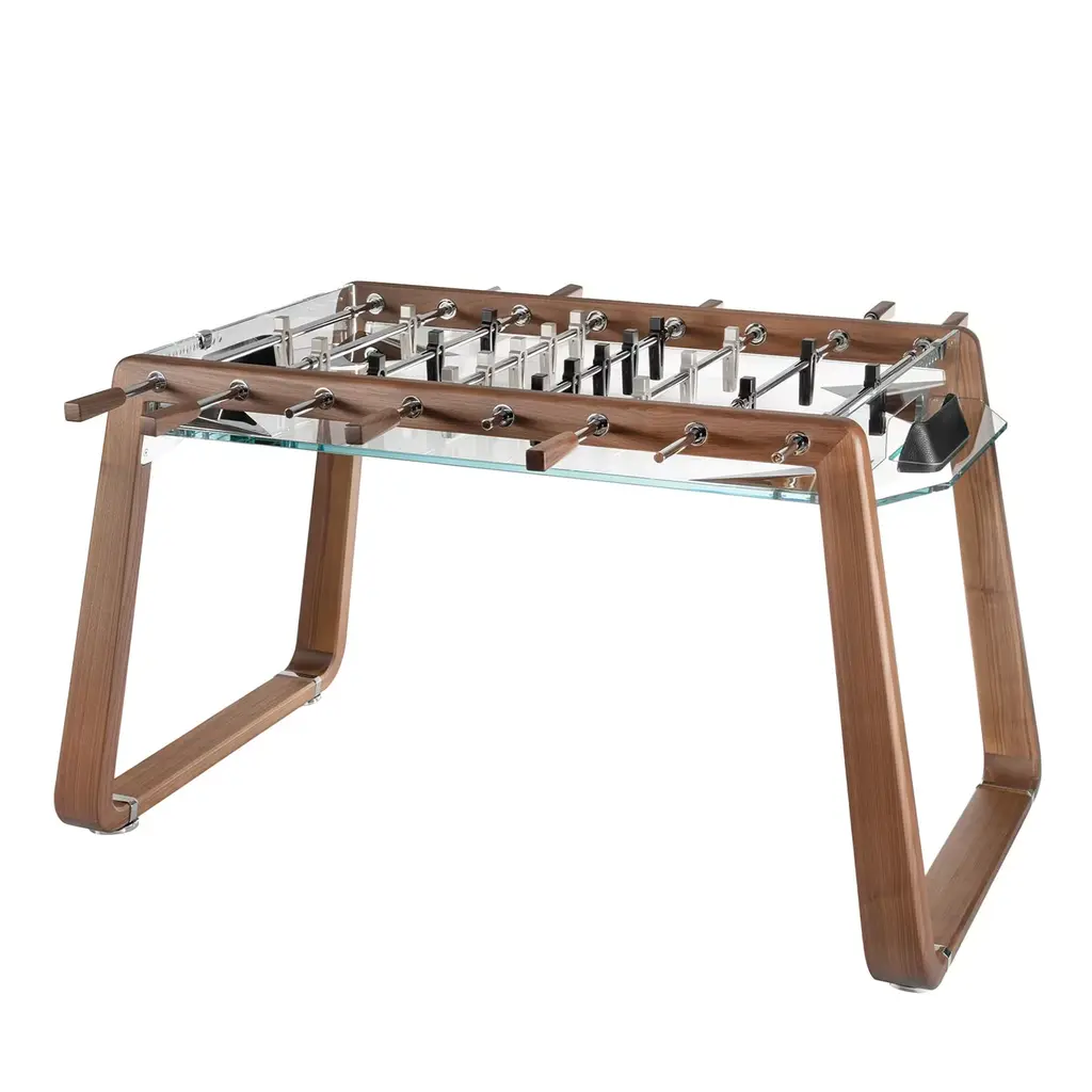 Elegant, airy, and charmingly retro in construction with clean contemporary lines, the Derby Foosball Table from Impatia offers its surroundings a signature grace and playful nature. A swooping contemporary creation designed by Impatia R&D, its visionary design is dedicated to the city of Milano in Italy, a salute to the game of football that is a civic institution, while contract-grade toughness offers ample durability. This tabletop game of foosball is at once serious and playful, swooping up from a rounded wood frame with the grain on display and showing off the finest standards of Italian artisan craftsmanship. Shiny metal bands embossed with the Impatia name offer a contrast with the wood around it, contrasting sleek metal with natural wood. Seamlessly rotating rods thrust through small collars, each moved by a faceted wood handle, command a rank of subtly sculptural, stylized foosball player forms, appearing to hover above a slick, translucent glass playing field that offers a welcome touch of visual lightness to the unforgettable, sculptural form.