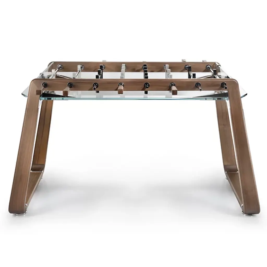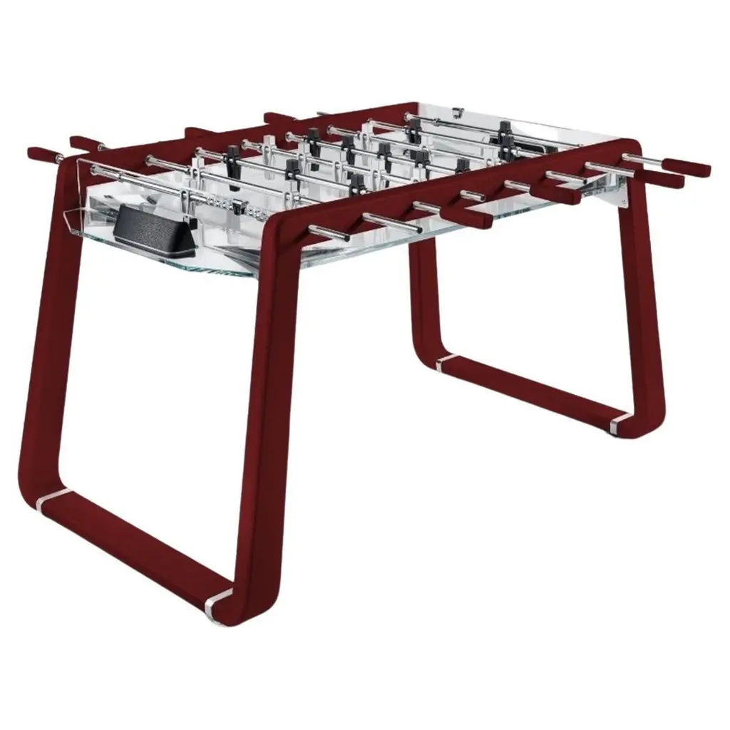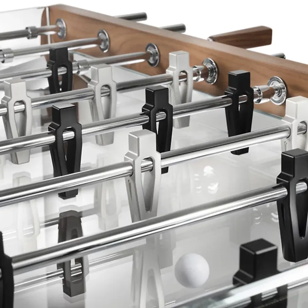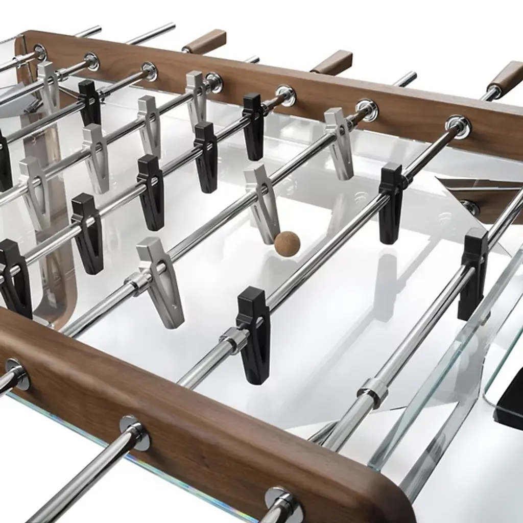 Elegant, airy, and charmingly retro in construction with clean contemporary lines, the Derby Foosball Table from Impatia offers its surroundings a signature grace and playful nature. A swooping contemporary creation designed by Impatia R&D, its visionary design is dedicated to the city of Milano in Italy, a salute to the game of football that is a civic institution, while contract-grade toughness offers ample durability. This tabletop game of foosball is at once serious and playful, swooping up from a rounded wood frame with the grain on display and showing off the finest standards of Italian artisan craftsmanship. Shiny metal bands embossed with the Impatia name offer a contrast with the wood around it, contrasting sleek metal with natural wood. Seamlessly rotating rods thrust through small collars, each moved by a faceted wood handle, command a rank of subtly sculptural, stylized foosball player forms, appearing to hover above a slick, translucent glass playing field that offers a welcome touch of visual lightness to the unforgettable, sculptural form.