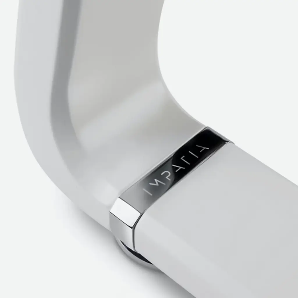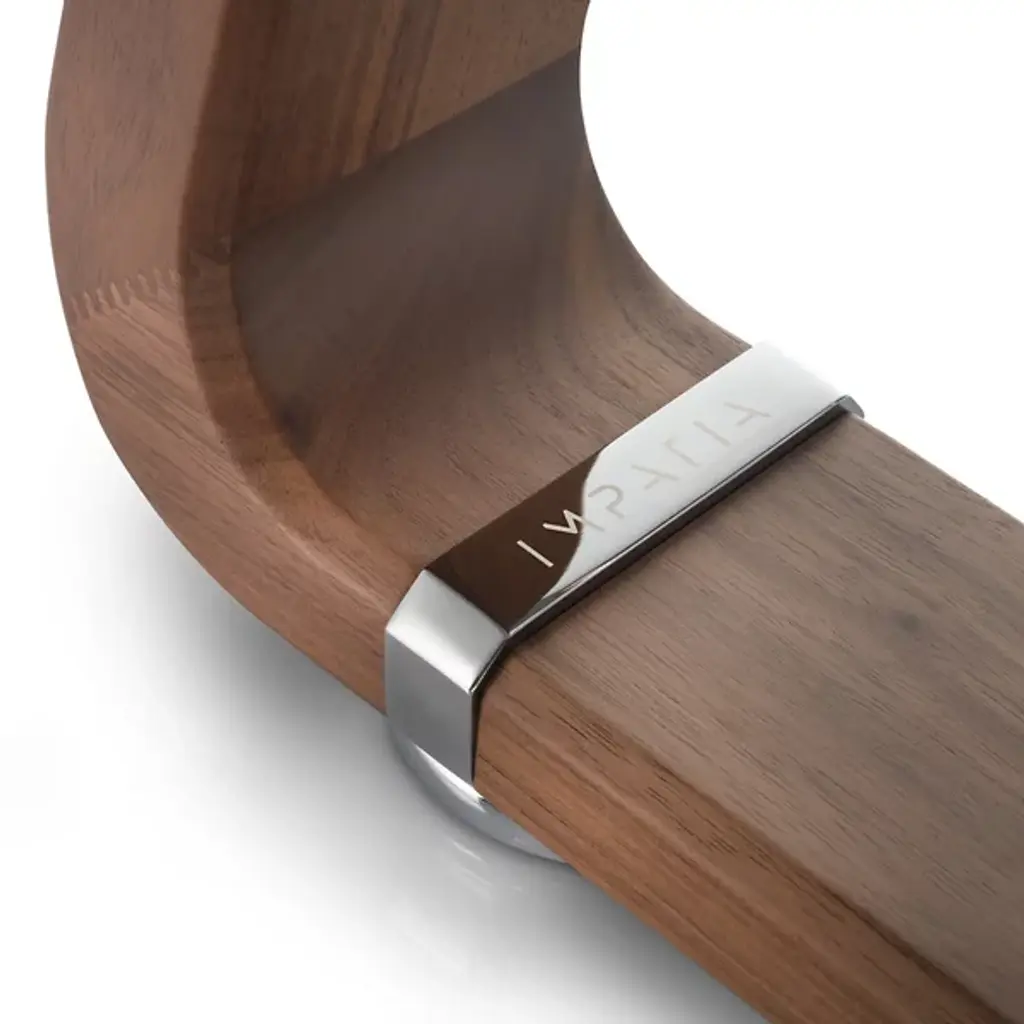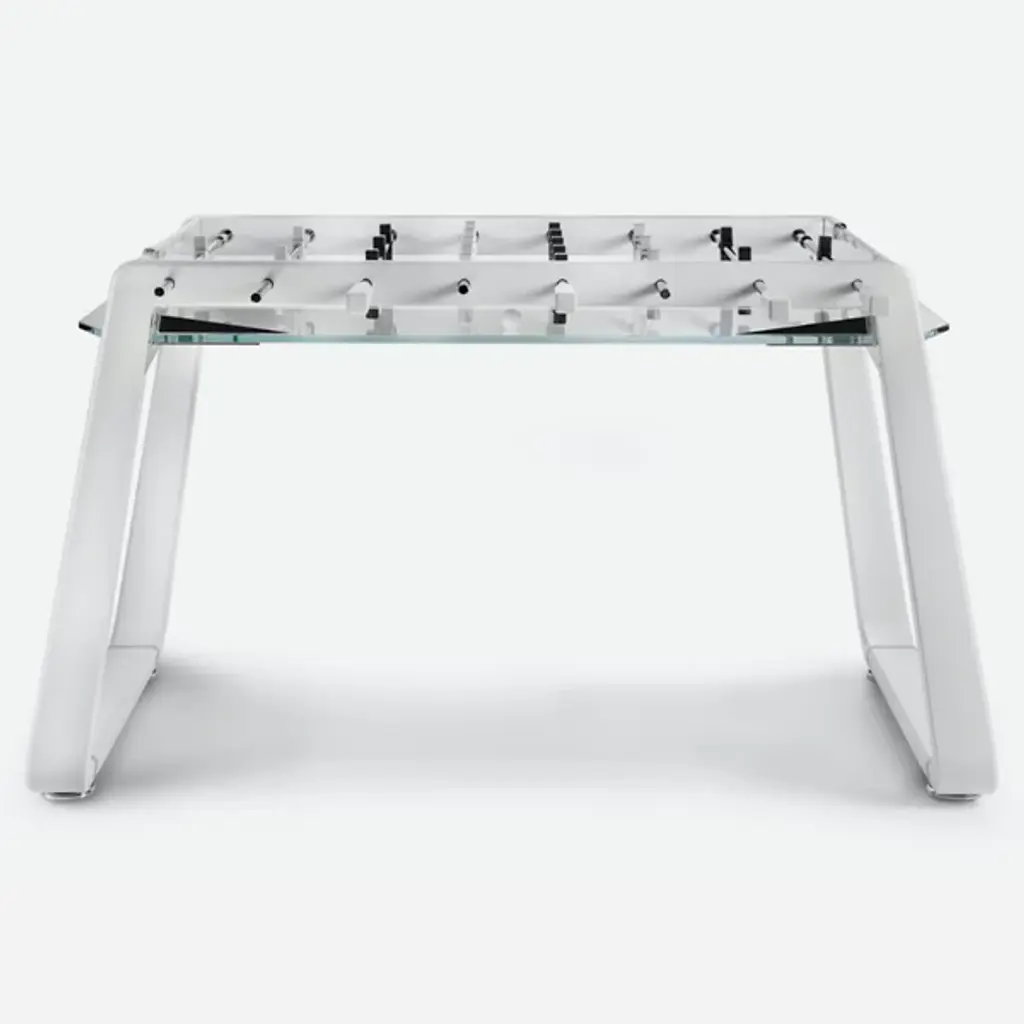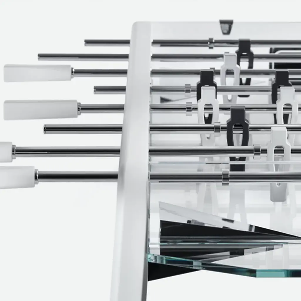 Elegant, airy, and charmingly retro in construction with clean contemporary lines, the Derby Foosball Table from Impatia offers its surroundings a signature grace and playful nature. A swooping contemporary creation designed by Impatia R&D, its visionary design is dedicated to the city of Milano in Italy, a salute to the game of football that is a civic institution, while contract-grade toughness offers ample durability. This tabletop game of foosball is at once serious and playful, swooping up from a rounded wood frame with the grain on display and showing off the finest standards of Italian artisan craftsmanship. Shiny metal bands embossed with the Impatia name offer a contrast with the wood around it, contrasting sleek metal with natural wood. Seamlessly rotating rods thrust through small collars, each moved by a faceted wood handle, command a rank of subtly sculptural, stylized foosball player forms, appearing to hover above a slick, translucent glass playing field that offers a welcome touch of visual lightness to the unforgettable, sculptural form.