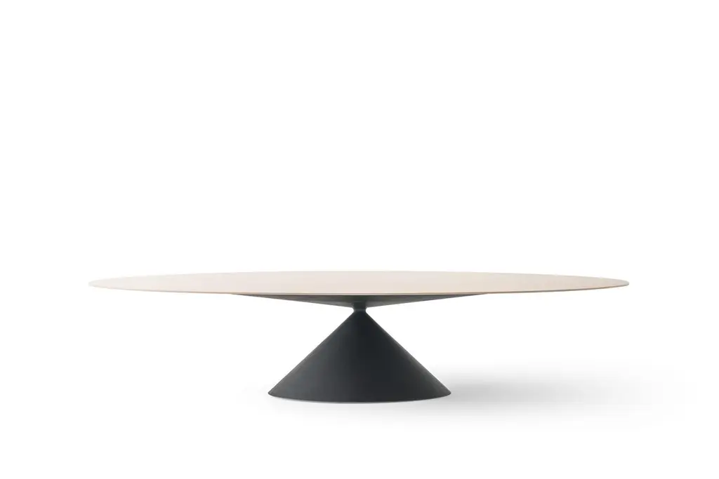 The iconic Clay table reaches unprecedented and generous dimensions until it becomes MAXI. A surprising 3,5 metres oval top offers new perspectives and expands the possibilities of to domestic environments and otherwise, featuring a precise and clear graphic sign in a perfect union between harmony of shapes and solidity of the material.A warm and welcoming version of Clay, an invitation to conviviality and being together. Two cones of different shapes meet at their opposite vertices, defying gravity in an apparently unstable balance, but giving shape to the most classic of round tables. Clay is the exception that becomes the rule, like design.Availablein different options:"Concrete" finishes:• D55 blue reale concrete• D56 ardesia concrete• D57 ochre concrete• D58 ghiaccio concrete• D59 cacao concrete• D60 red mattone concrete• D61 white concrete• D65 grey luna concrete• D66 black concrete"Stone" finishes:• D64 tufo stone• D67 lava stone"Marble" finishes:• D62 court greyDIMENSIONS:240 x 120 cm260 x 130 cm280 x 140 cm300 x 140 cm320 x 148 cm350 x 148 cmTable height: 74 cm.Price refers to the 280 x 140 cm in D66 black concrete.