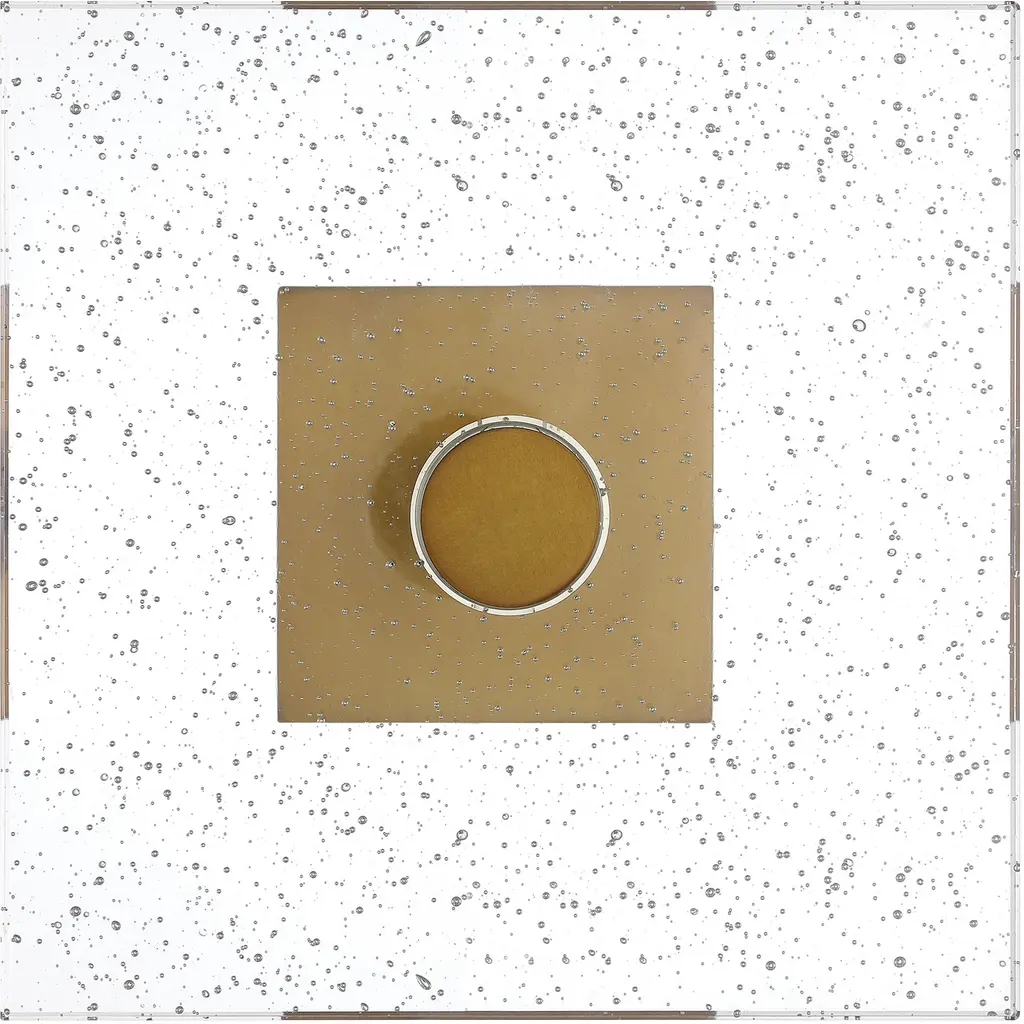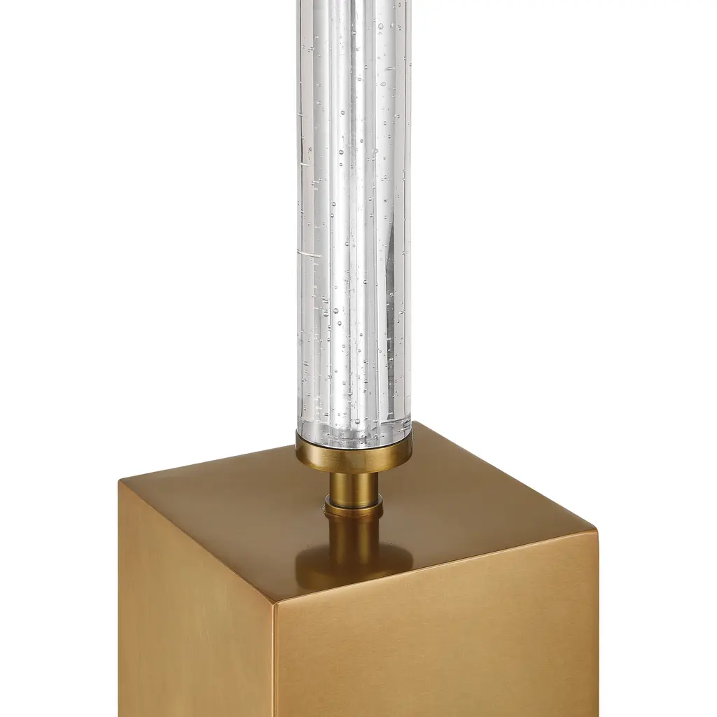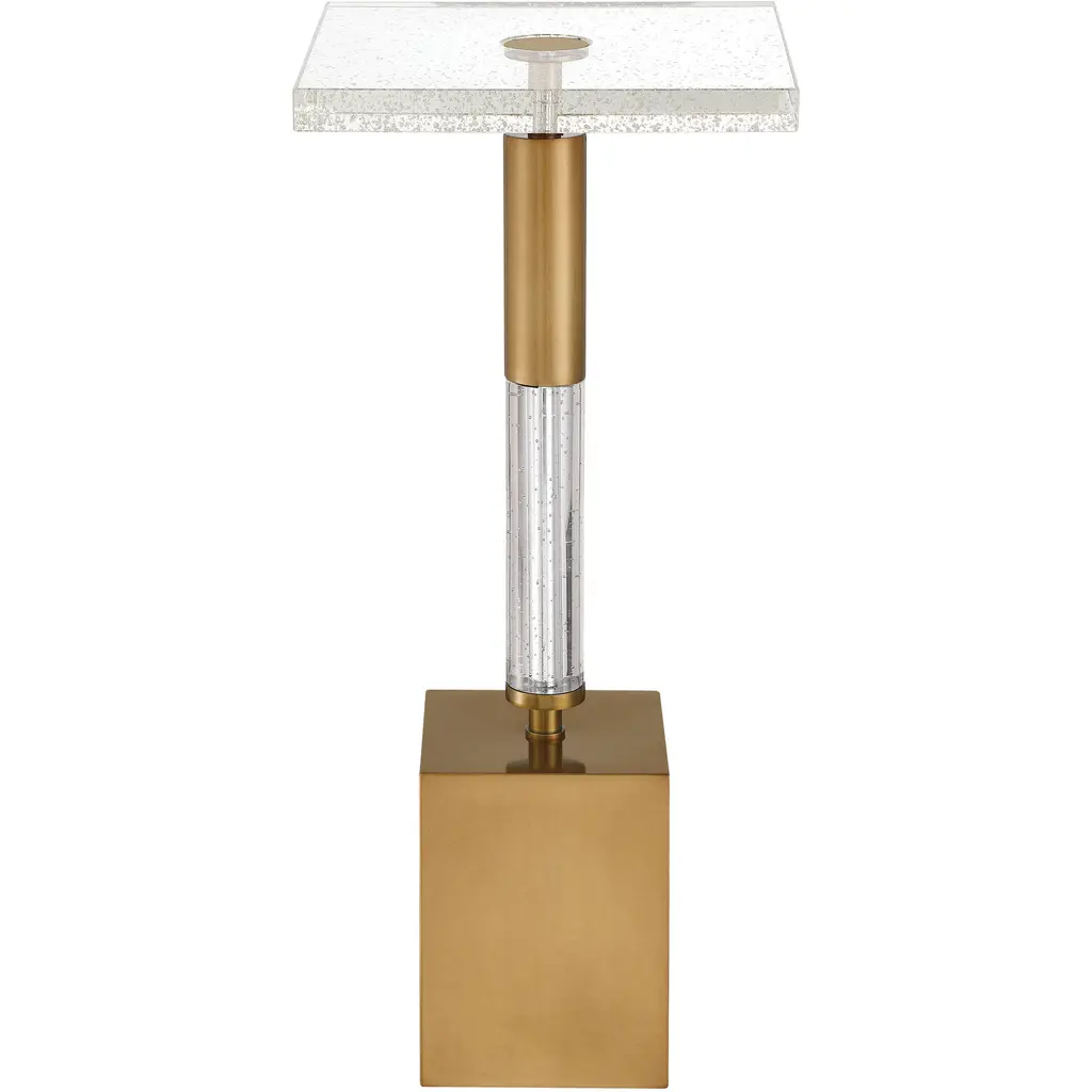 A study in geometric elegance, the Desiree Drinks Table blends clean lines with luxurious materials. The tall block base and the top of the rod-like stem that holds the top are crafted from metal in an antique brass finish, adding warmth and sophistication. Between these elements, a tube of optic crystal introduces a touch of clarity, mirroring the light-catching quality of the square top, which is made of textural seeded glass.