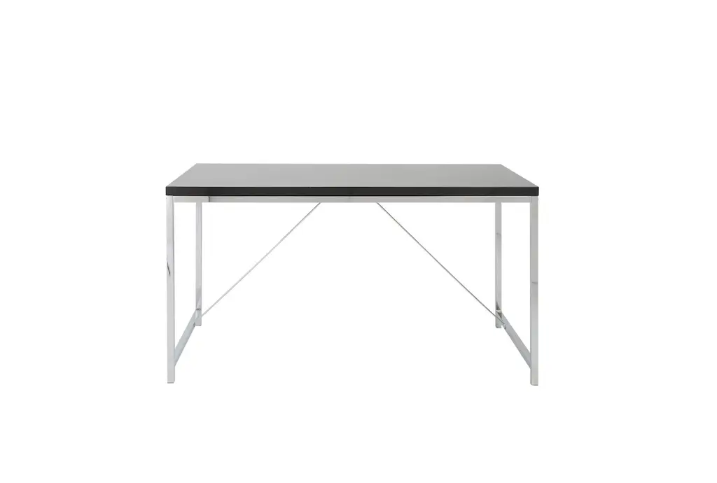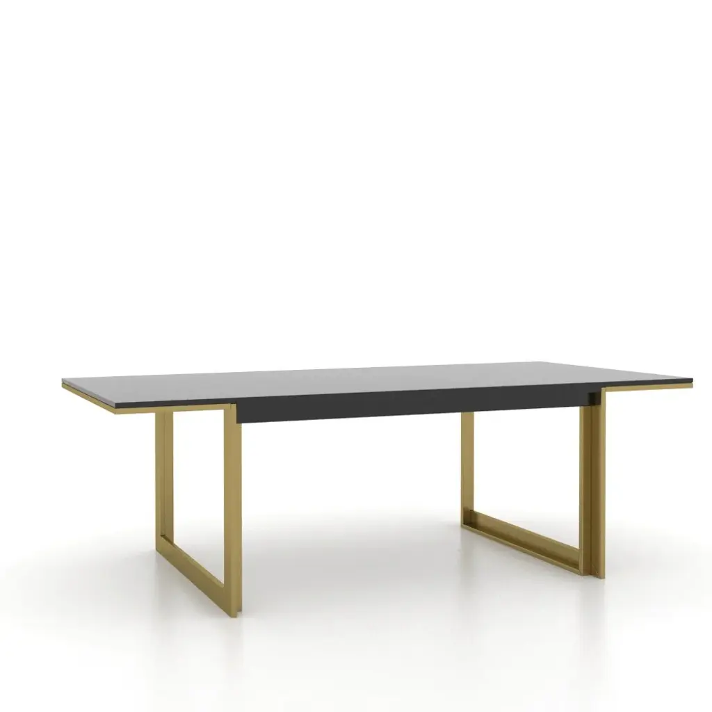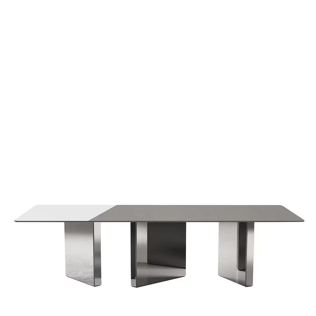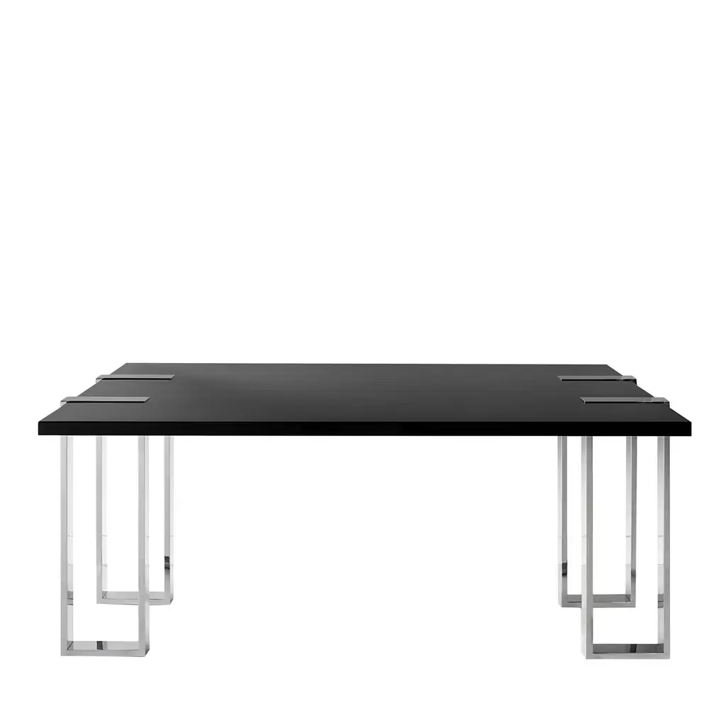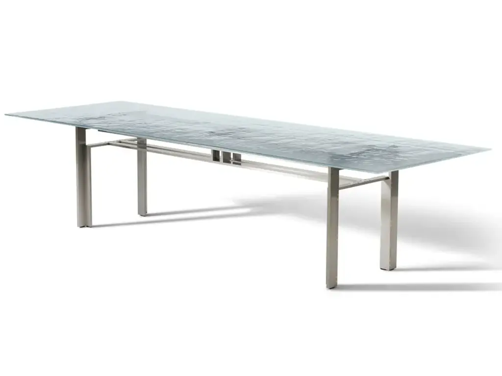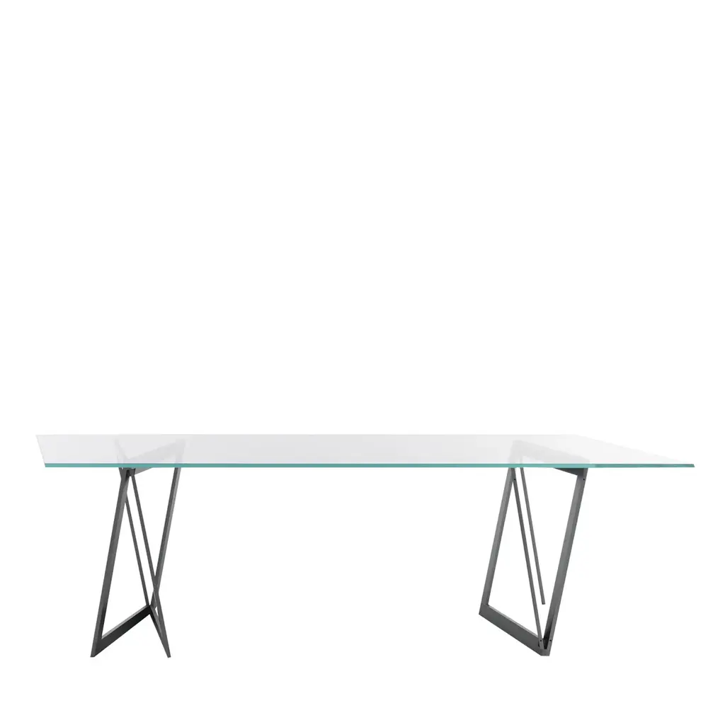 Part of "ABV Collection", this rectangular table was designed in 1991 by François and Frédéric Morellet, experts of geometric abstractionism and visual art. An ethereal glass top rests in apparently unstable equilibrium on a geometrically deconstructed base, which features an aluminum core enveloped in satin stainless steel partially varnished in black. From a whimsical commercial area to an original contemporary living space, this table will take center stage without even trying.