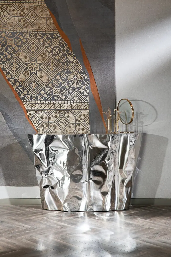 Diamante Console Table by NITUSH AROOSHDimensions: D 38 x W 120 x H 80 cm. Materials: Stainless steel.Available in different finishes. All our lamps can be wired according to each country. If sold to the USA it will be wired for the USA for instance. Please contact us.Aroosh and Nitush Mahipal, the creative minds behind Nitush-Aroosh, were born and raised in New Delhi, India, amidst a vibrant cultural and artistic milieu. Their parents instilled in them a love of beauty and creativity from a young age, and they were fortunate to travel extensively to different parts of the world, where they were exposed to diverse forms of art, design, and architecture. From childhood, Aroosh and Nitush were captivated by the stainless steel available at their family’s factory, spending countless hours creating their toys and honing their skills. This fascination laid the foundation for their future design and art endeavors, eventually leading to the birth of Nitush-Aroosh.The Mahipal brothers use innovative techniques to create a crumbled effect on stainless steel, resulting in sculptural pieces that appear to be made of a different material altogether. Their sculptural objects, including furniture, lights, sculptures, and wall installations, are carefully crafted to invite the viewers to embark on self-discovery and introspection.The Mahipal brother’s maiden international art exhibition at the Marbella Art Fair, Spain, in November 2021 was met with great enthusiasm and acclaim. Following this, they showcased their creations in two more exhibitions in Spain in 2022, where they left an indelible mark with their extraordinary pieces.White Domus took their artistic expression to new heights in 2023 when they held their first solo exhibition at a leading art gallery in Madrid, Spain.