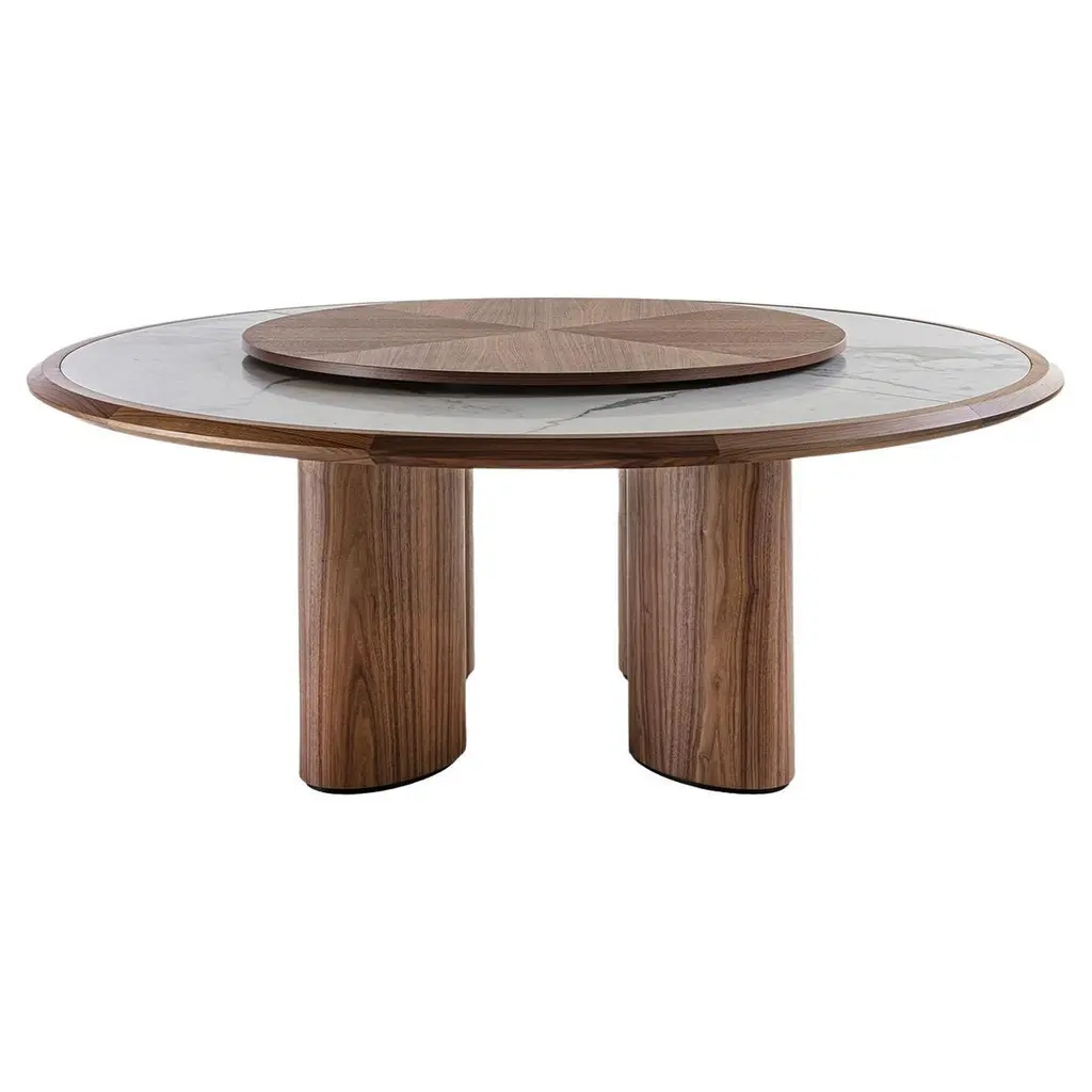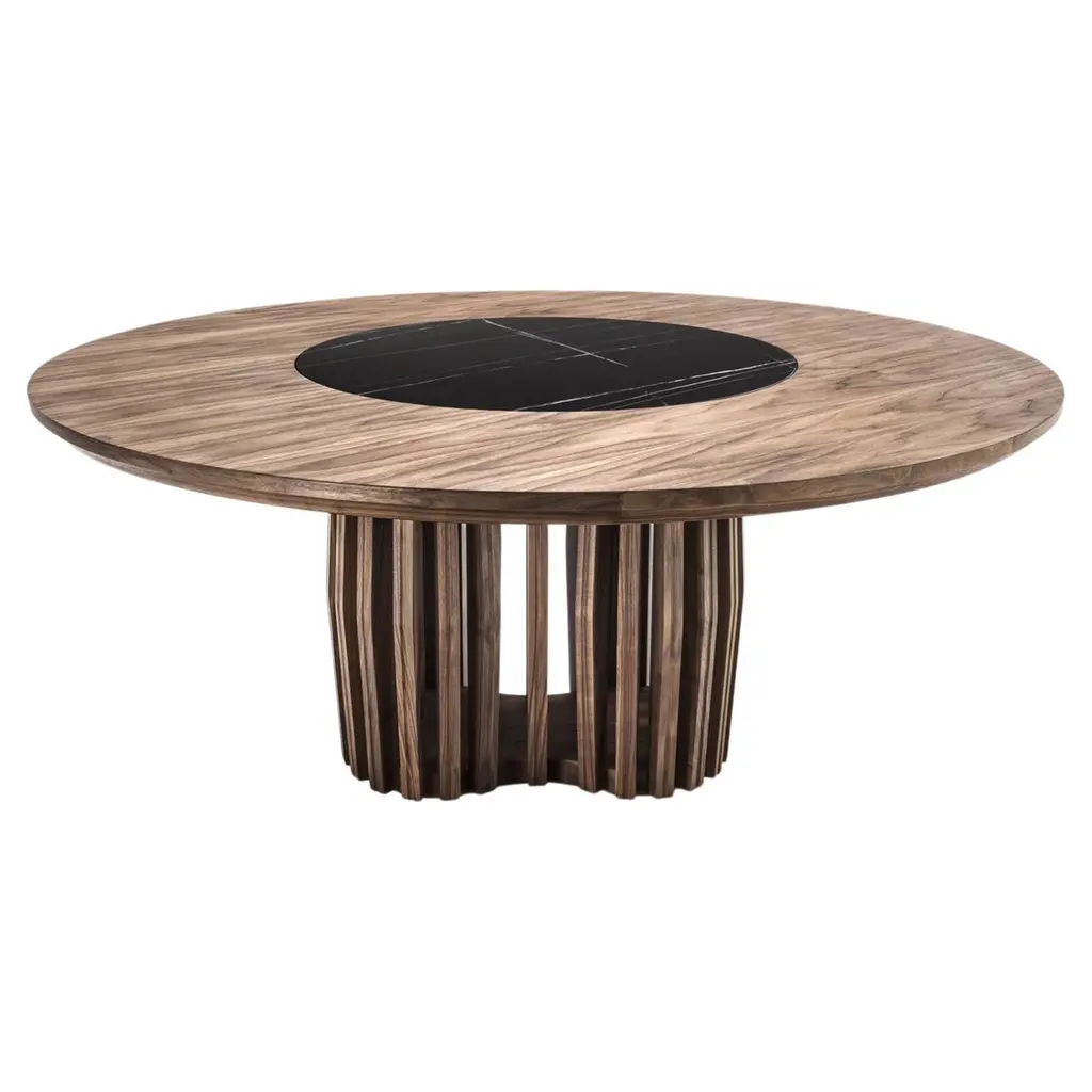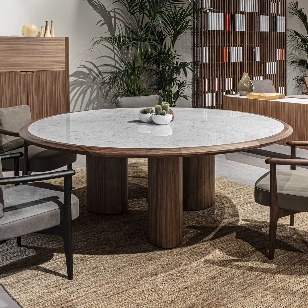 Crafted from rich walnut canaletto wood, this round table features a stunning 160cm Carrara marble top. The elliptical legs elegantly support a solid wood frame, adorned with a detailed border that beautifully encases the marble. A commanding presence in any room, it showcases masterful woodworking and a sophisticated blend of materials. Available in a range of sizes and finishes upon request, this table combines luxurious aesthetics with practical elegance.