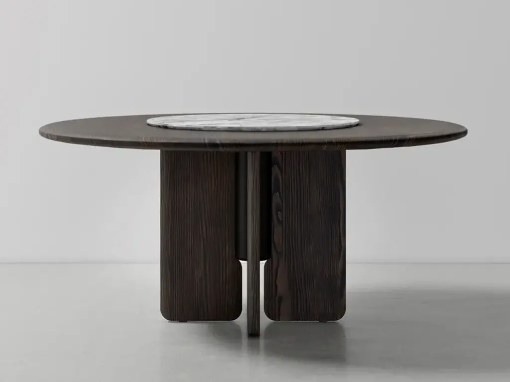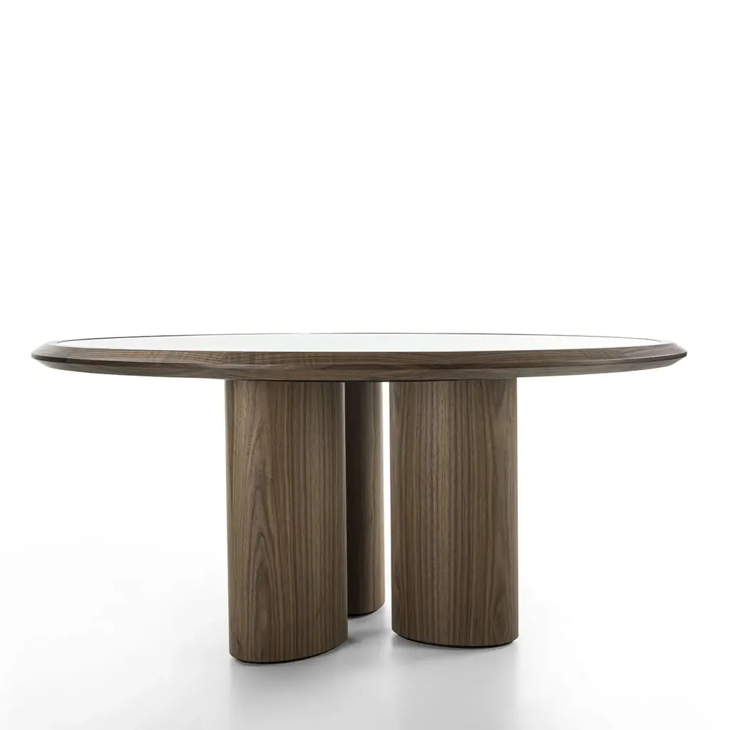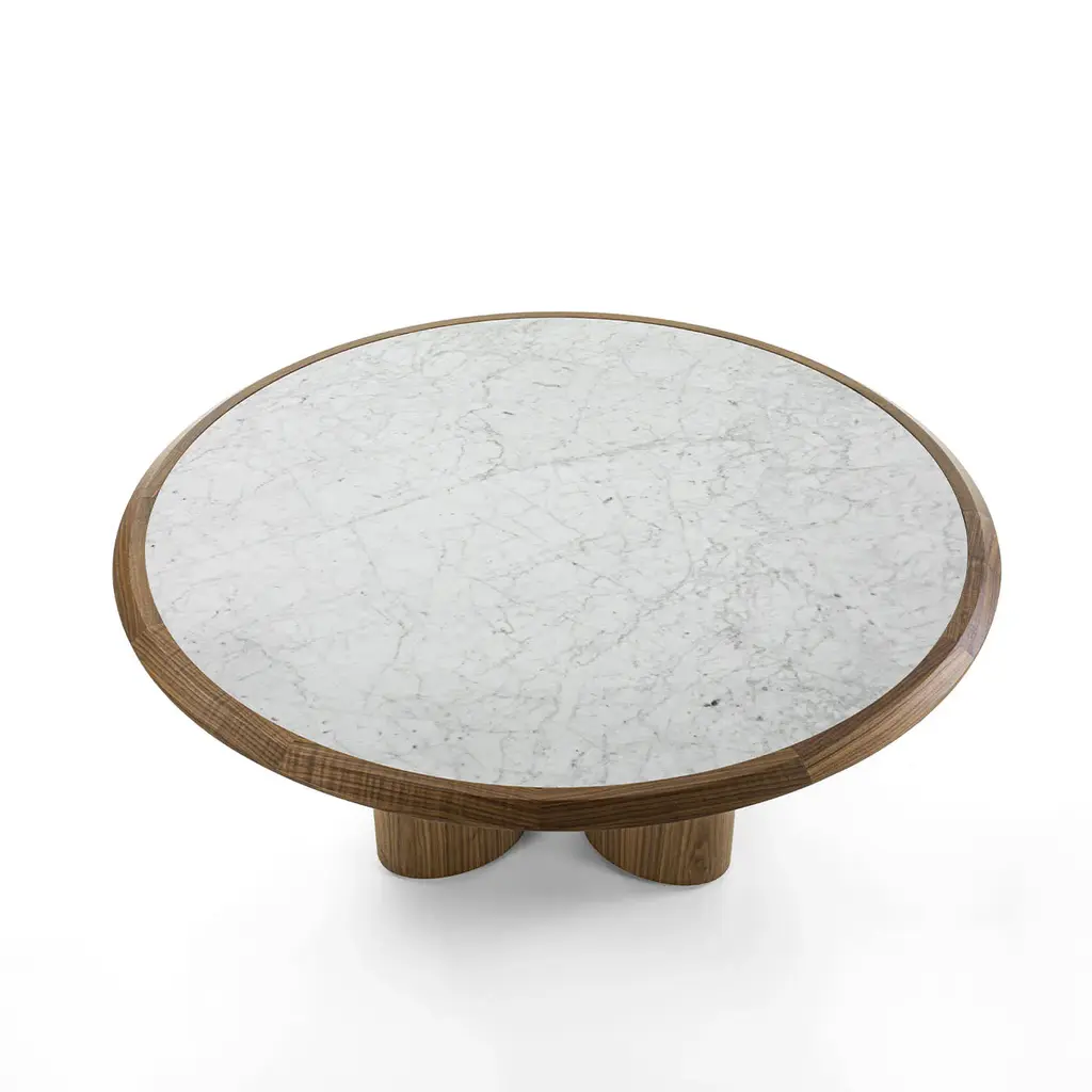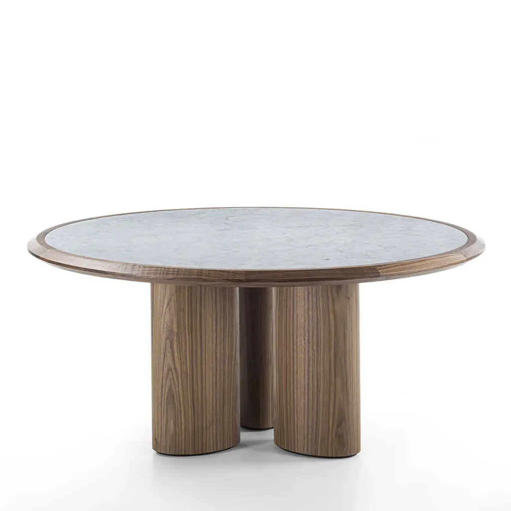 Crafted from rich walnut canaletto wood, this round table features a stunning 160cm Carrara marble top. The elliptical legs elegantly support a solid wood frame, adorned with a detailed border that beautifully encases the marble. A commanding presence in any room, it showcases masterful woodworking and a sophisticated blend of materials. Available in a range of sizes and finishes upon request, this table combines luxurious aesthetics with practical elegance.