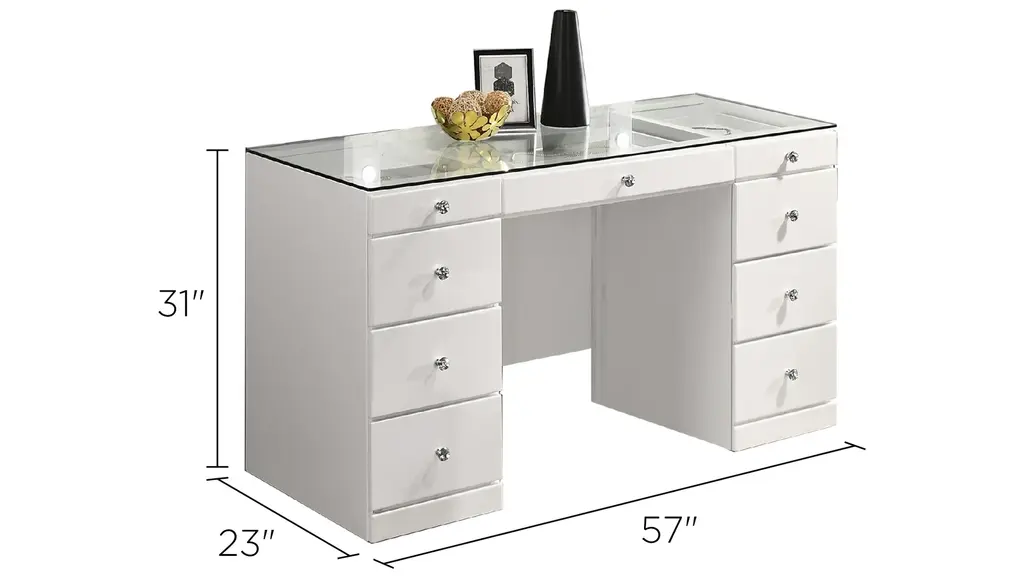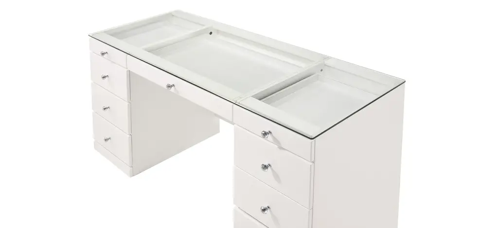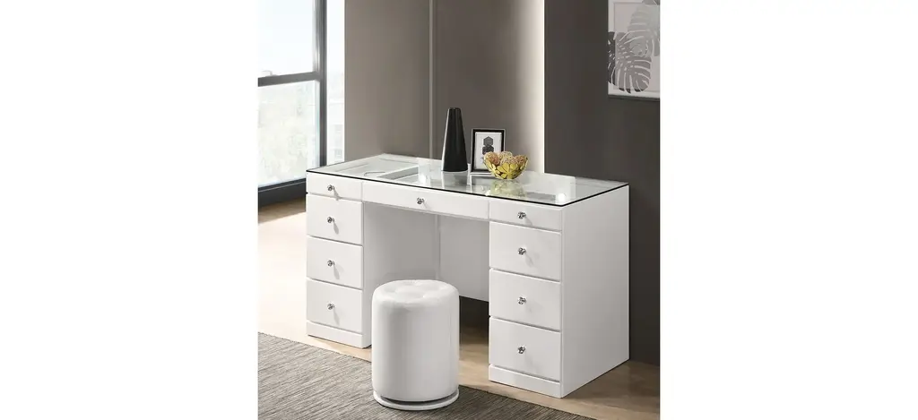 Diem Large Vanity Table features a glass top that makes for easy viewing of the first row of drawers. The full extension drawers allow for easy access for all your supplies. Whatever your need, this desk will be with you for years to come.