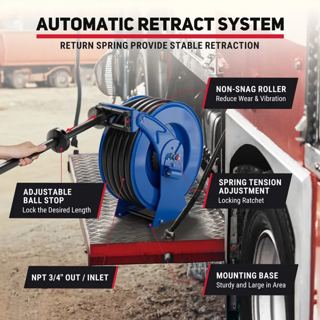 Diesel Fuel Hose Reel Blue, Heavy Duty Retractable 3/4" X 50ft Hose Reel With Automatic Shut Off