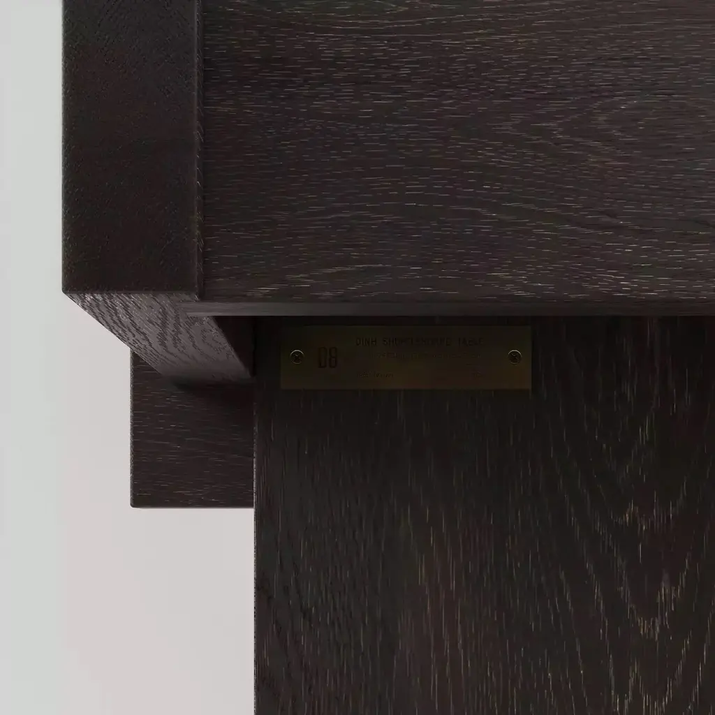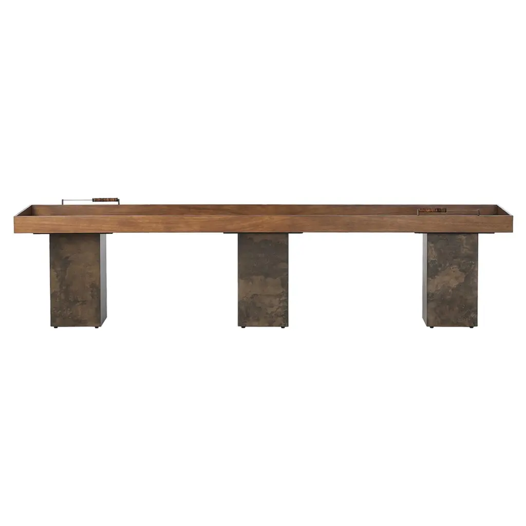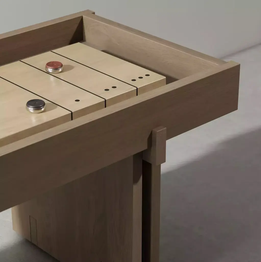 The Dinh Shuffleboard Table from District Eight reinterprets a classic game with a sleek, minimalist silhouette and masterful craftsmanship. Crafted with a full oak structure, its gutters are detailed with hand-stitched leather to elegantly capture stray pucks. The cradled playing field is specially coated for a seamless glide, resting on a formidable base for precision in play. This refined table is a stunning centerpiece that invites connection and friendly competition in any modern game room. Highlights: