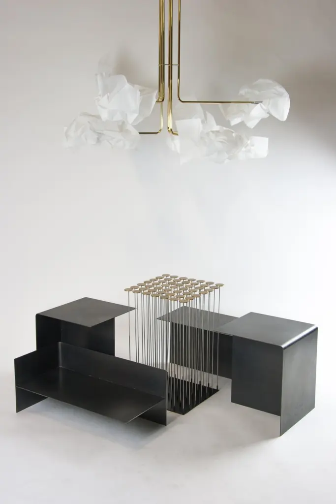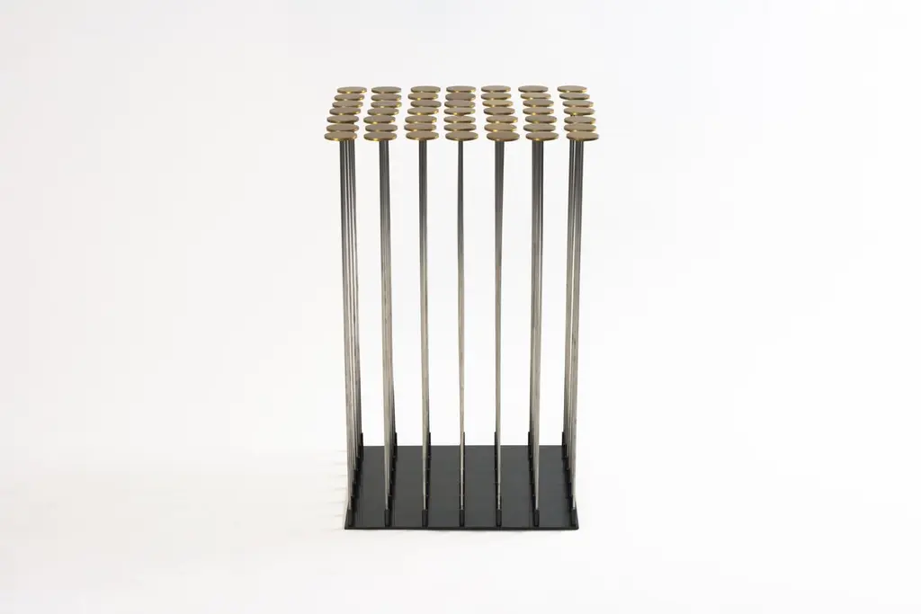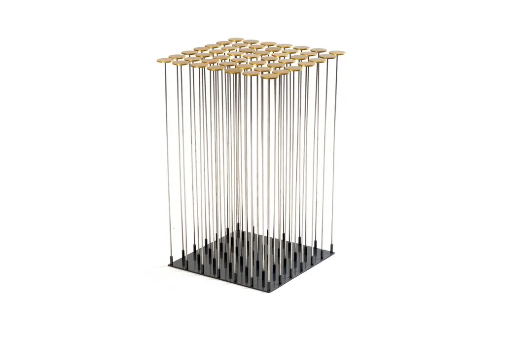 Dischi side table by Gentner Design.Dimensions: D 30.5 x W 30.5 x H 48 cm.Materials: brass, darkened stainless steel.With a nod to Harry Bertoia, the Dischi table is both sculptural as it is functional. Amazingly stable as a table surface, this piece is a willowy yet architectural statement which can also be customized into various shapes. Discs made of milled brass and a darkened stainless steel base, the stainless steel rods allow for the gentile movement of the table top.Gentner DesignRooted in a language of sculpture, character defining details, and world renowned craftsmanship, the work is found at the crossroads of design and art.Established in 2011, the namesake furniture label is a rare combination of aesthetic dexterity and mastery of craft resulting in furniture and objects that are expressive, formal, and transcend materiality.The collection is based in metal and incorporates only natural materials such as leather, wood, and glass in unique ways, challenging our assumptions.Christopher GentnerChristopher Gentner, with a BFA in metalsmithing from the Cleveland Institute of Art and apprenticeships under sculptors and jewelers, together with dedication to craft, quickly developed his reputation nationally as a foremost authority of metal fabrication and furniture.One of his crowning achievements was the re-creation and fabrication of the Frank Lloyd Wright Robie House gates.These unique experiences are the foundation of his design philosophy which he employs in his own line of furniture, lighting, and objects.