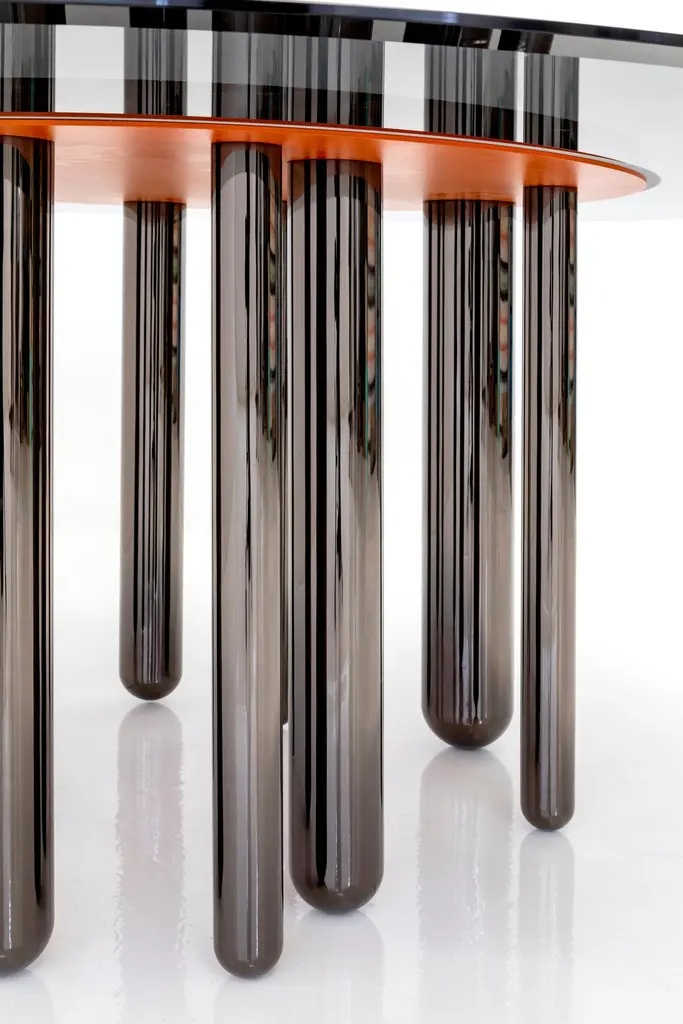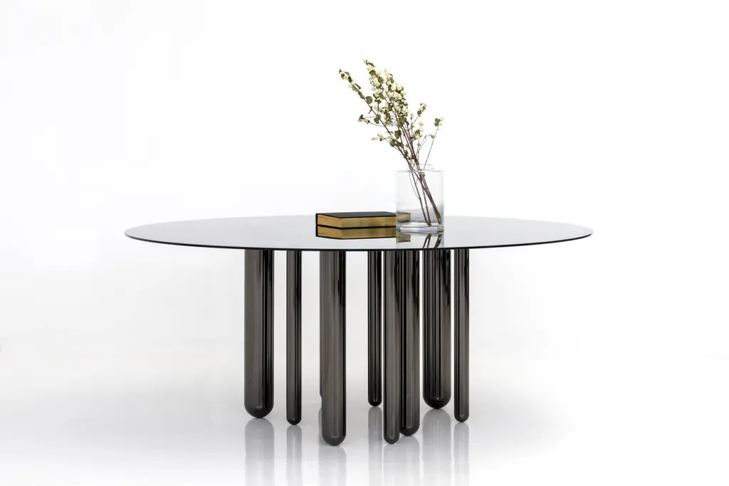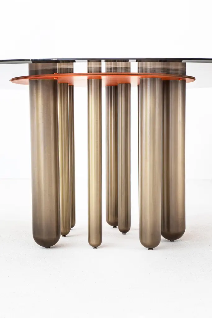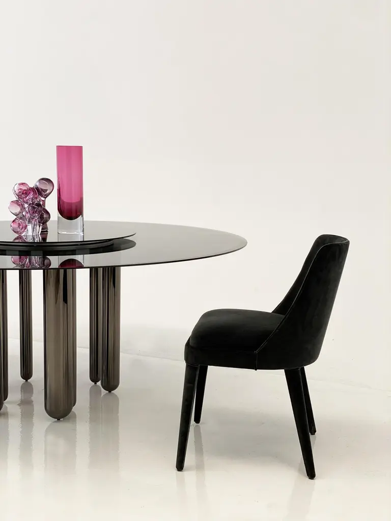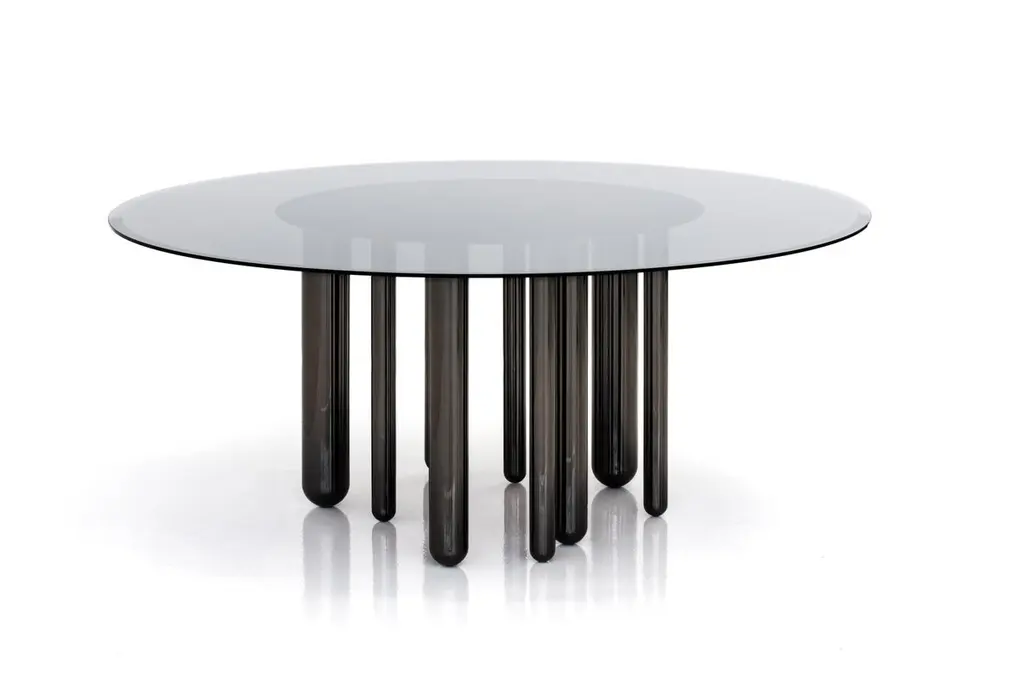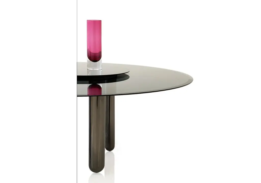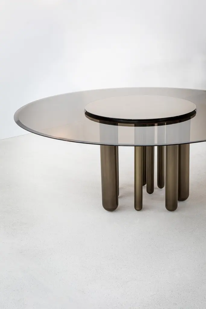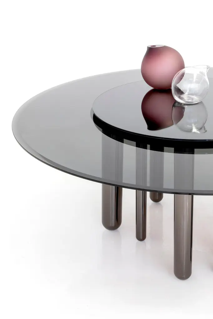 Discoteca 200 Black Nickel And Fumé Glass Top Round Table by Casa Casati Dimensions: Ø 200 x H 74 cm. Materials: Black nickel, glass, mirror, and brass.Finish: Black nickel legs, top in fumé glass, Lazy Susan in fumé mirror. Available in different materials and size options. Please contact us.Available in four sizes, a transparent fumé glass top and mirrored lazy Susan are supported on a base of irregularly spaced brass legs of different sizes. A chord. A beat. A rhythm. Black nickel, always shining, always spinning, this piece is a joyful, hedonistic tribute to music from another time.Atelier Casa Casati. Italian Lifestyle. Italian Skill. Italian Furniture.Excellence of materials, love of detail, creativity. This sums up the design philosophy of CASA CASATI. The atelier was created in 2016 by architects Bosco Fair and Emanuele Genuizzi, who, following years of experience in the field of interior and product design, bring to this project the cultural and aesthetic values of the highest Italian tradition. A tradition that takes form thanks to the work of the most qualified artisans of Brianza. It is in their hands that the “Italian Dream” becomes reality. It’s their skill which gives life to unique pieces, characterized by precious materials, sophisticated finishes, and unusual combinations which never fail to surprise. Thanks to the use of natural materials and expert manual labour, each of the CASA CASATI pieces has its own ethos, showing specific characteristics which highlight their value as unique pieces. Special interior projects and limited edition pieces can be developed upon request.CASA CASATI: classic elegance and a contemporary aesthetic mix together to create something indisputably of its time.