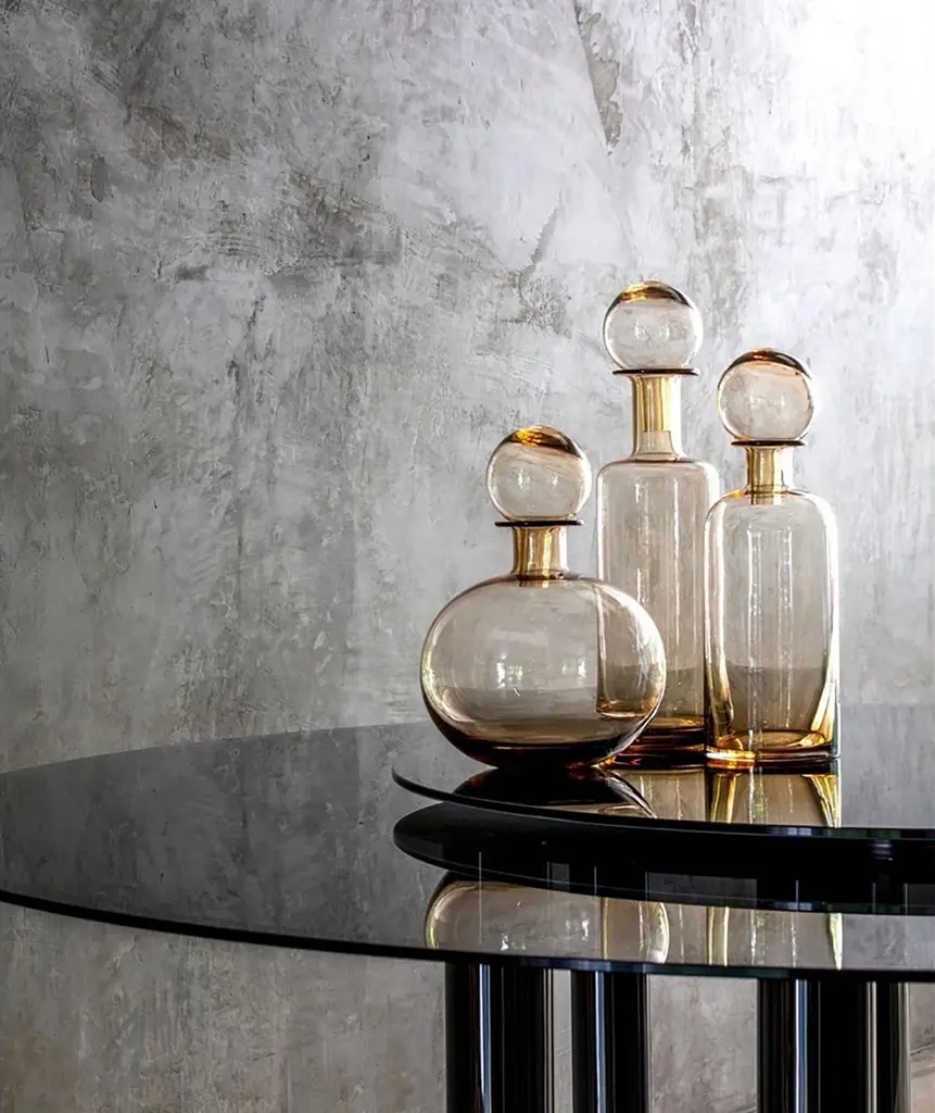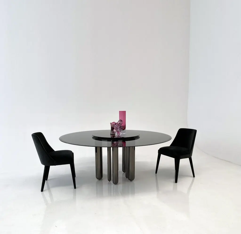 "Saturday night and the music’s cool,The mirror ball’s spinning and you’re in the mood.Feel the beat. Feel the love".A transparent fumé glass top and mirrored Lazy Susan are supported on a base of irregularly spaced brass legs of different sizes. A chord. A beat. A rhythm. A glimmering black nickel finish and sparkling mirror, always shining, always spinning, this piece is a joyful, hedonistic tribute to music from another time. Legs are in brass with a black nickel finish. The table is equipped with a Lazy Susan in fumé mirror, diam. 80 cm. The underside is lacquered in Casa Casati Orange. The Discoteca table can have a very sophisticated look when decorated with minimalist accessories; but it can also have a "Las Vegas" feel to it. Imagine it with a large chandelier lighting it up, and lighted candles spinning on the Lazy Susan. The Discoteca table, because of its interesting design, is adapted to both minimalist and decorative table settings.Other finishes and dimensions are available for customised tables.