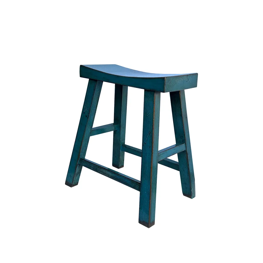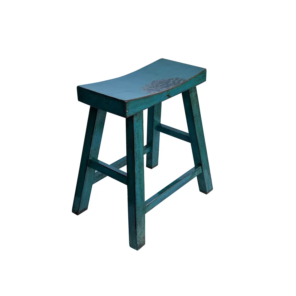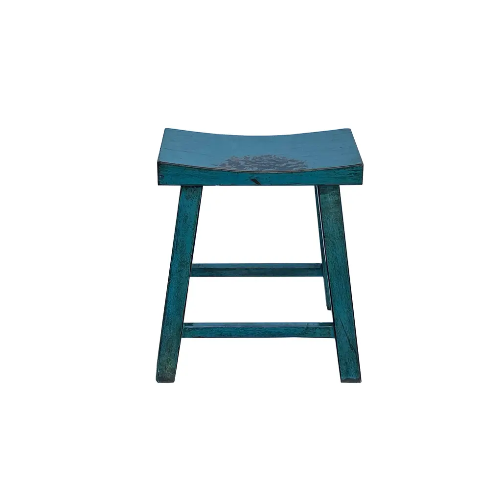 Crafted from solid Elmwood, this distressed teal blue backless stool offers a unique blend of Zen-inspired tranquility and rustic charm. Its single-seat design and sturdy construction make it a versatile piece, perfect as a bar stool, extra seating, or an accent in any room. The vibrant blue hue and distressed finish add a pop of color and an authentic, aged look, making this Asian-style wood bench a captivating addition to your home decor. Dimensions: top 17.5" x d10" x h18.75" , bottom d 13" Origin: China Material: Elm Wood Condition: handmade, original rough bump marks Work: ship in one piece, a variation on the crack marks and distress marks USA domestic continental buyers of 48 states pay $130 shipping .Insurance and handling charges are already included in the shipping cost.