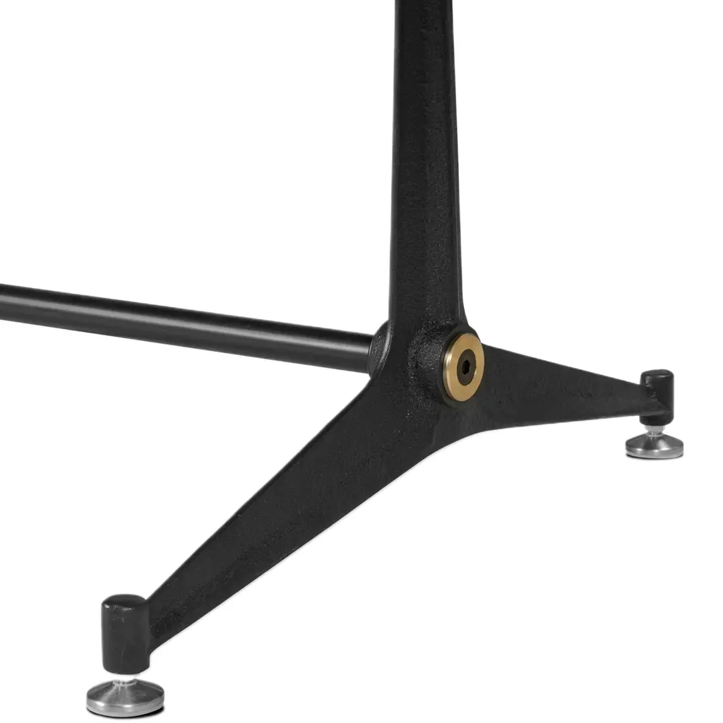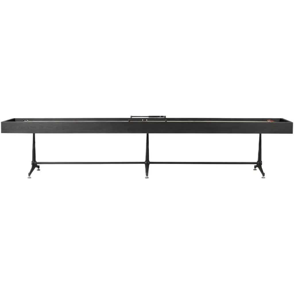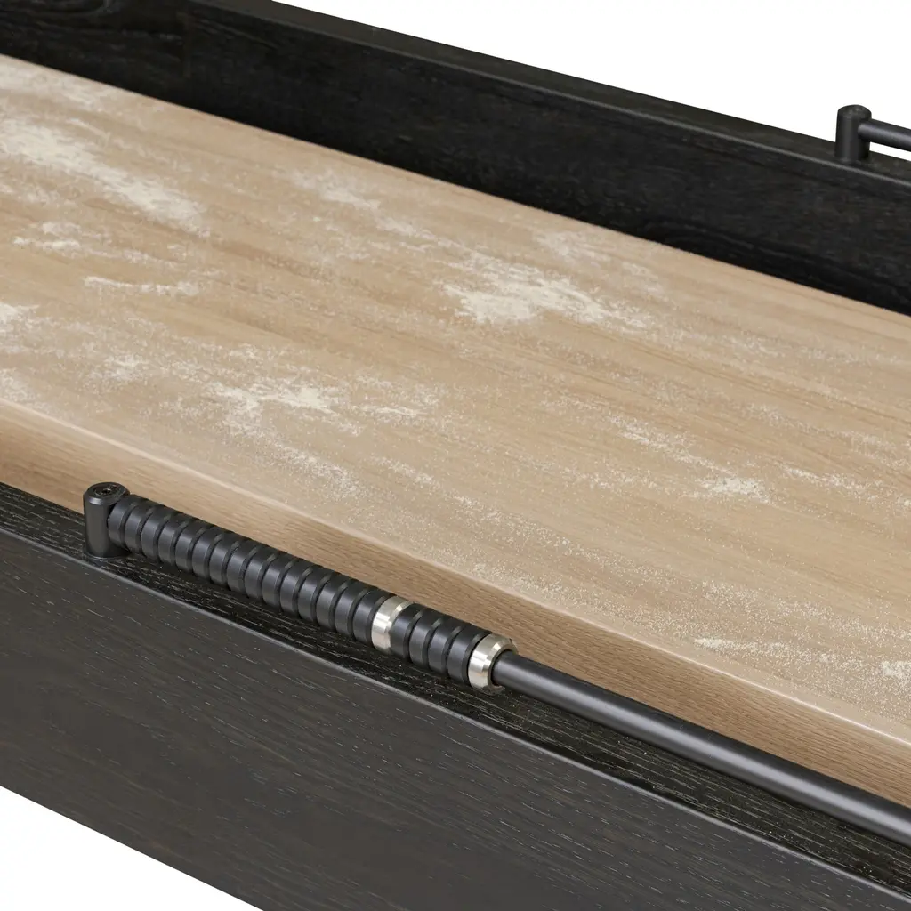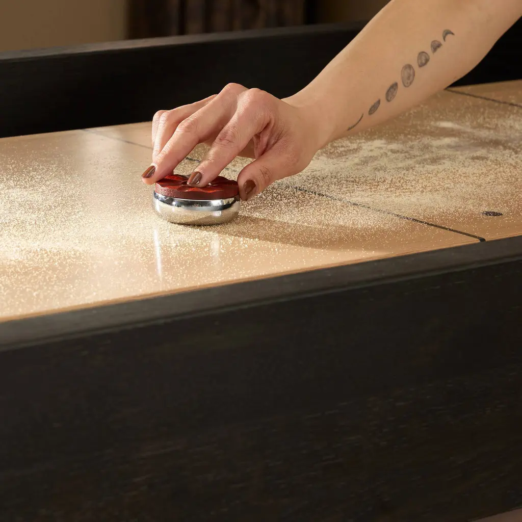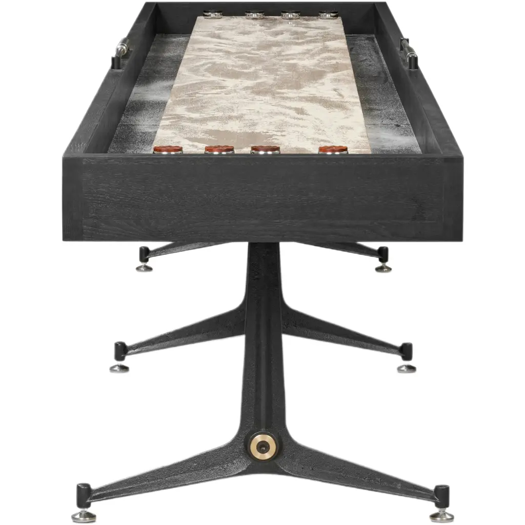 Material-driven for fun, this shuffleboard table features a hand-stitched leather landing surface, laminated solid oak game board finished in a durable lacquer, and industrial trestle-style, cast iron legs. Climatic adjusters for leveling with ease. Each table comes with carved wood and steel pucks, as well as a steel ring scoring mechanism. Handcrafted classic games, reimagined with quality materials and dedicated artisanship in a unique blend of fun and functionality.