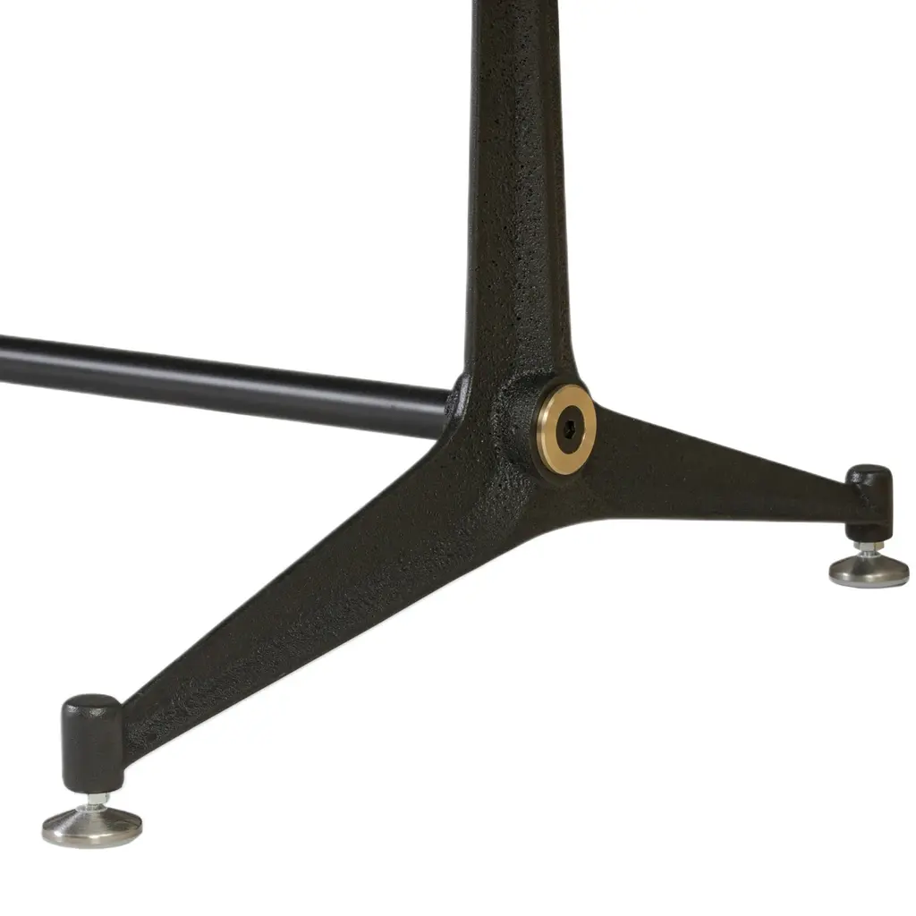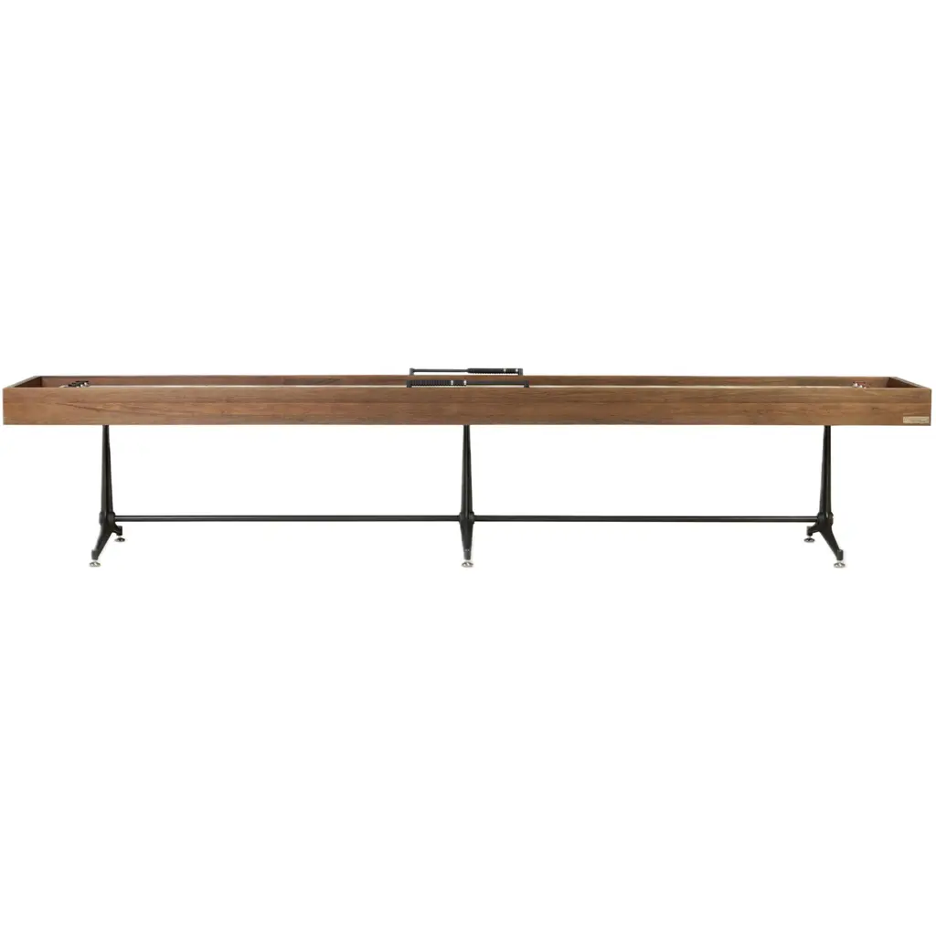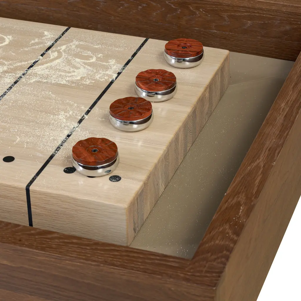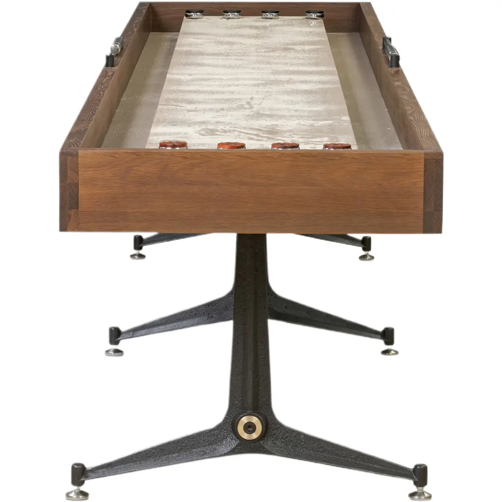 Material-driven for fun, this shuffleboard table features a hand-stitched leather landing surface, laminated solid oak game board finished in a durable lacquer, and industrial trestle-style, cast iron legs. Climatic adjusters for leveling with ease. Each table comes with carved wood and steel pucks, as well as a steel ring scoring mechanism. Handcrafted classic games, reimagined with quality materials and dedicated artisanship in a unique blend of fun and functionality.