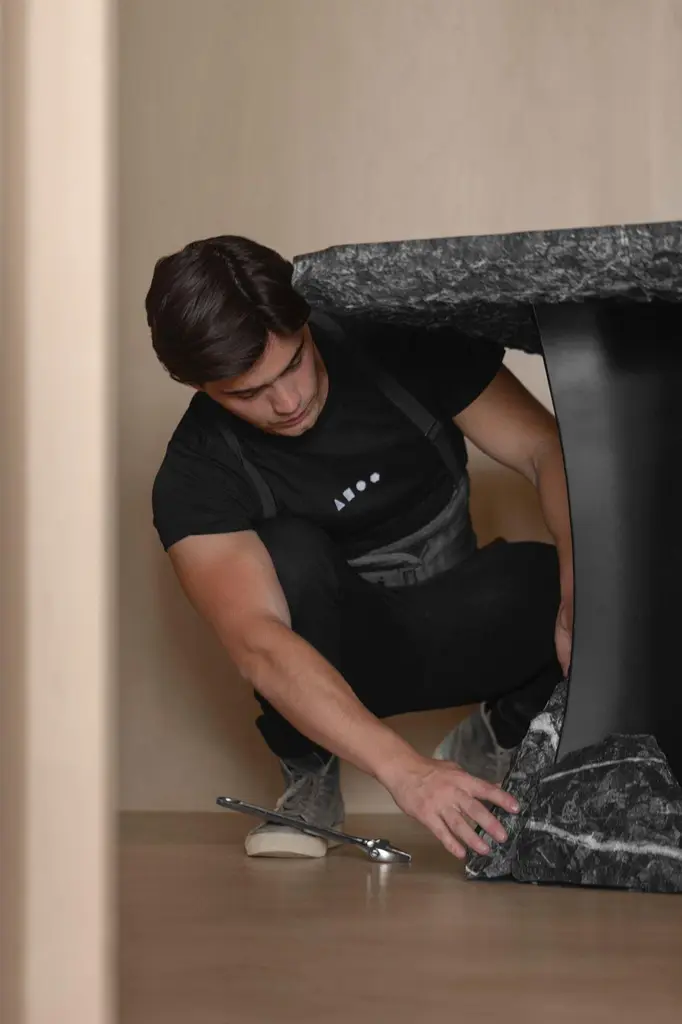 Divergente Uno Table by Andres MonnierOne of a Kind.Dimensions: D 80 x W 90 x H 70 cm.Materials: black marble.A divergent boundary occurs when two tectonic plates move away from each other. Along these boundaries, earthquakes are common and magma rises from the Earth's mantle to the surface, solidifying to create new oceanic crust. This piece is made with one whole black marble plate divided in two and some marble crusts in the bottom. A void is emerging to the surface, one plate is splitted and now is composed from two pieces. If cracks keep appearing, how many fragments compose its whole plate? its whole self? Cracks are needed to let light inside.Designer's biographyTreko concrete is a Mexican studio based in Ensenada, that has as a purpose to create functional handcrafted furniture and sculptural pieces to tell stories with art and design. With the direction of Andres Monnier, Treko concrete now creates handmade fire pits, art objects, and functional furniture with natural stone, mirror, concrete, wood, and metal. Treko works with different techniques and languages of creation to innovate new purposes in conventional furniture.