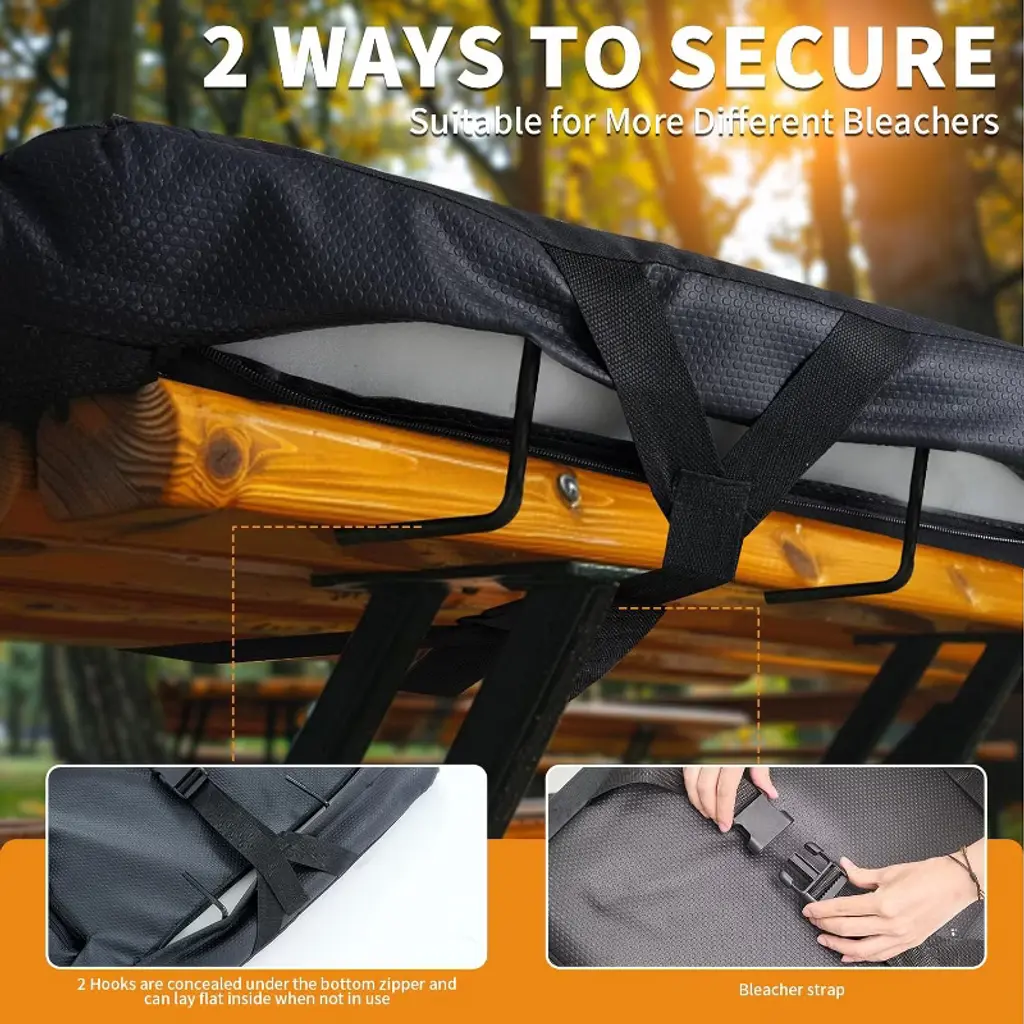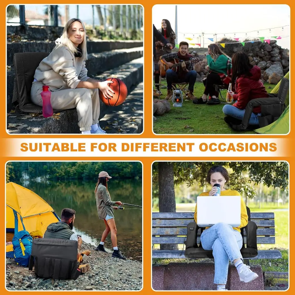 Our Heated Bleacher Seat upgrade with built-in button and 3 heating levels. Simply press the button to adjust 3 heating settings (Red - High; Blue - Medium; Green - Low). It's very easy to use. Just insert the cable into the battery(power banks are not included in the package), press the button, and you can feel the warmth for hours. Our Heated Bleacher Seat upgrade with dual-zone independent controlled heating system. You can heat both the seat and backrest simultaneously, or heat the seat cushion or backrest separately. More personalized usage methods. Bringing you a convenient user experience. The heated bleacher seats can avoid the muscle soreness caused by sitting for a long time, you can focus more on your game or performance. The heated stadium chair has 6 reclining options, you can choose the most comfortable position to enjoy your happy time. Our Stadium seats for bleachers designed with 2 hooks and one fix strap for more stable use. It can be secured easily and quickly to most bleachers and benches. Which is not easy to move and more stable.NOTE:The hooks are hidden inside the bottom zipper.The heated stadium seat is an excellent choice for any sport such as football, baseball, basketball, Olympics, World Cup, as well as outdoor activities, adventures, beaches, parks, camping, and travel. Stadium seats for bleachers are perfect for those who spend long periods of time with their children during training or waiting on the sidelines of sports events. Say goodbye to hard, chilly bleachers!