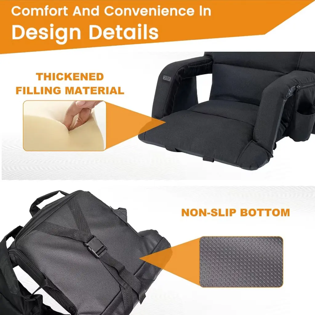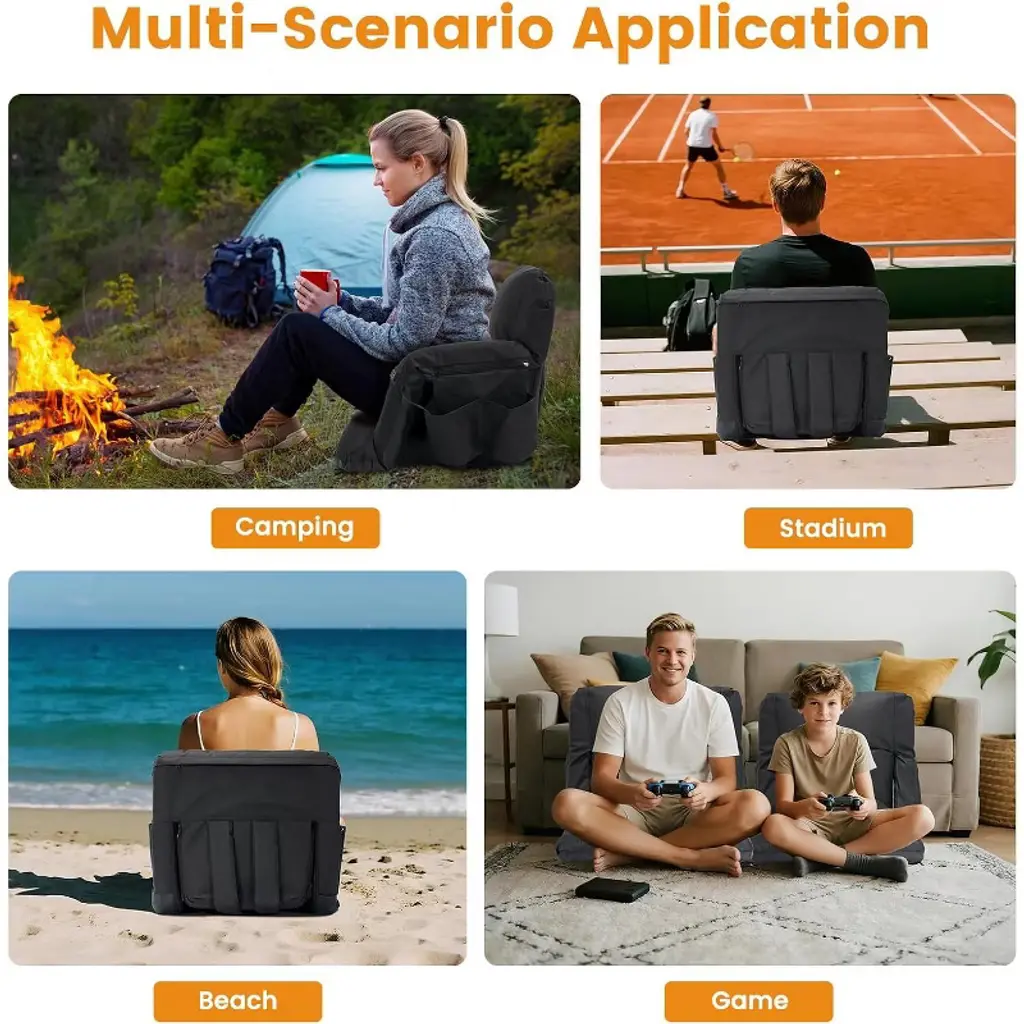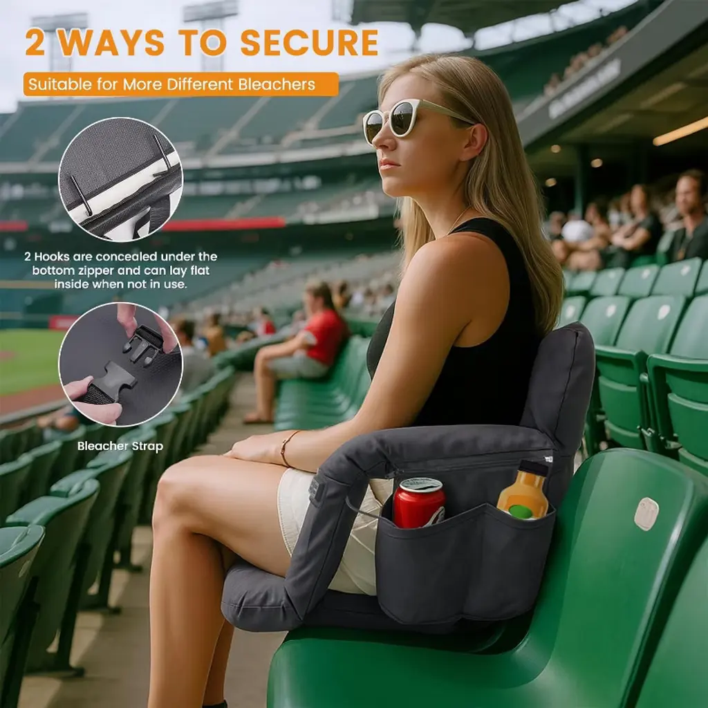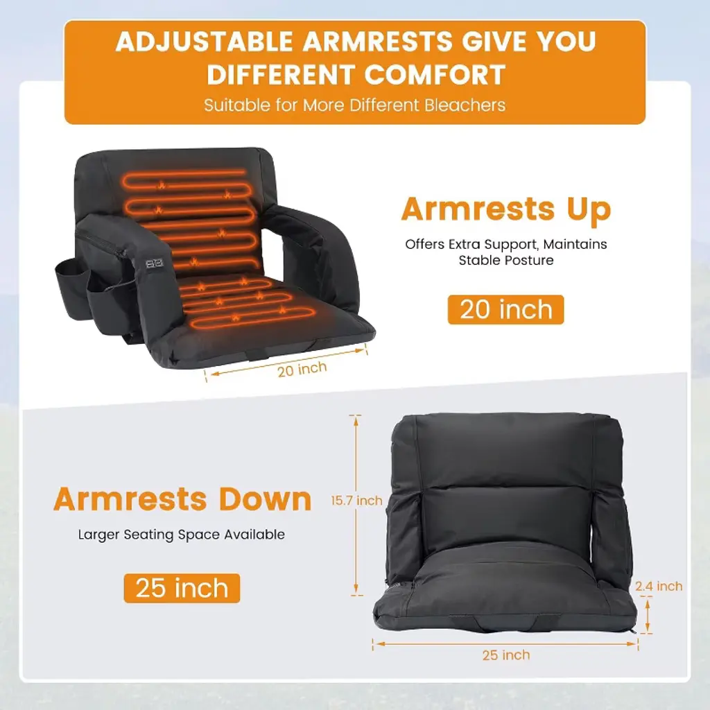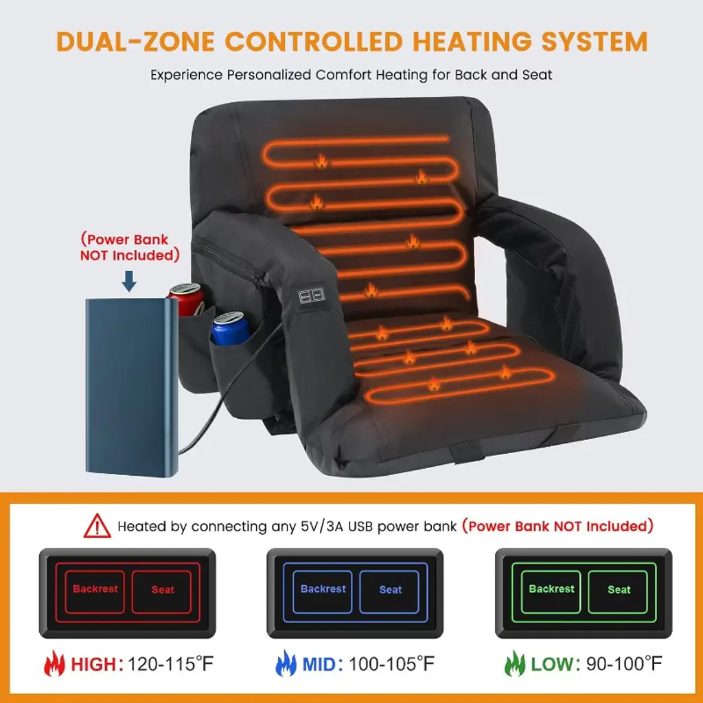Our Heated Bleacher Seat upgrade with built-in button and 3 heating levels. Simply press the button to adjust 3 heating settings (Red - High; Blue - Medium; Green - Low). It's very easy to use. Just insert the cable into the battery(power banks are not included in the package), press the button, and you can feel the warmth for hours. Our Heated Bleacher Seat upgrade with dual-zone independent controlled heating system. You can heat both the seat and backrest simultaneously, or heat the seat cushion or backrest separately. More personalized usage methods. Bringing you a convenient user experience. The heated bleacher seats can avoid the muscle soreness caused by sitting for a long time, you can focus more on your game or performance. The heated stadium chair has 6 reclining options, you can choose the most comfortable position to enjoy your happy time. Our Stadium seats for bleachers designed with 2 hooks and one fix strap for more stable use. It can be secured easily and quickly to most bleachers and benches. Which is not easy to move and more stable.NOTE:The hooks are hidden inside the bottom zipper.The heated stadium seat is an excellent choice for any sport such as football, baseball, basketball, Olympics, World Cup, as well as outdoor activities, adventures, beaches, parks, camping, and travel. Stadium seats for bleachers are perfect for those who spend long periods of time with their children during training or waiting on the sidelines of sports events. Say goodbye to hard, chilly bleachers!