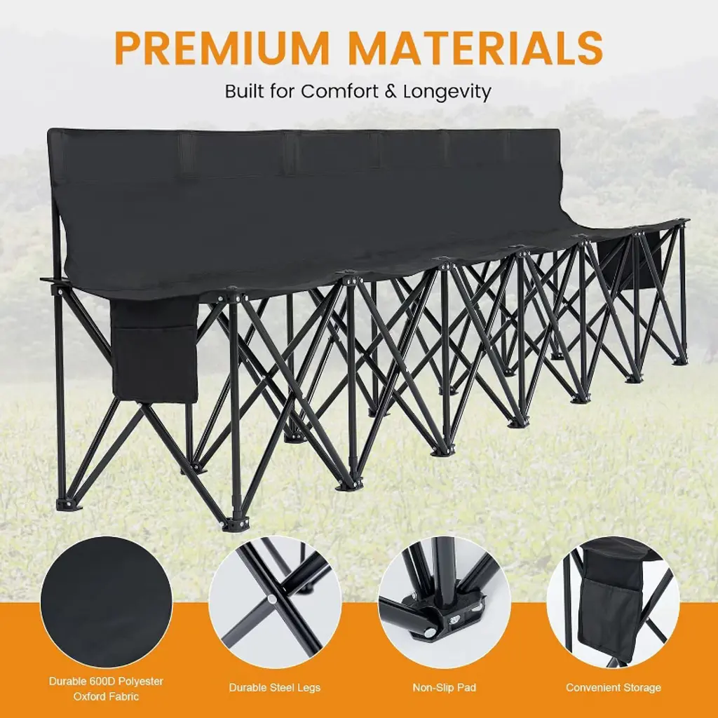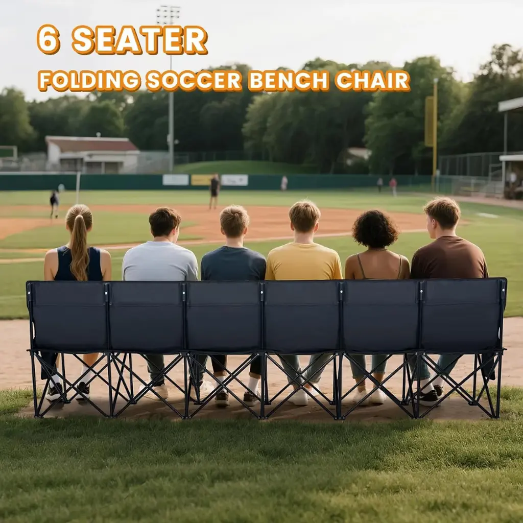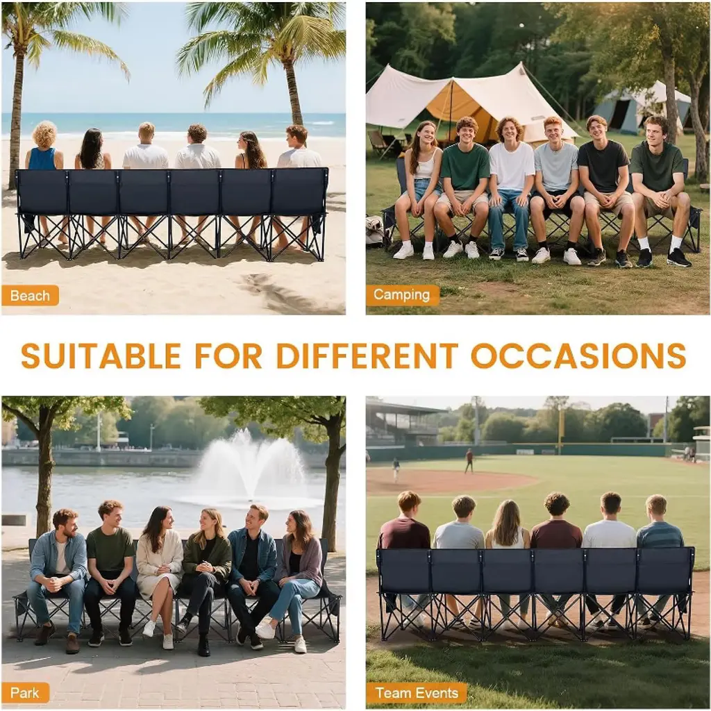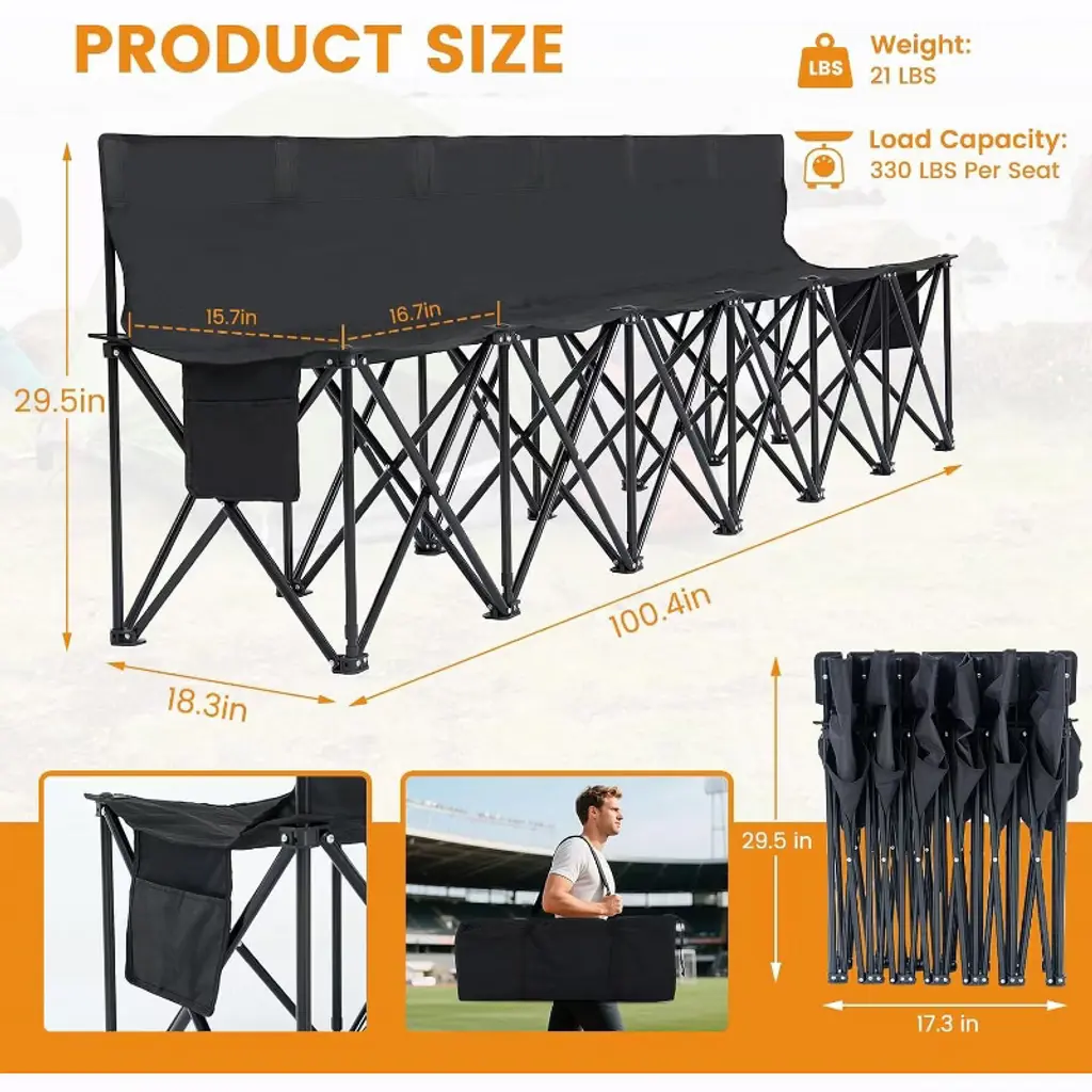 4/6/9 SEAT FOLDING CHAIR: Our olding sports chairs is designed for convenience, offering a space-saving and portable seating solution. The folding chair outdoor design allows for easy transport and storage, making it ideal for various events, sports games, and outdoor activities. STURDY & DURABLE CONSTRUCTION: The outdoor camping chairs are made of a robust alloy steel frame and 600D polyester oxford fabric, ensuring durability and stability during use. This makes the foldable bench seating a reliable seating option for teams, spectators, or event participants. NO ASSEMBLY REQUIRED: Our folding chair is made of foldable steel frame and can be used without additional assembly; It is convenient and fast, allowing you to quickly obtain a comfortable seat for multiple people to use simultaneously during outdoor activities. WIDELY USED: This Folding Soccer Bench has a wide range of uses and are suitable for people of different ages; In football, basketball, and other sports events, you can let athletes and team members rest on this folding chair, and you can also use it for outdoor activities, travel, camping, and other occasions. Package Includes: You will receive one foldable seat with one carry bag, which can be used in occasions that require a large number of seats, such as sports events, activities, outdoor camping, travel, and leisure.
