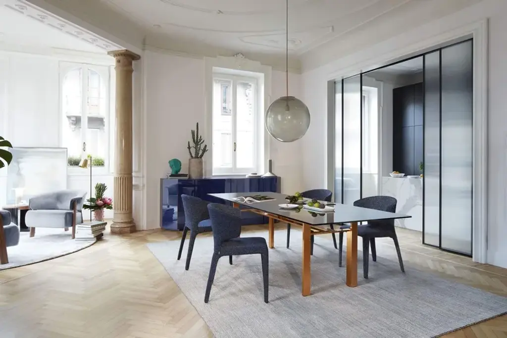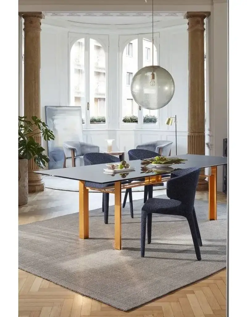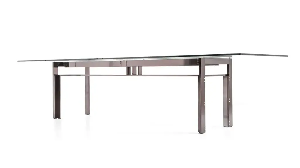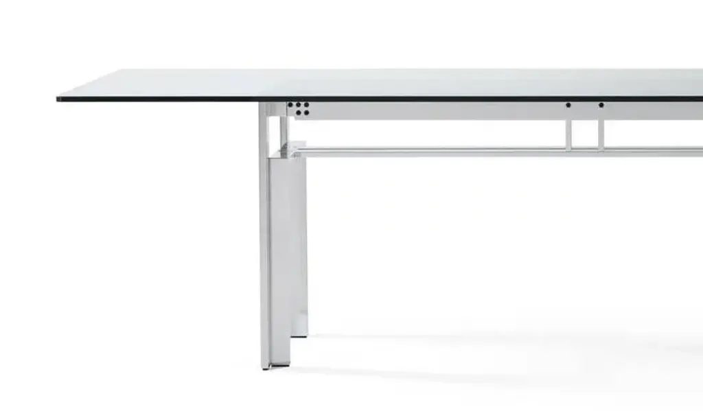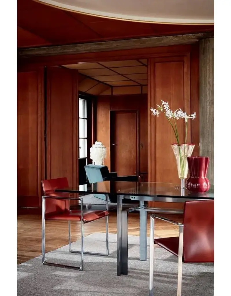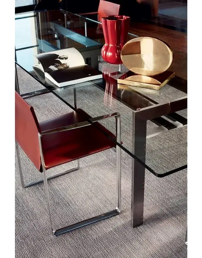 Doge is a rectangular table with metal base and glass top.A veritable masterpiece of the Italian design tradition, this sculpture-like table became, in the late 1960s, the emblem of the “Ultrarazionale” movement which, shrugging off the restraints imposed by the Rationalists, aimed to re-embrace traditional aesthetic values. Part of Cassina’s Simon Collection, the Doge table has been revisited with new textures and new materials. The architectural aluminium or satin-finish steel base, set off by the flat wide profiles, is the essential part of the table, while the elegantly refined mechanism linking top to base can be seen from above, through the glass of the table top. The new-look Doge table is available in five sizes, all taking their cue from Carlo Scarpa’s original design, with the table top being available in glass or marble.StructureBrushed metal frame lacquered over with protective transparent gloss.Anodized aluminium frame (colours as per catalogue).Visible burnished screws.Decorative brass spacer inserts.TopFloat or fumè anthracite glass, bevelled sides with bright wire and radial corners.FinishesLow gloss polyester finishing.FeetIn black rubber.