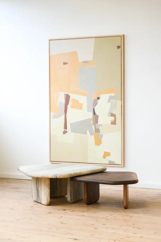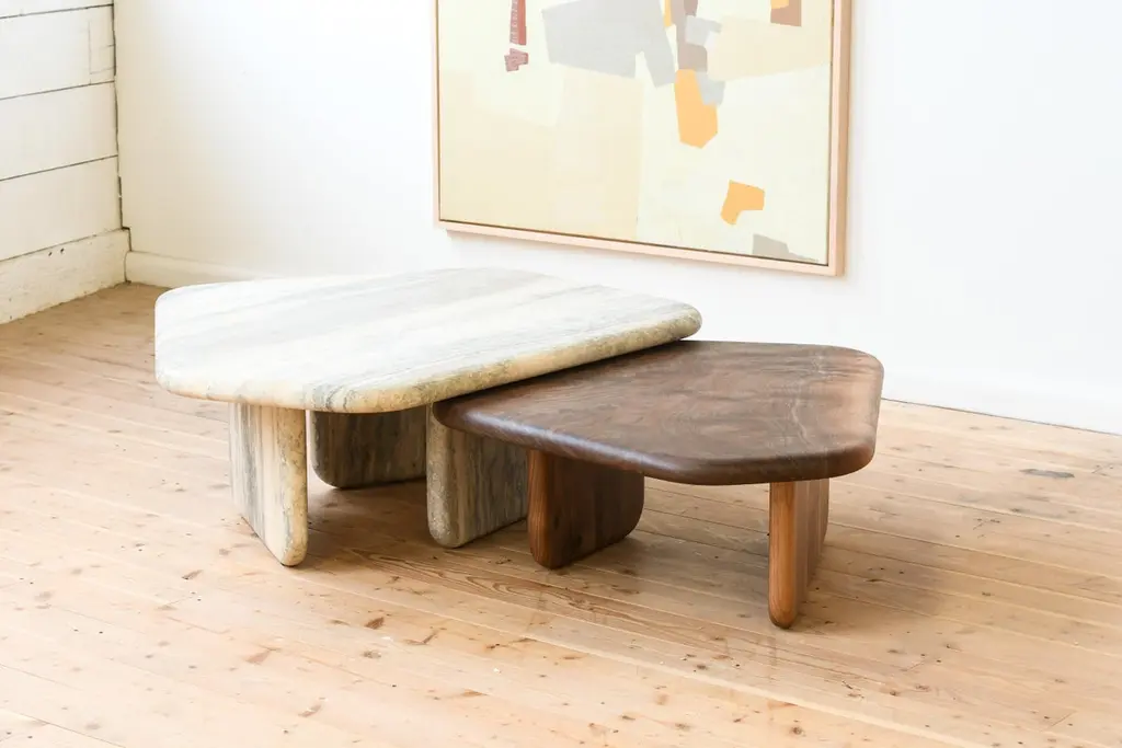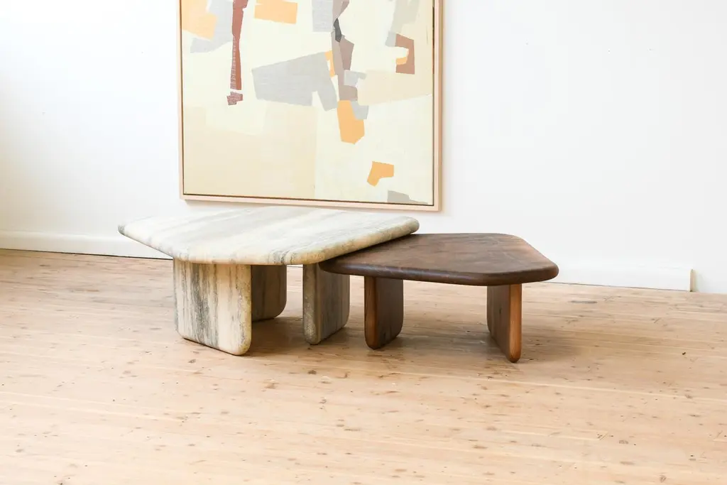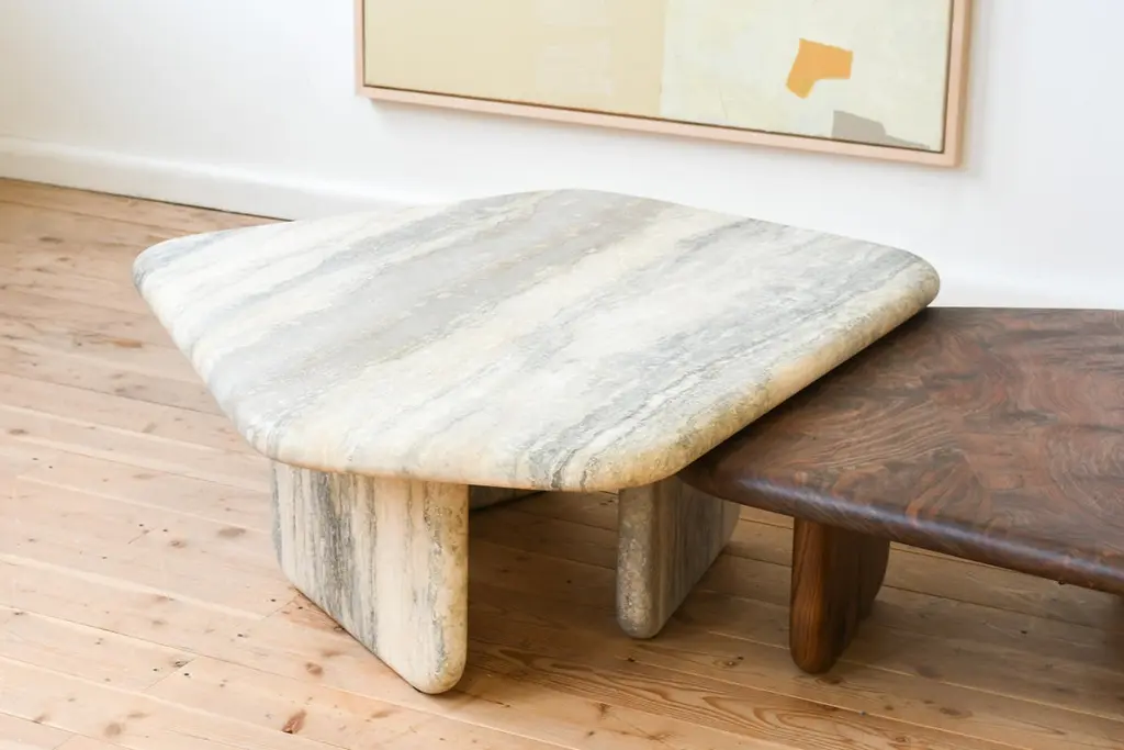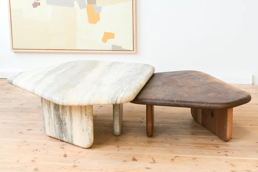 Dolmen Table Pair In Silver Travertine And Claro Walnut By Jeff Martin Joinery
