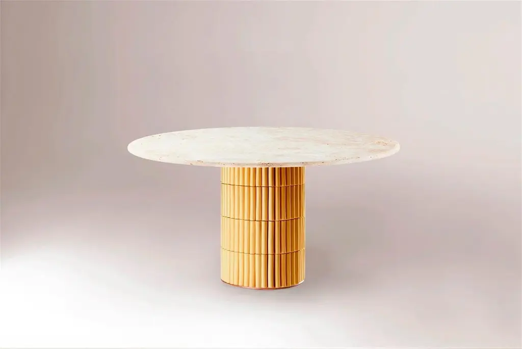 Nouvelle Vague Dinner TableYellow Glossy TilesPowder Matte Lacquered WoodTop in TravertineExceptional in its craftwork, Nouvelle Vague is a dinner table that rejects traditional conventions in favor of experimentation. Round ceramic handmade pieces, painted in a unique craquele glaze are placed around a lacquered center top, creating a sense of movement that evokes the motion of the waves.Our Nouvelle Vague collection is crafted using Portuguese handmade tiles, each tile is made with love in Portugal, using traditional techniques resulting in truly unique pieces. Each piece can vary in size up to 0.5mm, colors might vary slightly, and spacing between tiles may not always be the same. This is not a defect but a characteristics of a handmade productFor sales with delivery address within European territories, VAT will be charged additionally to the stated price.