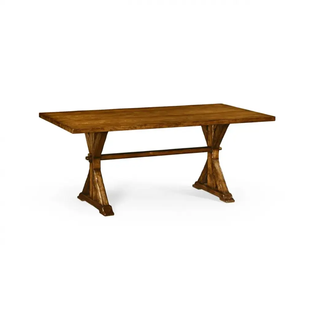 Custom table with simple straight leg trestle in walnut with a 2 inch built up thick top. Can be made in any size, in a variety of woods, finishes and distress. As shown in dark walnut with very heavy distress and hand planing. Made in Los Angeles by Dos Gallos Studio.PRICES ARE SUBJECT TO CHANGE. PLEASE INQUIRE BEFORE PLACING AN ORDER. CUSTOM ORDERS ARE NON RETURNABLE. FINAL SALE