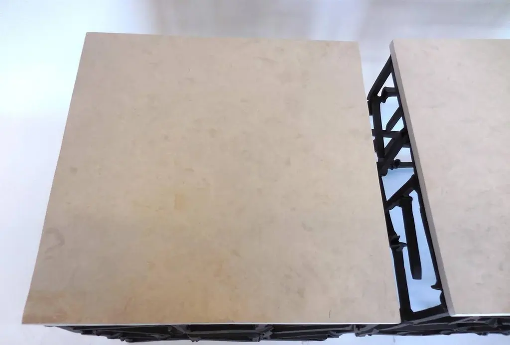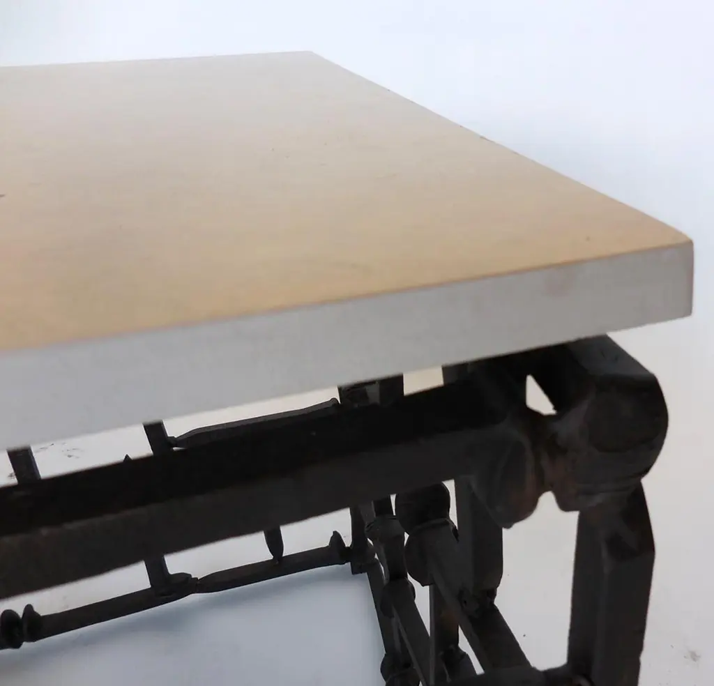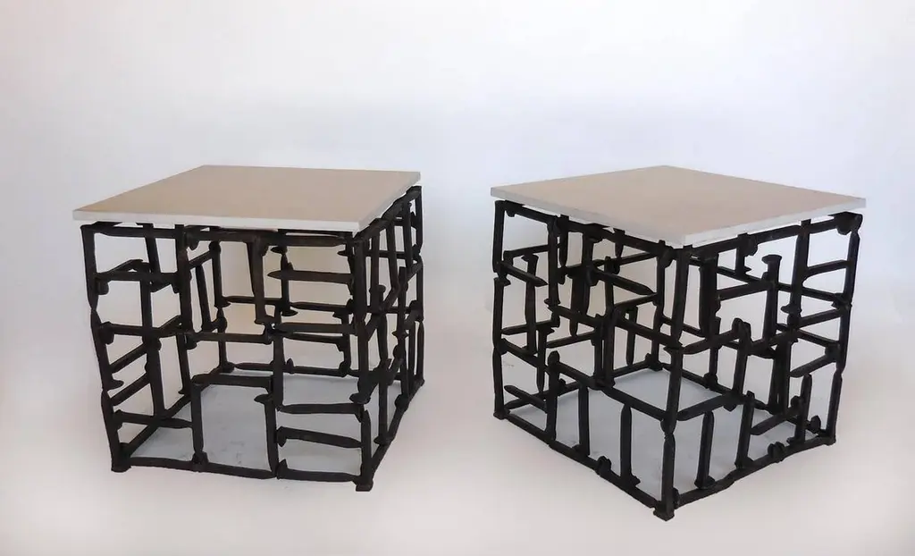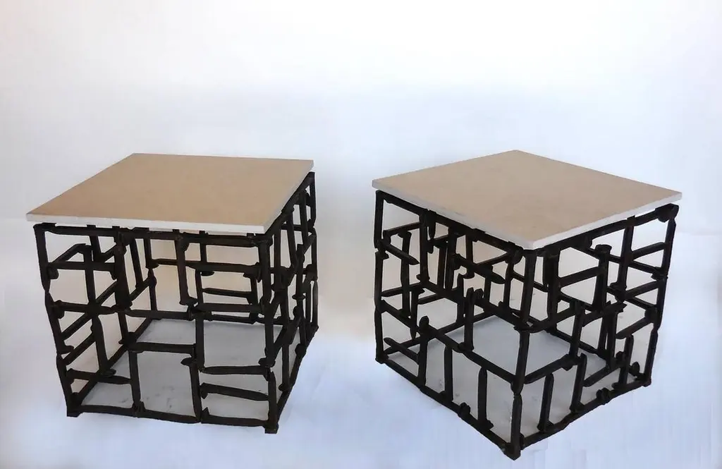 Antique rail road spikes/nails welded in a random pattern with hand-cut limestone tops. Can be made in custom sizes. Dos Gallos studio piece. Made in Los Angeles.