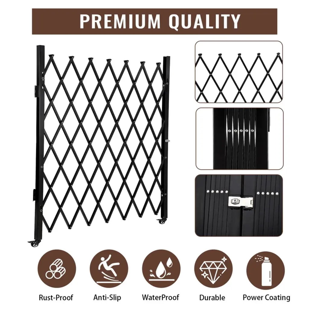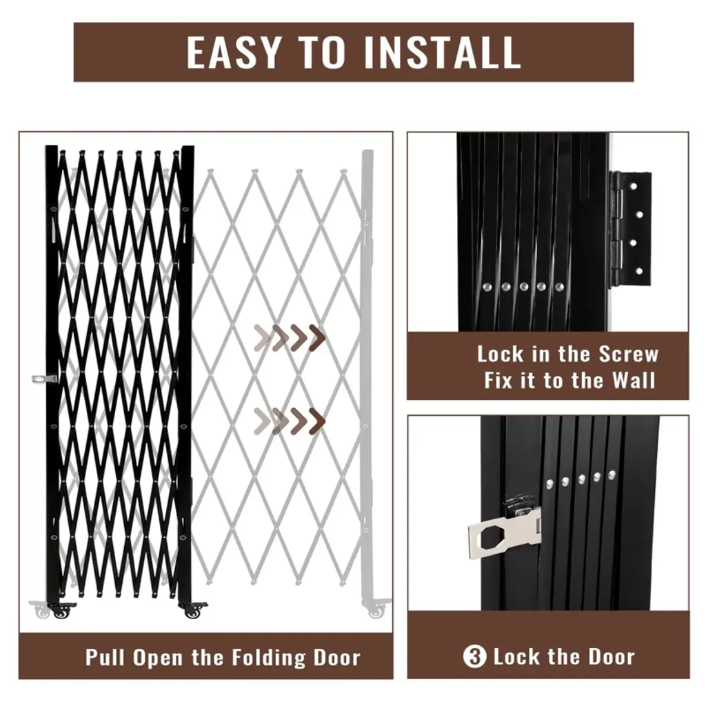 Garvee Double Folding Security Door Portable, Flexible, Expandable Steel Accordion Security Gate with 360~ Rolling Wheels Ideal for Courtyards, Garages, GardensProduct Description:Enhance the security of your home or business with the Garvee Double Folding Security Door. Designed for durability and ease of use, this expandable accordion-style security gate is crafted from high-quality alloy steel, ensuring superior strength and protection against unauthorized access. Whether used for courtyards, garages, gardens, warehouses, storefronts, or industrial spaces, this gate provides a reliable security solution while maintaining a compact, space-saving design.Product Specifications:Brand: GarveeMaterial: Heavy-duty Alloy SteelColor: BlackMounting Type: Wall MountDesign: Double Folding, Expandable Accordion StyleMobility: 360~ Rolling Wheels for Smooth MovementLocking System: Secure Easy Lock MechanismApplication: Courtyards, Garages, Gardens, Storefronts, Warehouses, Driveways, Industrial & Commercial SpacesWith its robust construction, expandable design, and smooth mobility, the Garvee Double Folding Security Door is an excellent security solution for both homes and businesses. Ensure peace of mind with this sturdy and versatile security gate, offering the perfect balance of protection, convenience, and durability.