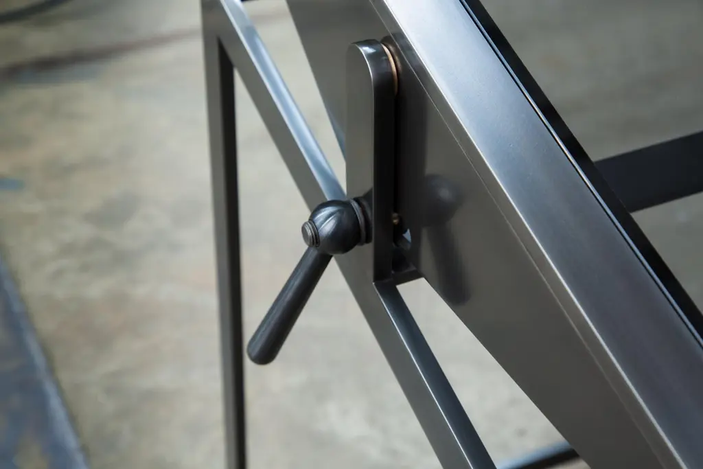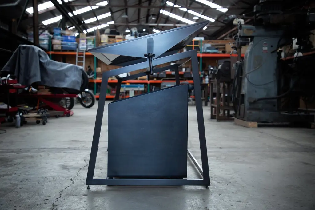 Designed and made-to-order in our Seattle studio with artists, architects, drafters, designers and creatives in mind, the Drafting Table and Utility Cart duo is modern, minimal and sleek. It features a satin black oxide steel framework with a tempered gray glass inlay (materials and finishes are customizable).The flush, uninterrupted work surface of the Drafting Table pivots between 0 and 40 degrees to eliminate ergonomic interference for a more versatile way of working. Both clamping levers are easily accessed with an ergonomic feel for quick-change operation, featuring subtle bronze hardware accents. The silhouette of the legs imitates the work surface when expressed in its pivot position for minimal, geometric line-work that lends to a contemporary, minimal feel. The body has an open style for the option of storing a matching Rolling Utility Cart (see storefront). This Drafting Table is best paired with a counter-height seat, adjustable seat or from the standing position.The accompanying Utility Cart is finely constructed and finished to compliment the Drafting Table. It features an open top with three levels of shelving and one removable divider that sits within the top shelf. The cart moves easily with non-marking, low profile castors. Satin black hot rolled steel contains distinct heat signatures that that make each cart unique. The Rolling Utility Cart has an industrial, yet refined architectural feel.The Drafting Table and Utility Cart duo is designed to optimize function without compromising style. The dimensions, materials and finishes of this piece are fully customizable.