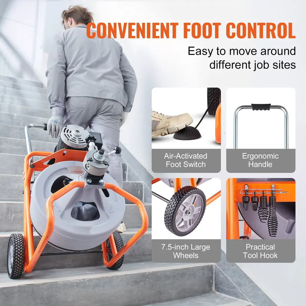 Attack Stubborn Clogs: VEVOR drain cleaner machine features an automatic feed control system to power the cable in and out of drainage pipes. Enhanced with forward/reverse control and air-activated foot switch, managing the cable becomes more effortless Premium Steel Core Cable: Our 100 FT x 1/2" / 75 FT x 1/2" / 100 FT x 3/8" / 75 FT x 3/8" / 50 FT x 3/8" steel core cable boasts superior resistance to breakage, twisting, and corrosion. It smoothly navigates through complex curved pipes ranging from 2 to 4 inches, ensuring reliable performance in tough jobsInterchangeable Cutters: The electric drain auger features 8 quick-change cutters / 4 quick-change cutters(50FT x 3/8 Inch option), perfect for clearing blockages in pipes, floor drains, sinks, and toilets. Simplify trouble maintenance and eliminate bad smell—ideal for home, properties, and restaurant Portable and Space-Saving: Take it anywhere, store it with ease! This drain cleaning machine is equipped with 7.5-in wheels / 8-in wheels, enabling effortless movement. The foldable / retractable handle provides a comfortable grip, while making it convenient to store when not in use Durable and Secure: Our sewer drain auger features a semi-enclosed plastic drum that is durable, rust-resistant, and allows easy observation of cable length. It also includes a GFCI switch to prevent electric shock and tool hooks for cutters storage Package Content(other options) 8 x Cutters 2 x M6 Hex Screws 1 x Wheel Axle 2 x M10 Lock Nuts 2 x ∅10 Washers 2 x Wheels 100 FT x 1/2" with 8-in wheels and 100FT x 3/8 Inch with 8-in wheels option Package Content 1 x Pair of Gloves 8 x Cutters 1 x Hex Wrench 2 x Drain Cleaner Sticks 2 x Hex Screws 1 x Washer 1 x User Manual 50 FT x 3/8" option Package Content 1 x Pair of Gloves 4 x Cutters 1 x Hex Wrench 2 x Drain Cleaner Sticks 1 x Hex Screw 1 x Washer 1 x User Manual