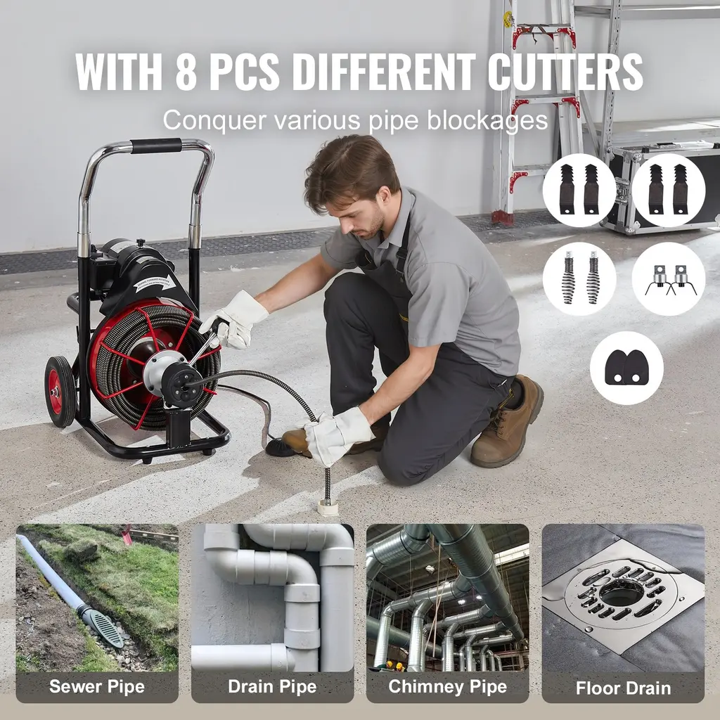 Attack Stubborn Clogs: VEVOR drain cleaner machine features an automatic feed control system to power the cable in and out of drainage pipes. Enhanced with forward/reverse control and air-activated foot switch, managing the cable becomes more effortless Premium Steel Core Cable: Our 100 FT x 1/2" / 75 FT x 1/2" / 100 FT x 3/8" / 75 FT x 3/8" / 50 FT x 3/8" steel core cable boasts superior resistance to breakage, twisting, and corrosion. It smoothly navigates through complex curved pipes ranging from 2 to 4 inches, ensuring reliable performance in tough jobsInterchangeable Cutters: The electric drain auger features 8 quick-change cutters / 4 quick-change cutters(50FT x 3/8 Inch option), perfect for clearing blockages in pipes, floor drains, sinks, and toilets. Simplify trouble maintenance and eliminate bad smell—ideal for home, properties, and restaurant Portable and Space-Saving: Take it anywhere, store it with ease! This drain cleaning machine is equipped with 7.5-in wheels / 8-in wheels, enabling effortless movement. The foldable / retractable handle provides a comfortable grip, while making it convenient to store when not in use Durable and Secure: Our sewer drain auger features a semi-enclosed plastic drum that is durable, rust-resistant, and allows easy observation of cable length. It also includes a GFCI switch to prevent electric shock and tool hooks for cutters storage Package Content(other options) 8 x Cutters 2 x M6 Hex Screws 1 x Wheel Axle 2 x M10 Lock Nuts 2 x ∅10 Washers 2 x Wheels 100 FT x 1/2" with 8-in wheels and 100FT x 3/8 Inch with 8-in wheels option Package Content 1 x Pair of Gloves 8 x Cutters 1 x Hex Wrench 2 x Drain Cleaner Sticks 2 x Hex Screws 1 x Washer 1 x User Manual 50 FT x 3/8" option Package Content 1 x Pair of Gloves 4 x Cutters 1 x Hex Wrench 2 x Drain Cleaner Sticks 1 x Hex Screw 1 x Washer 1 x User Manual