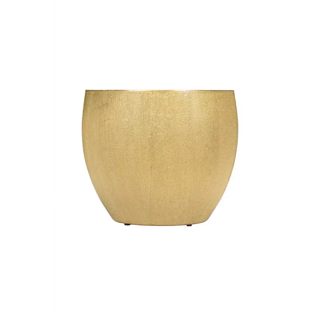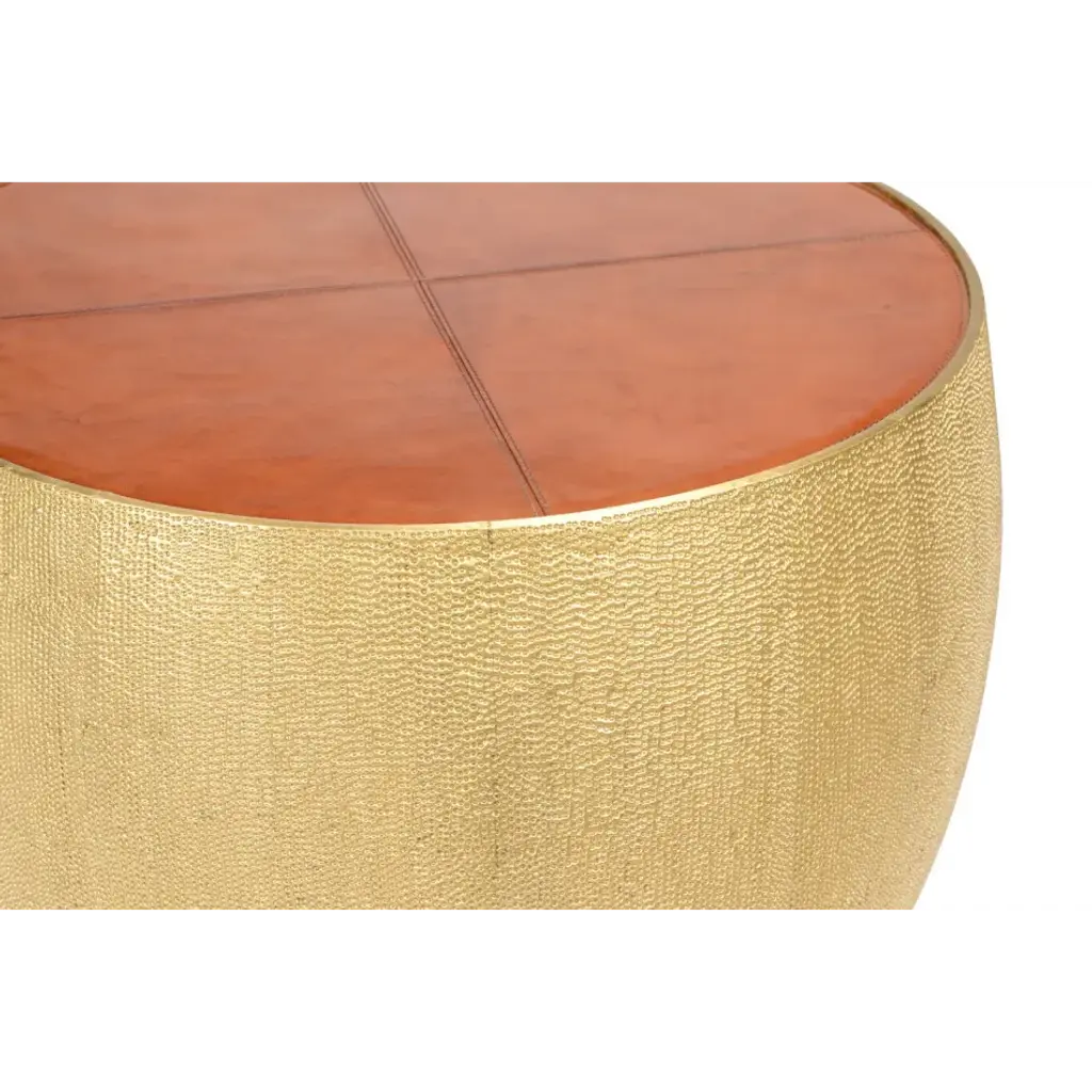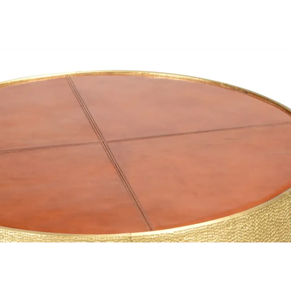 A STUNNING STATEMENT PIECE! THIS DRUM TABLE IS CRAFTED FROM BEAUTIFULLY TEXTURED HAMMERED BRASS WITH A LUXURIOUS LEATHER TOP. USE ALONE OR IN A PAIR FOR AN EVEN GREATER VISUAL EFFECT.