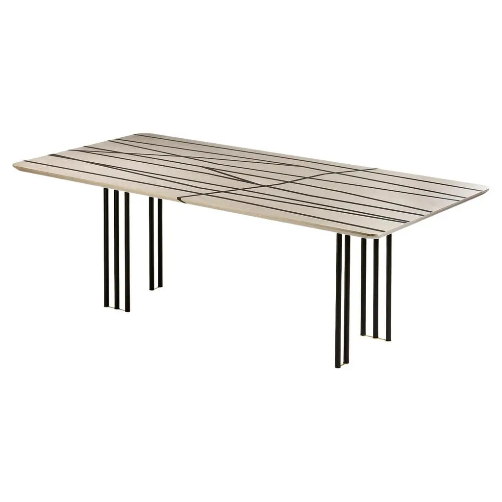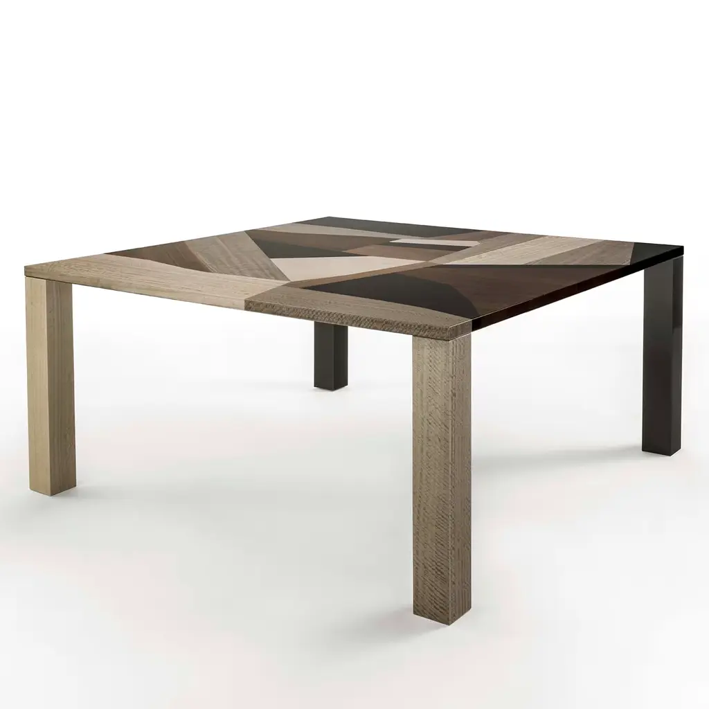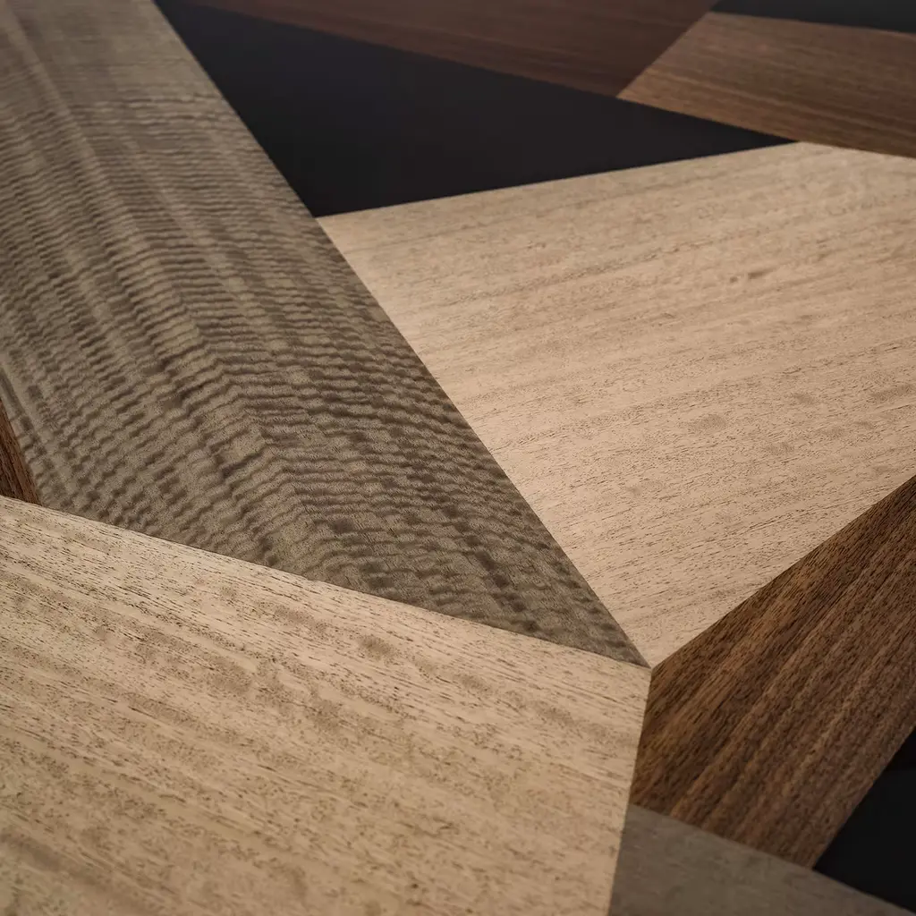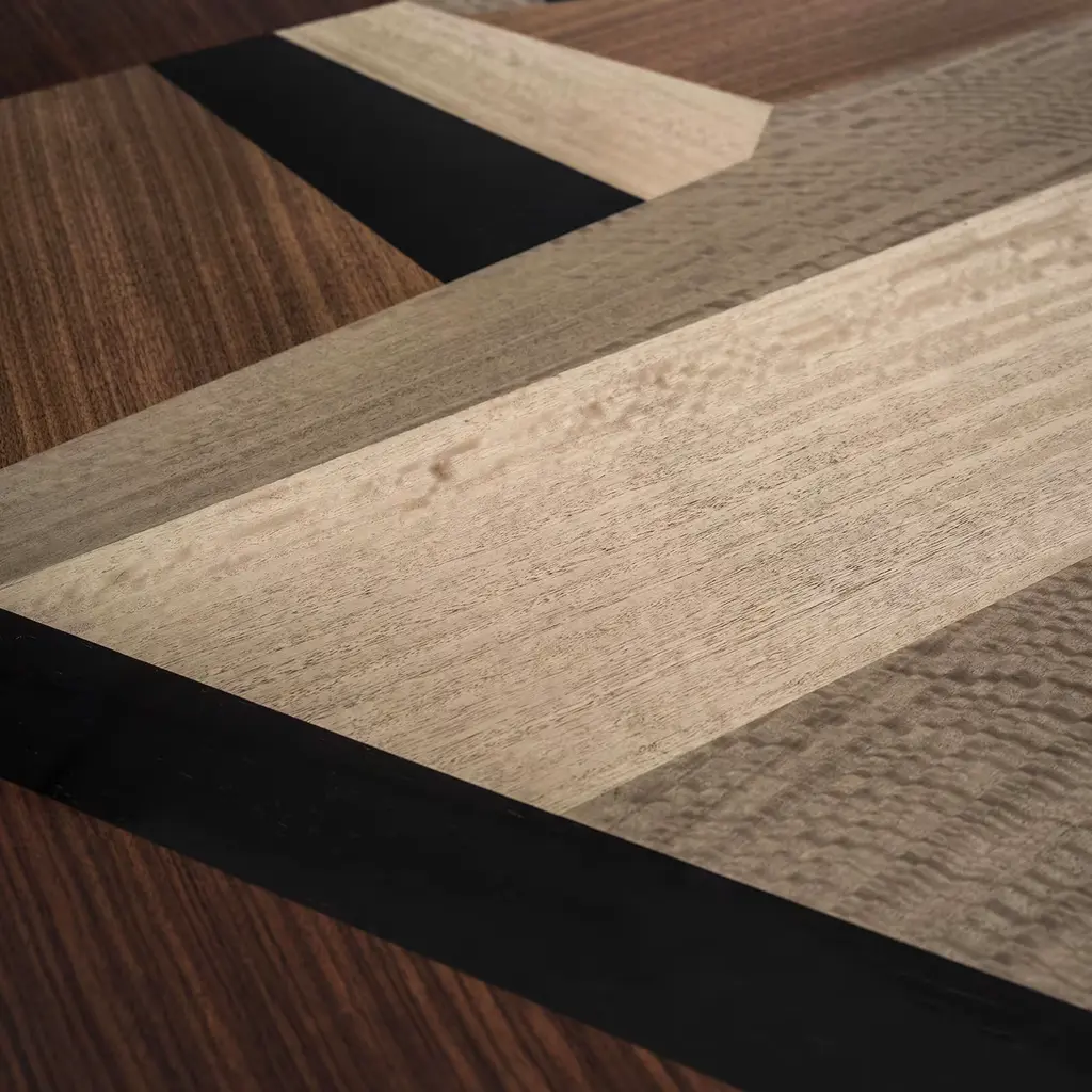 The Dry table has been crafted using various types of wood inlays appearing on the top, edge and legs. An abstract geometric pattern of varying wood tones within a simple shape, in which nature and craftsmanship form the perfect union. With its unique charm, this table will be a striking addition to your modern or classic home.