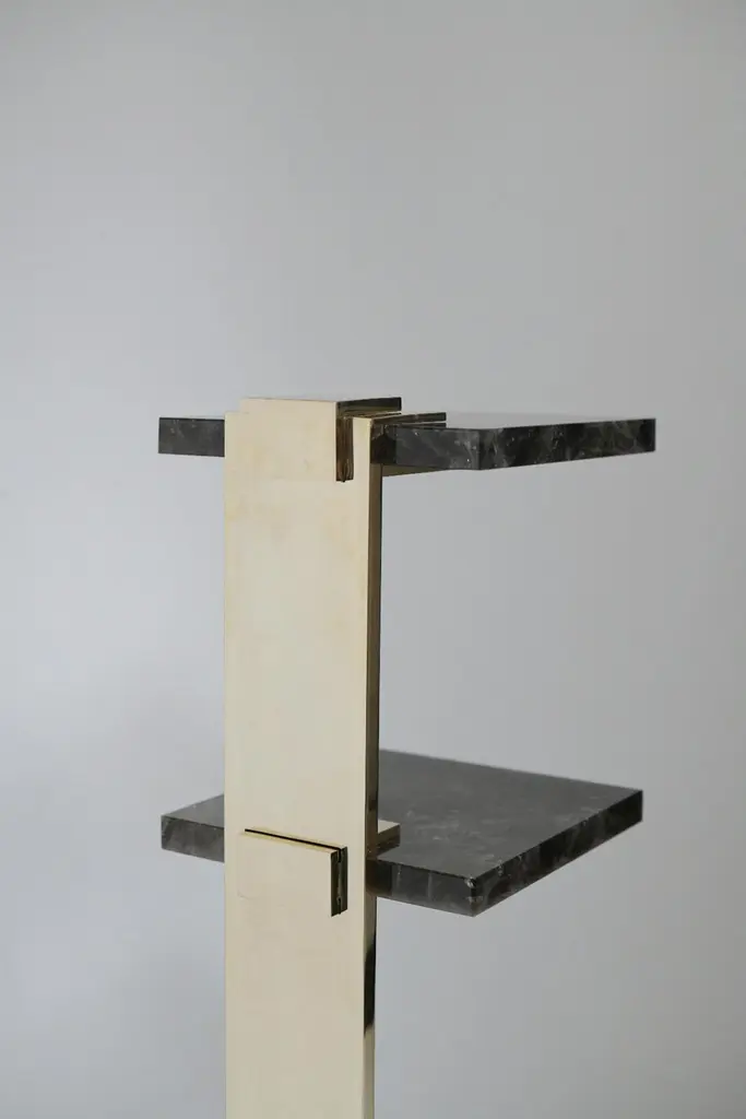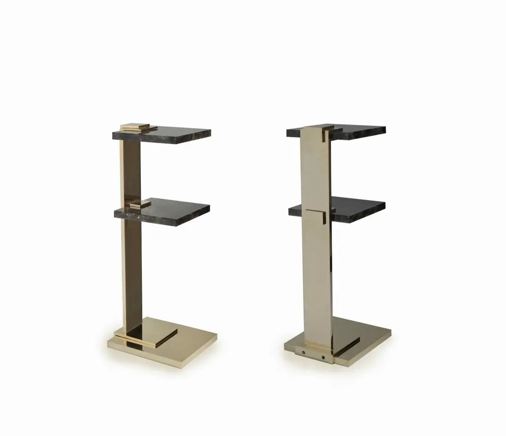 Pair of DSD rock crystal drinking tables with two smoky rock crystal shelves.Polish brass finish. Created by Phoenix Gallery.Custom size upon request.