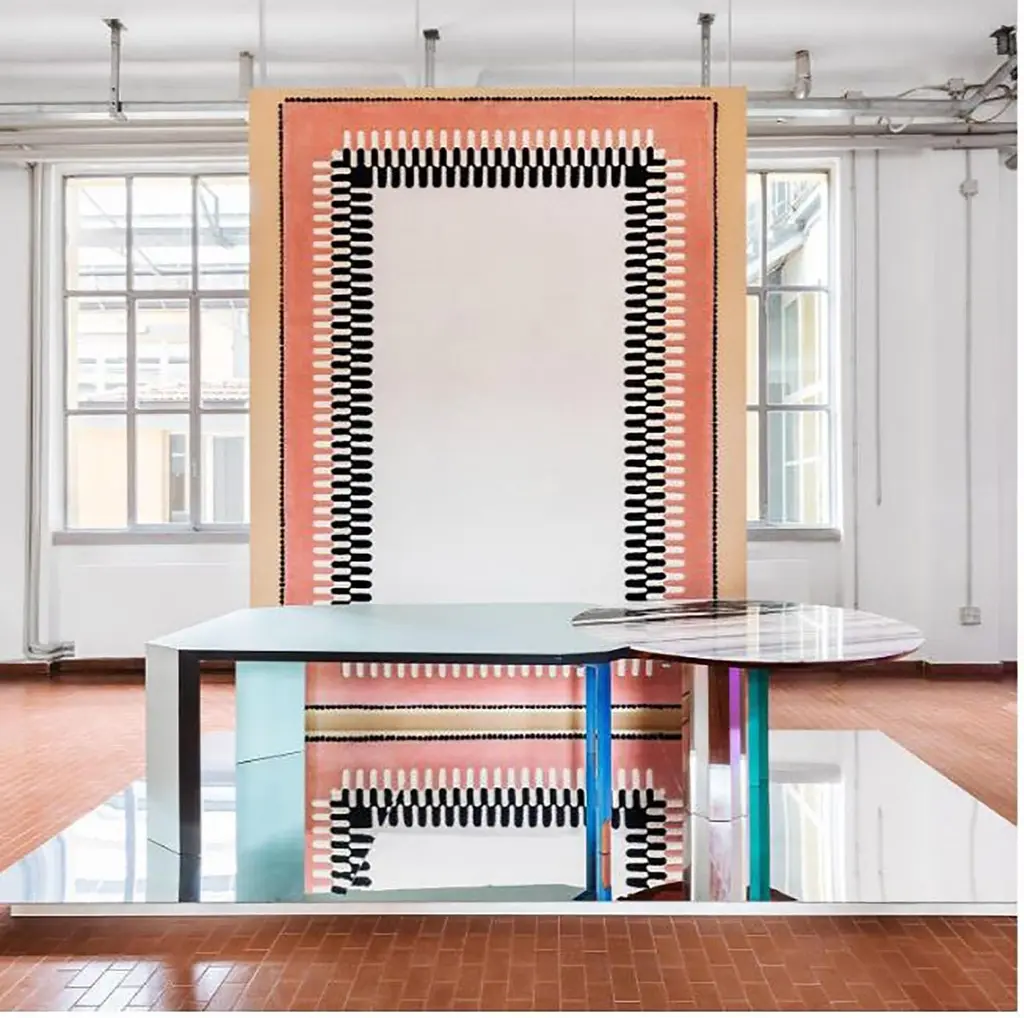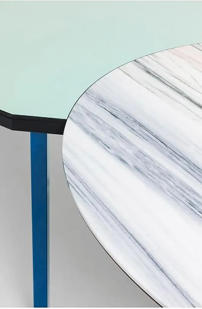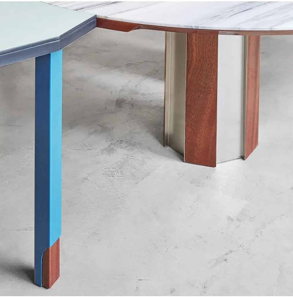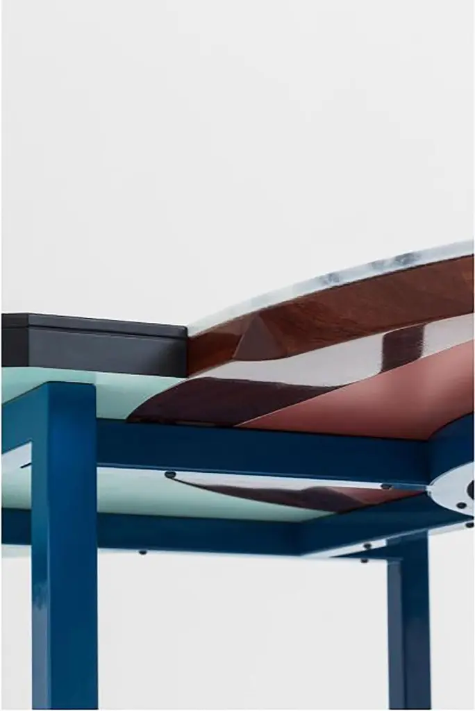 Duale table is in fact two tables in one: the round top is in Lasa white marble, taken from Croda di Jenn quarries at 1500 meters above sea level, the rectangular top (cm 128 x 186) is made laminate. The huge support structure consists of an eclectic combination of red glossy mahogany, stainless steel, painted iron and MDF. Customizable choice of marble and laminate color ways. Sem Futuraforma contemporarily collection expresses a desire to play with different codes and languages by combining artisan workmanship with the use of Industrial materials. This sophisticated divertissement makes reference to the Turin school of interior design, with figures such as Toni Cordero architect or Prando and Rosso.