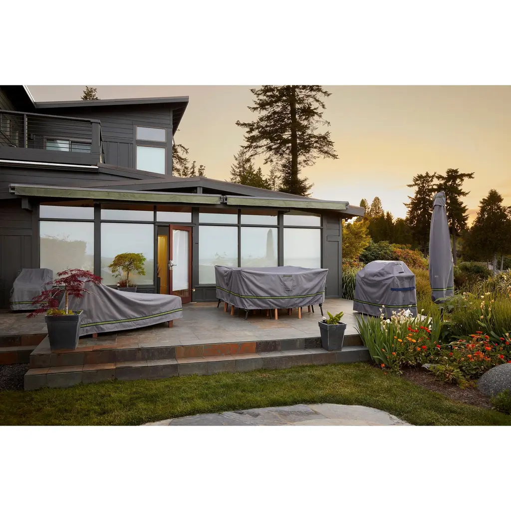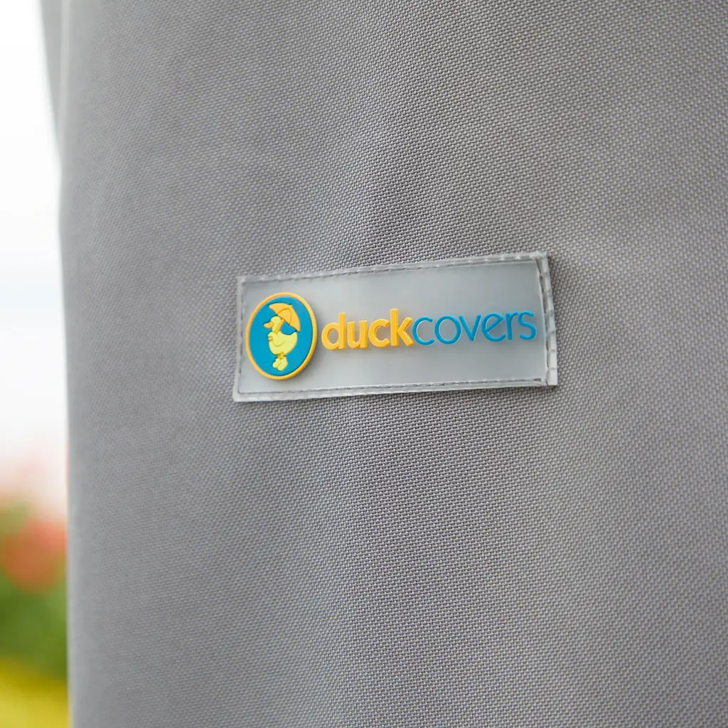 Ideal for use in harsh weather and high wind conditions. Duck Covers Soteria Series patio furniture covers are designed to protect patio furniture from dust, dirt, sun, rain and heavy snow. Manufactured using a durable fabric with a waterproof backing features a sporty webbed accent. Tape sealing at critical seams prevents leaking and double-stitched seams provide extra durability. Grey color. Two-year limited warranty has you covered. Migrate to Duck Covers today!
