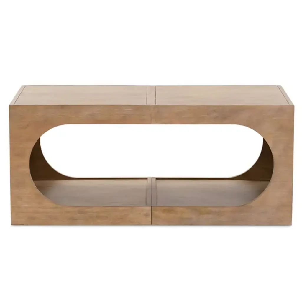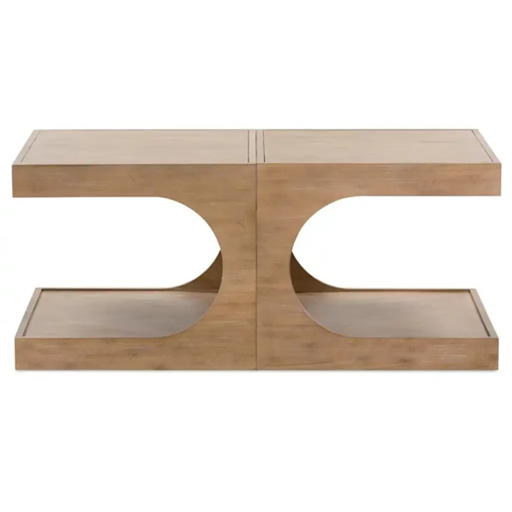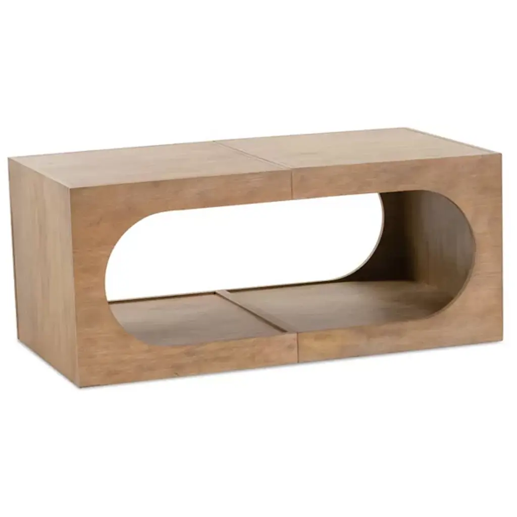 The Dune Cocktail Table from Rowe Furniture makes a statement with its dramatic C-shaped cutout design. Its engineered form creates negative space that doubles as a natural display nook. The solid wood construction ensures stability while the continuous lines flow seamlessly from top to bottom, creating a sense of movement. Each curve of this table serves both an aesthetic and practical purpose, offering built-in storage spaces that can house magazines, books, or decorative objects.