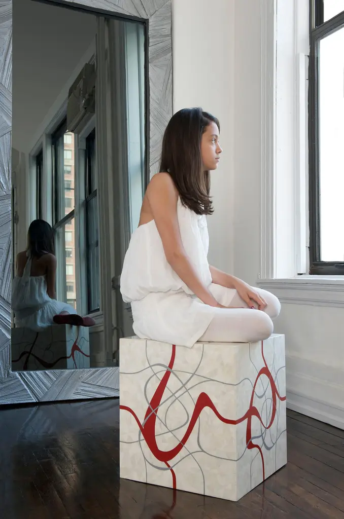 The white Dune cube table is made of hundreds of triangular camel bone chips tessellated over wood. The playful patterns made with grey and red resin are unique on each surface are parametric, but can tie out infinitely with others in arrangements or groups. The cube is cross functional from end able to a stool to a sculptural grouping.Size: 18" width x 1 8" length x 1 8" heightSize: 45.72 cm width x 145.72 cm length x 45.72 cm height.