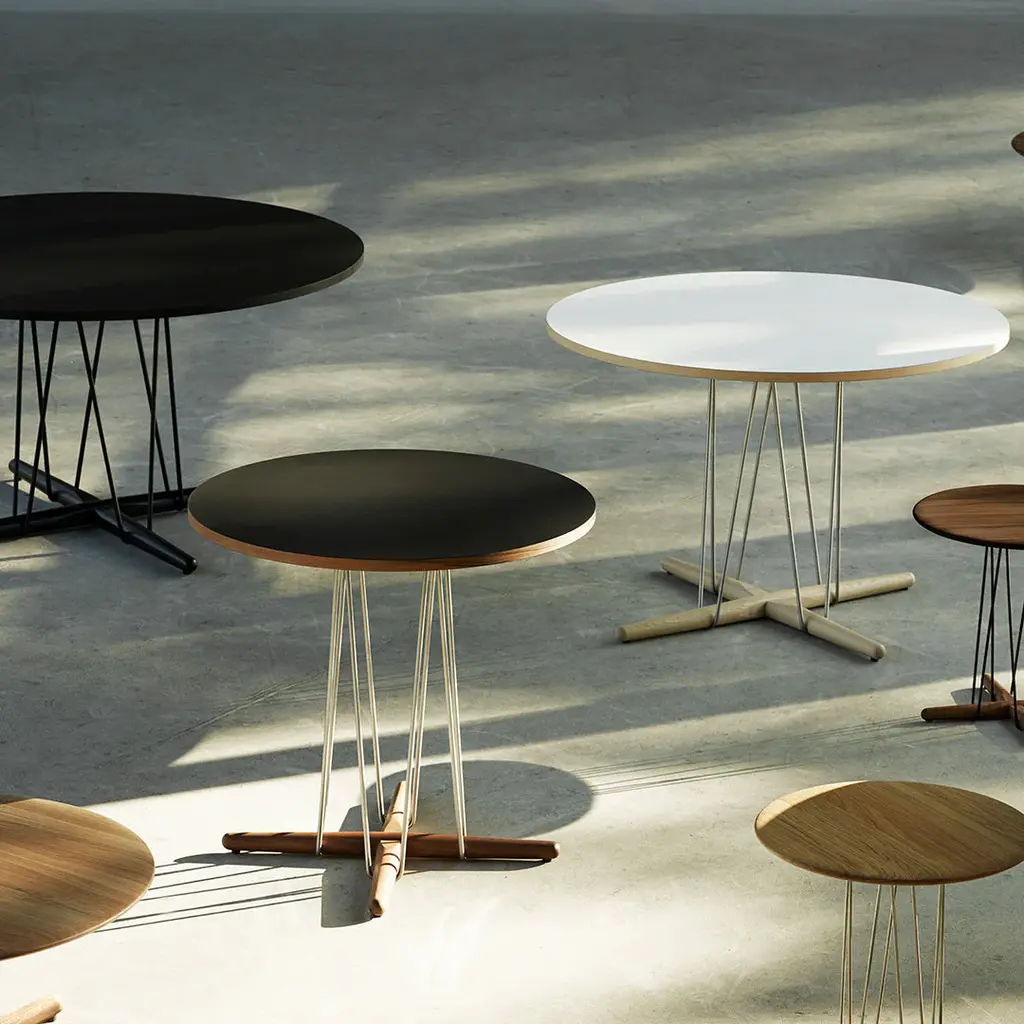 Designed by Austrian trio EOOS for Carl Hansen & Son, the Embrace Table E020 is a stylish reinterpretation of a furniture staple, created as part of the intelligent Embrace Series. Crafted from three components, the design has a wooden base, a steel wire structure and a round tabletop. The result is a distinctive, sculptural expression inspired by a kite blowing in the wind; with table legs that have been pulled to the center to maximize legroom, the piece provides optimal functionality. The tabletop is circular and designed to facilitate communication between people as the round shape and added legroom highlights social interaction. Contrasted by the lightness of the frame, the wooden tabletop seems to float on the stable frame and will merge seamlessly with the Embrace Chair and Embrace Armchair.