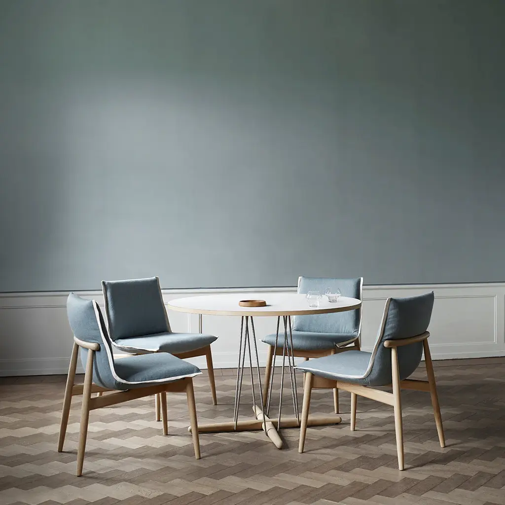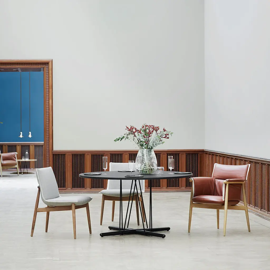 Designed by Austrian trio EOOS for Carl Hansen & Son, the Embrace Table E020 is a stylish reinterpretation of a furniture staple, created as part of the intelligent Embrace Series. Crafted from three components, the design has a wooden base, a steel wire structure and a round tabletop. The result is a distinctive, sculptural expression inspired by a kite blowing in the wind; with table legs that have been pulled to the center to maximize legroom, the piece provides optimal functionality. The tabletop is circular and designed to facilitate communication between people as the round shape and added legroom highlights social interaction. Contrasted by the lightness of the frame, the wooden tabletop seems to float on the stable frame and will merge seamlessly with the Embrace Chair and Embrace Armchair.