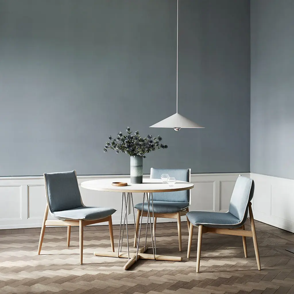 Designed by Austrian trio EOOS for Carl Hansen & Son, the Embrace Table E020 is a stylish reinterpretation of a furniture staple, created as part of the intelligent Embrace Series. Crafted from three components, the design has a wooden base, a steel wire structure and a round tabletop. The result is a distinctive, sculptural expression inspired by a kite blowing in the wind; with table legs that have been pulled to the center to maximize legroom, the piece provides optimal functionality. The tabletop is circular and designed to facilitate communication between people as the round shape and added legroom highlights social interaction. Contrasted by the lightness of the frame, the wooden tabletop seems to float on the stable frame and will merge seamlessly with the Embrace Chair and Embrace Armchair.