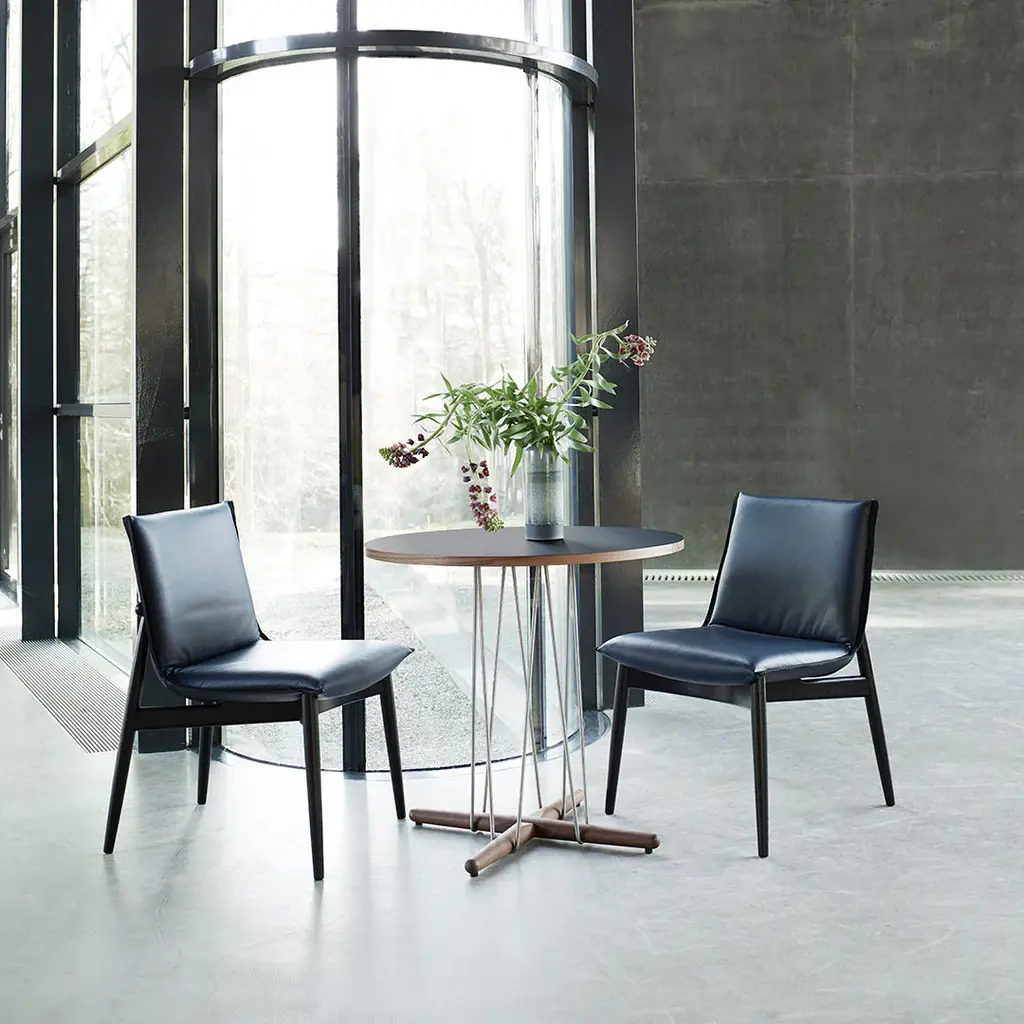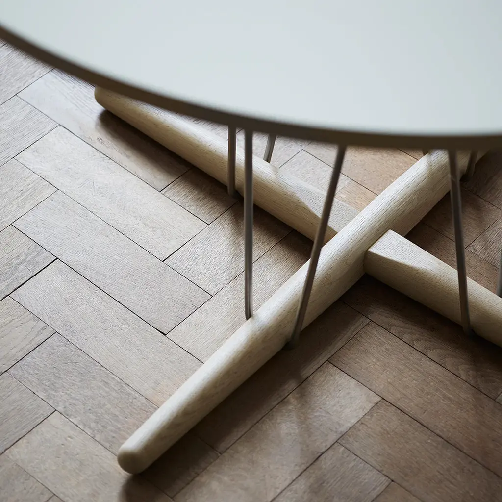 Designed by Austrian trio EOOS for Carl Hansen & Son, the Embrace Table E020 is a stylish reinterpretation of a furniture staple, created as part of the intelligent Embrace Series. Crafted from three components, the design has a wooden base, a steel wire structure and a round tabletop. The result is a distinctive, sculptural expression inspired by a kite blowing in the wind; with table legs that have been pulled to the center to maximize legroom, the piece provides optimal functionality. The tabletop is circular and designed to facilitate communication between people as the round shape and added legroom highlights social interaction. Contrasted by the lightness of the frame, the wooden tabletop seems to float on the stable frame and will merge seamlessly with the Embrace Chair and Embrace Armchair.