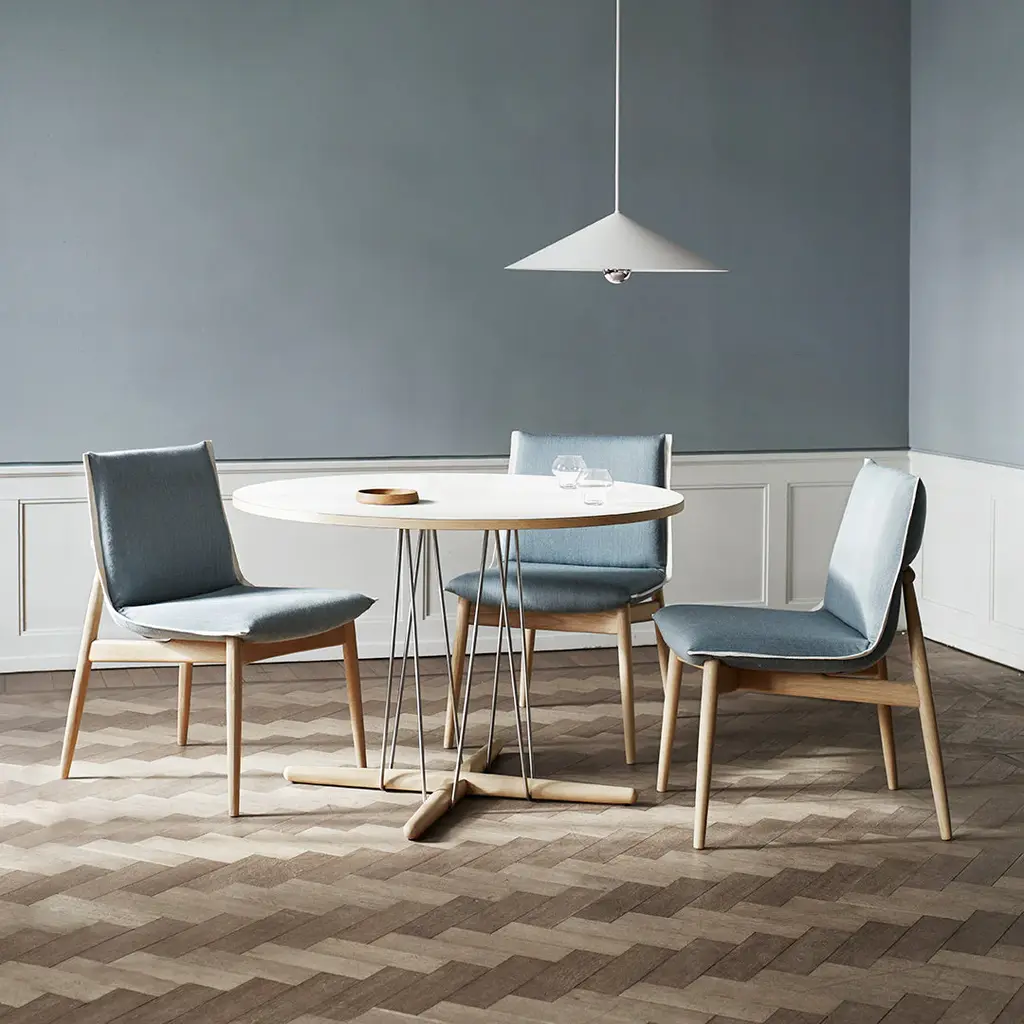 Designed by Austrian trio EOOS for Carl Hansen & Son, the Embrace Table E020 is a stylish reinterpretation of a furniture staple, created as part of the intelligent Embrace Series. Crafted from three components, the design has a wooden base, a steel wire structure and a round tabletop. The result is a distinctive, sculptural expression inspired by a kite blowing in the wind; with table legs that have been pulled to the center to maximize legroom, the piece provides optimal functionality. The tabletop is circular and designed to facilitate communication between people as the round shape and added legroom highlights social interaction. Contrasted by the lightness of the frame, the wooden tabletop seems to float on the stable frame and will merge seamlessly with the Embrace Chair and Embrace Armchair.