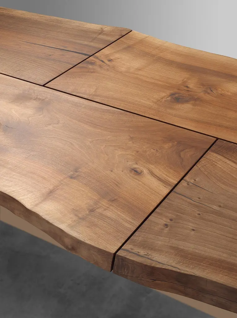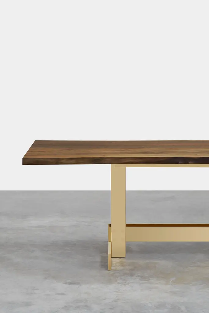 Crafted from an individually chosen, single European walnut trunk, the 4100 MM (161 3/8 INCH) long Trunk II table highlights the fusion of architecture and craftsmanship. Floating atop a sculptural solid brass base, the 50 MM (2 INCH) thick table top is made from four connecting offset planks which reveal the brushed natural edges of the tree trunk. Spanning various widths, measuring 1100 MM (43 1/4 INCH) at its widest, Trunk II is an inherently unique piece seating 10-12 people comfortably.Top: EUROPEAN WALNUT, WAXEDSUBSTRUCTURE:SOLID BRASS, POLISHED