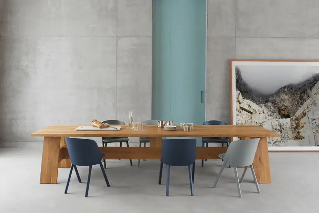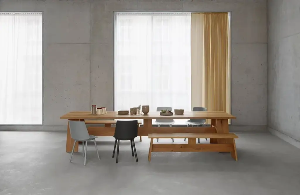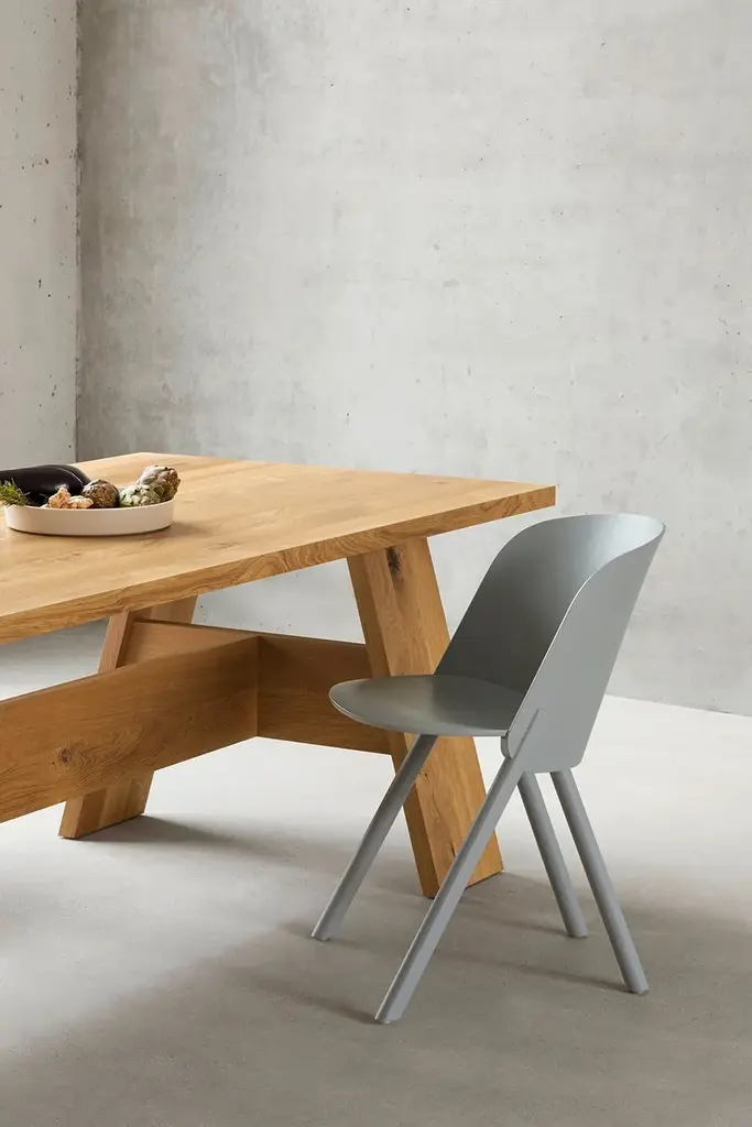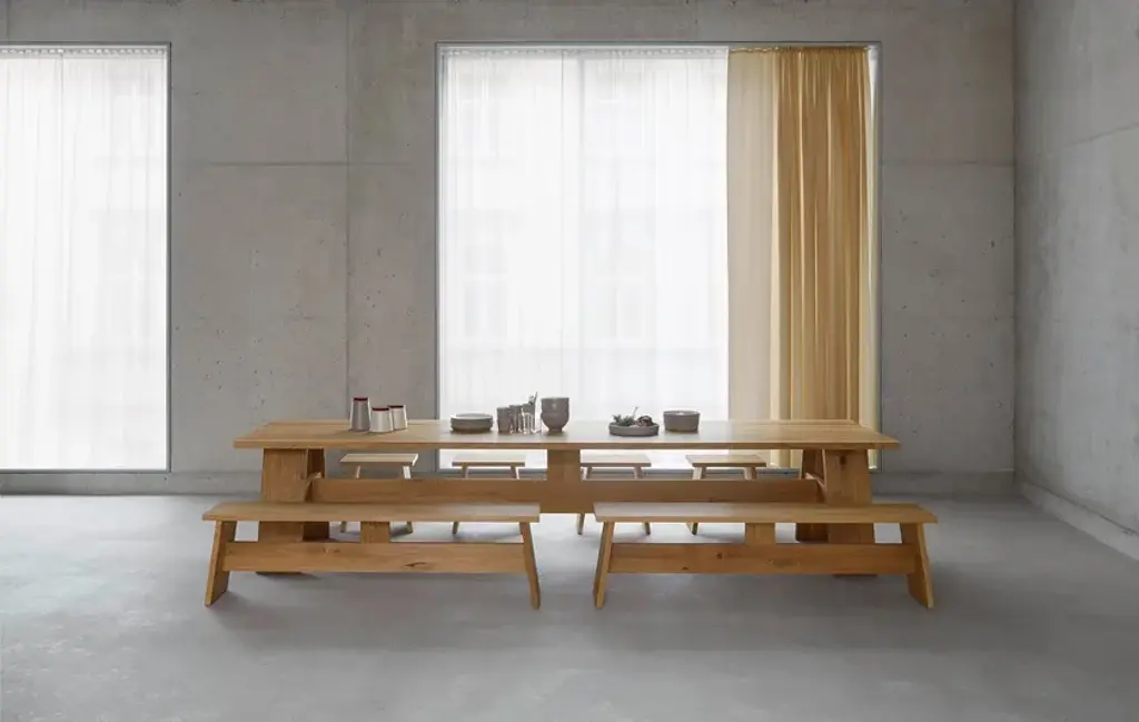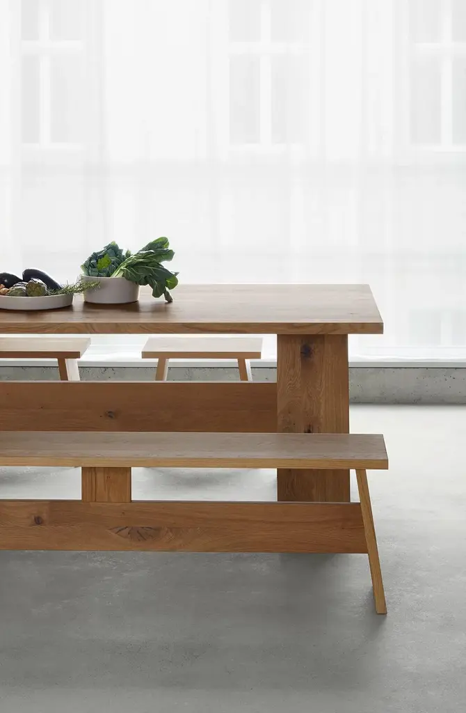 The solid wood table FAYLAND features the pure use of material and a clear, elegant design language. The constructive details of FAYLAND are at the centre of its linear form: a horizontal bar with centred support provides stability while the table ends overlap the frame, providing additional seating space.Finishing: Oiled oak