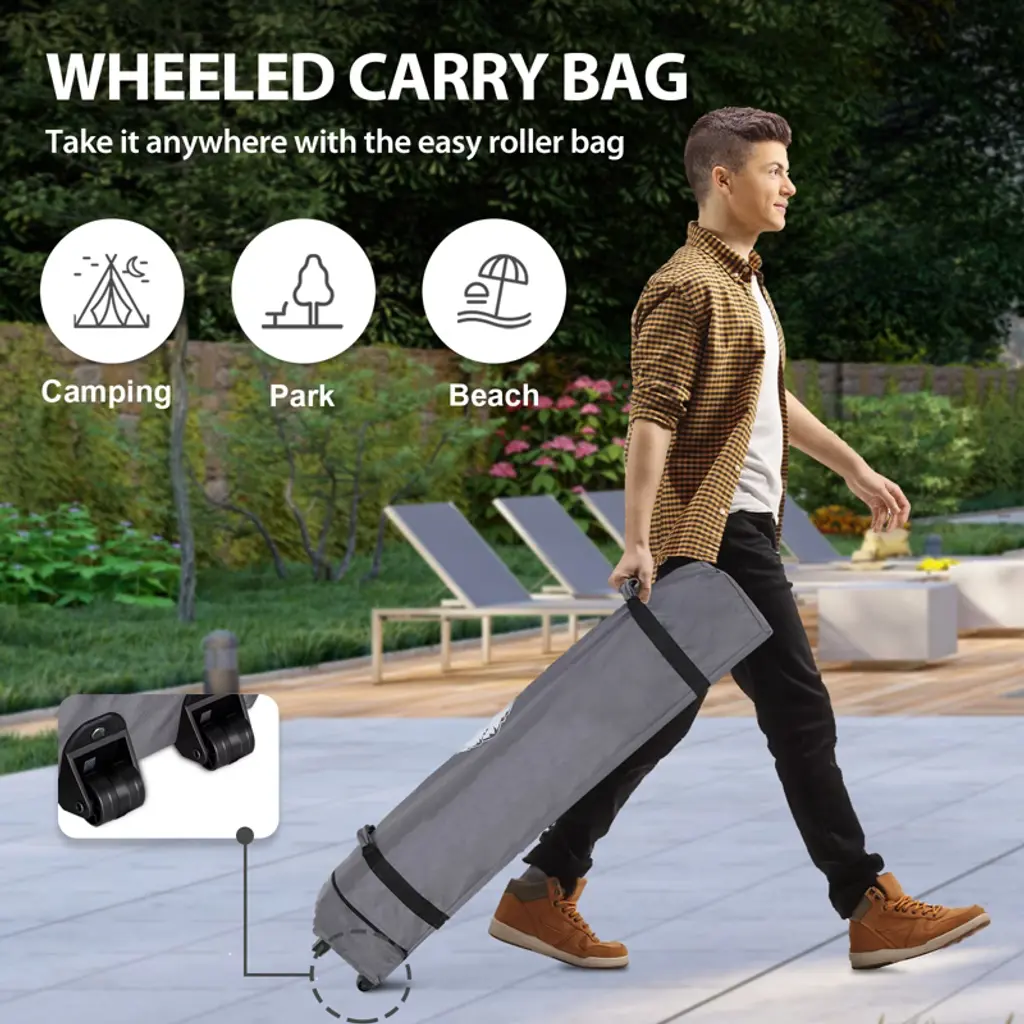 This pop up canopy features a 10'x10' frame with a top coverage area of 13' x 13', providing the maximum shade area. The extra awning can offer more shade space, giving you up to 169 square feet of shade area, making it perfect for gatherings of 6 to 8 people. It is an ideal choice for picnics, barbecues, camping, parties and other outdoor activities. This canopy has the patented center lock with easy setup. After folding, it measures only 51.96 inches, which is more compact than most 10x10 pop up canopy and can be easily placed in the trunk of your car along with your other equipment. The canopy includes one detachable sidewall that attaches to the top with long Velcro strips. The product comes with 4 additional weight bags. Tie one weight bag to each leg to increase stability and ensure safety, making your setup more secure. The inner side of each canopy has a silver coating that can block 99% of harmful UV rays. With our excellent UV protection, you can enjoy the outdoors comfortably and safely.