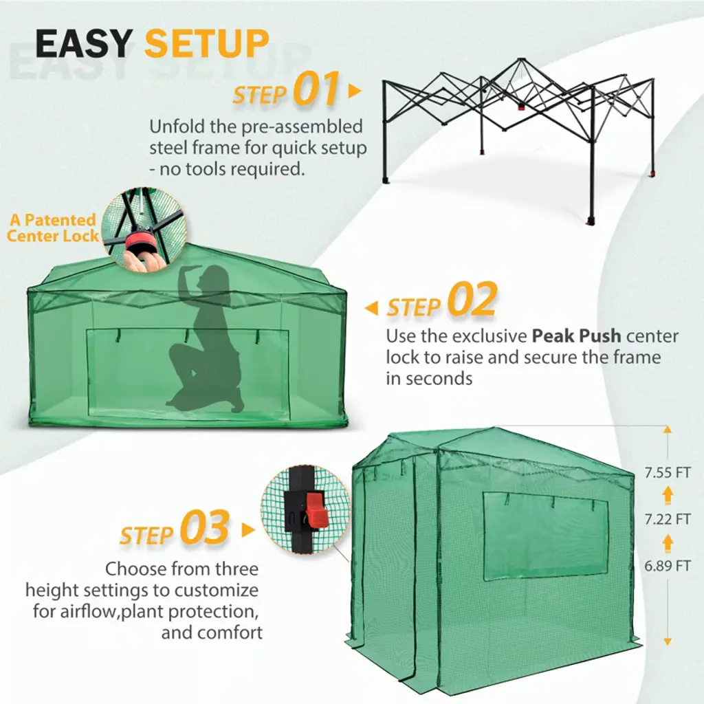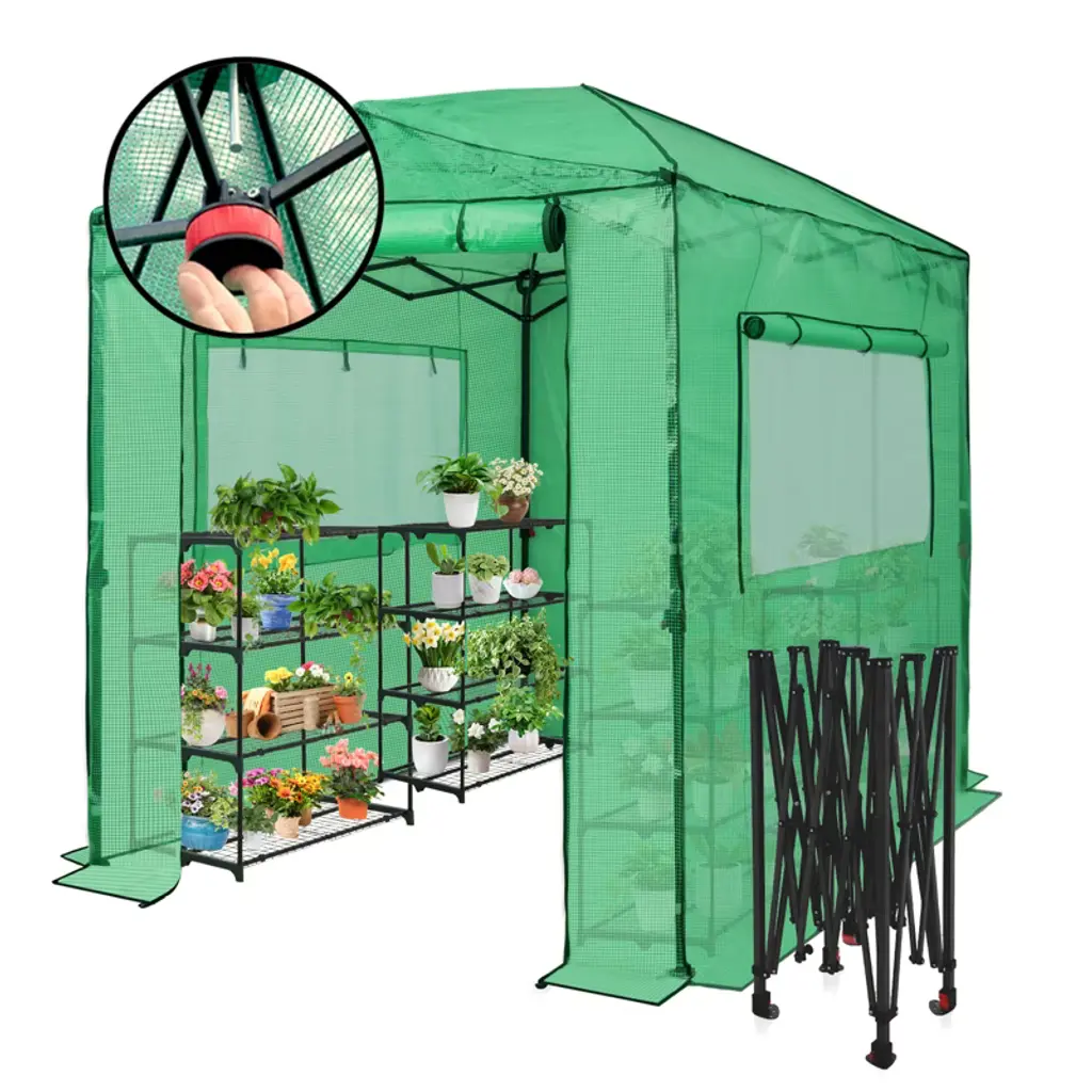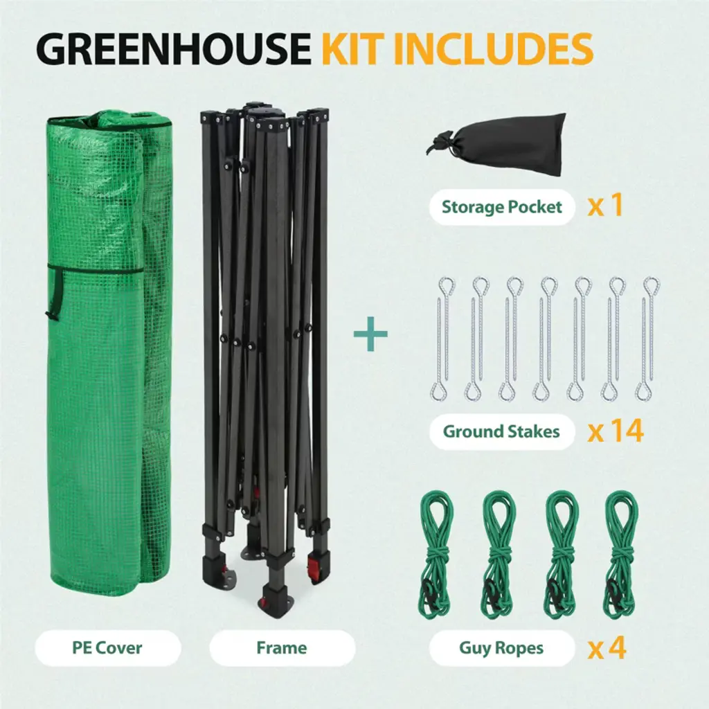 With innovative tech, you can set up the greenhouse all by yourself in no time. The EAGLE PEAK pop-up greenhouse is ready to go right out of the box—no tools or assembly needed because the frame is already pre-assembled for you. The steel roof makes it super durable and able to handle most outdoor weather. At just 35 lbs, its strong frame has more steel than most other 8x6 greenhouses, so it’s built to last. The 8x6 ft walk-in design gives you tons of space to move around comfortably. There’s plenty of room for shelving too (just search ASIN: B08ZJ8H558 for compatible shelves). It also comes with zippered roll-up doors and mesh windows for great ventilation. This greenhouse has a premium PE top cover that’s not only better for the environment but also protects your plants way better than cheaper PVC covers on other greenhouses.